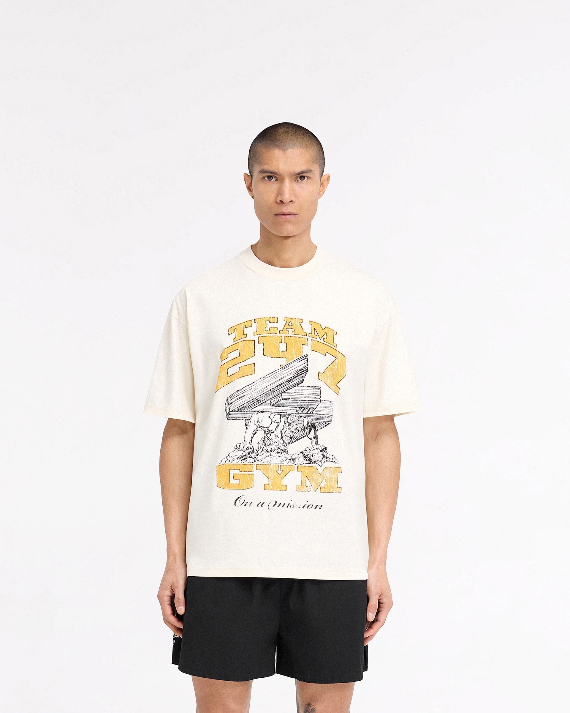 Introducing the 247 On His Shoulders T-Shirt in Antique White, crafted from a super soft hand feel jersey cotton, following our oversized mainline fit. The t-shirt has a ribbed collar, with a cracked ink 247 On His Shoulders graphic to the front and 247 logo to the back neck.