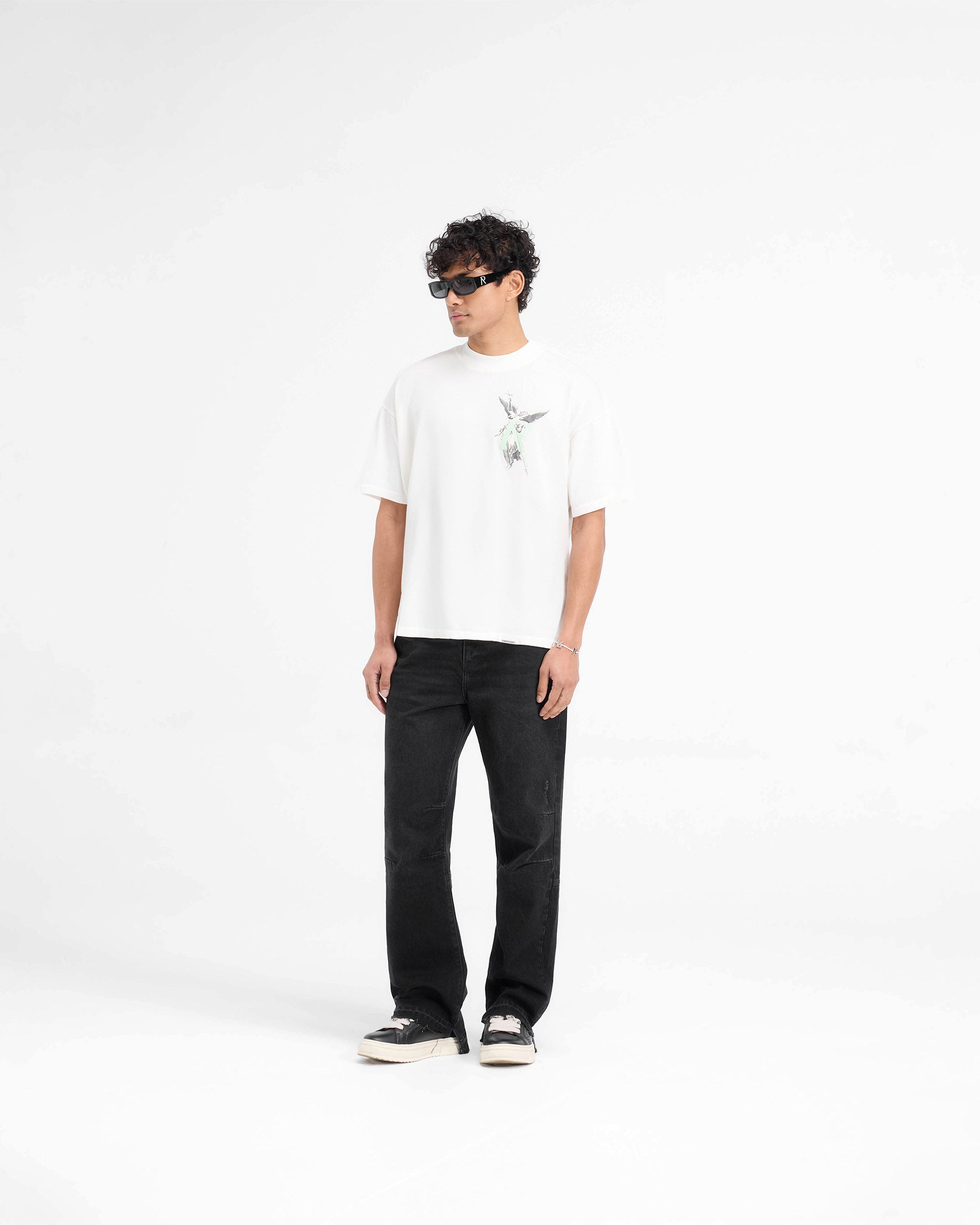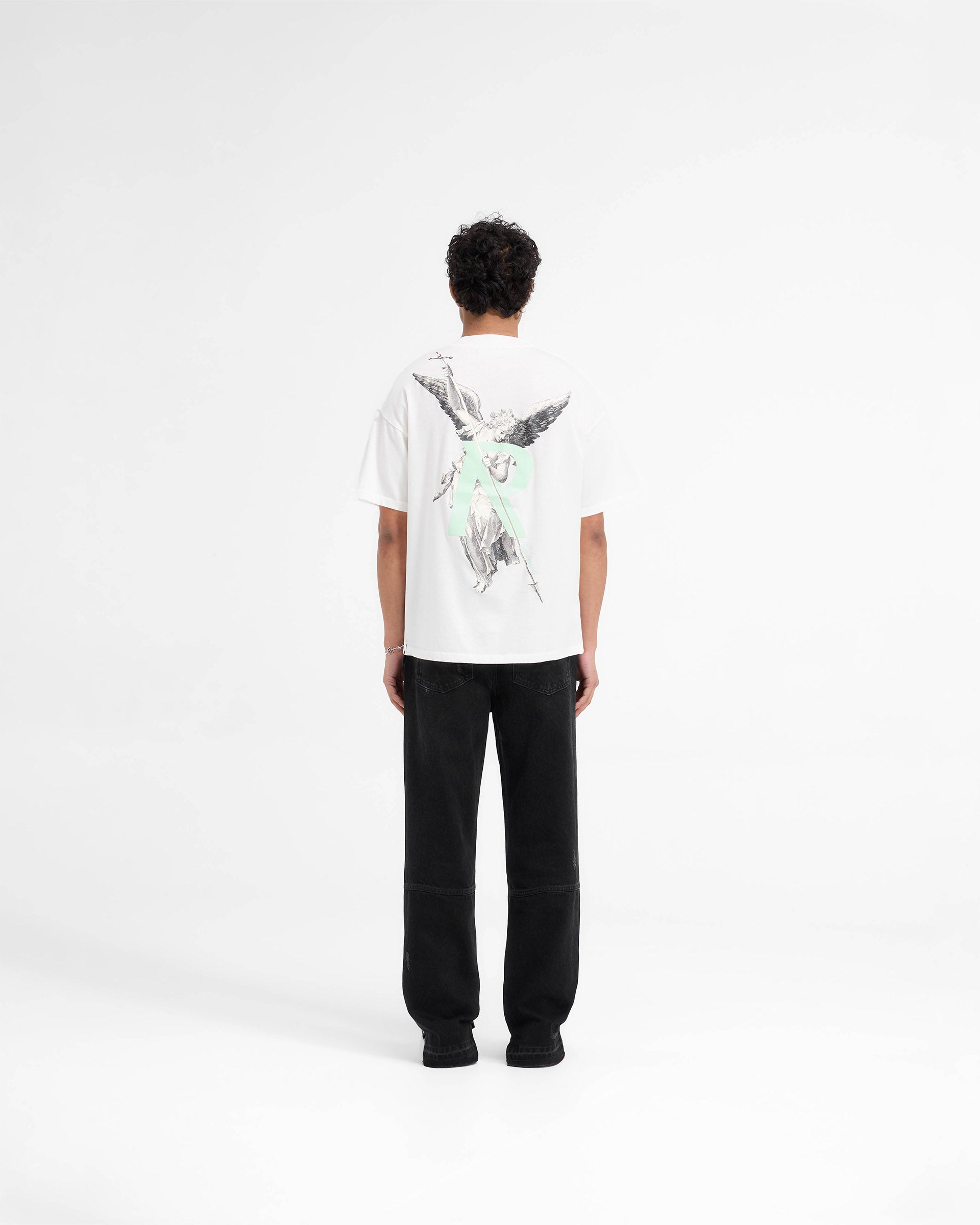 Introducing the Archangel T-Shirt in Salt, a slightly oversized t-shirt. The t-shirt showcases our textured high density screen printed Archangel graphic to the front and back, and a Represent metal bar logo to the hem.
