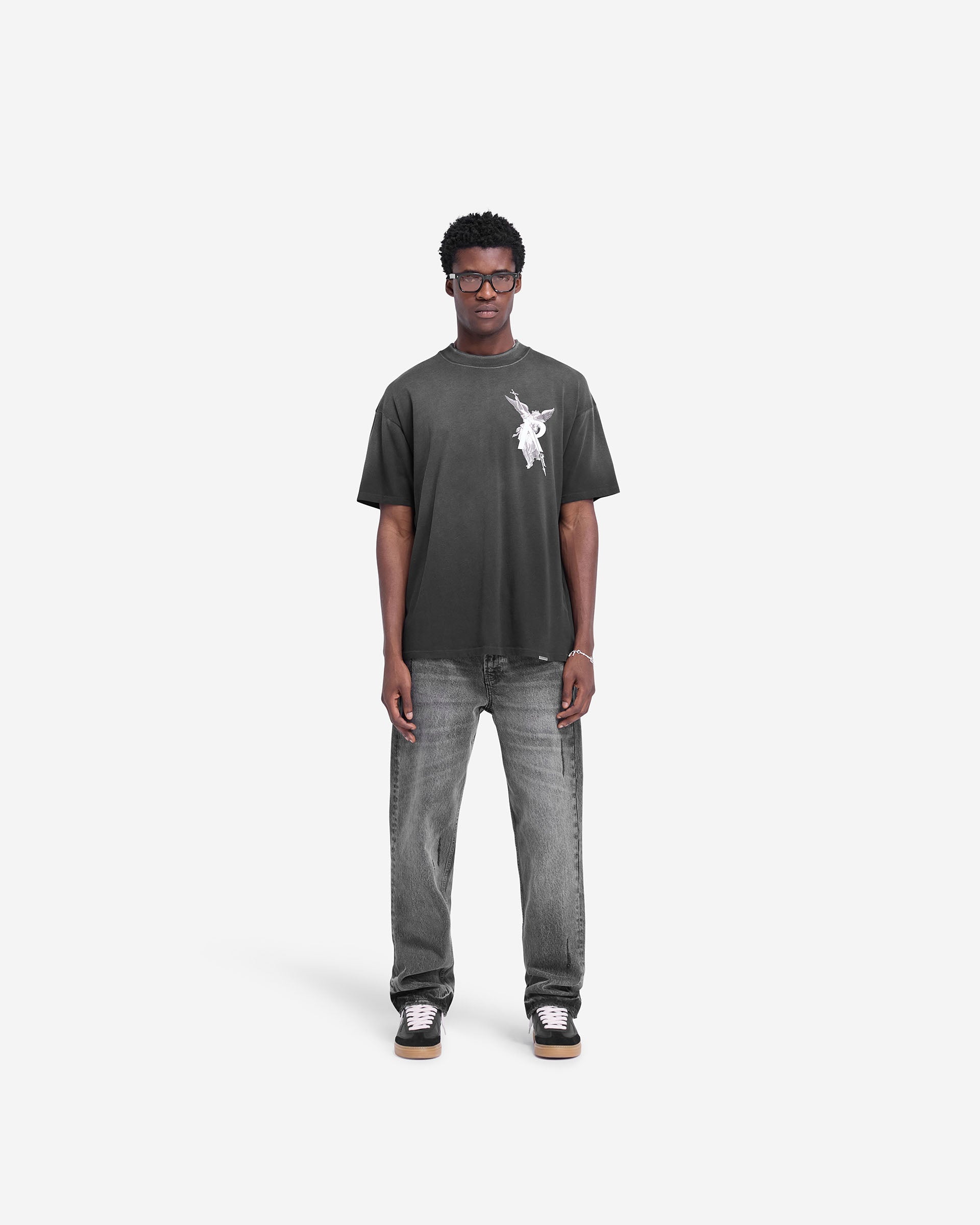 Introducing the Archangel T-Shirt in Stained Black, a slightly oversized t-shirt with a fade out wash and spray applied for a worn look. The t-shirt showcases our textured high density screen printed Archangel graphic to the front and back, and a Represent metal bar logo to the hem.