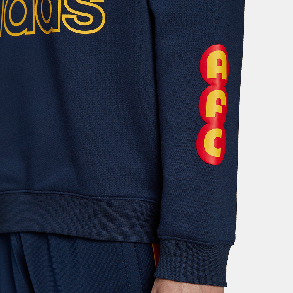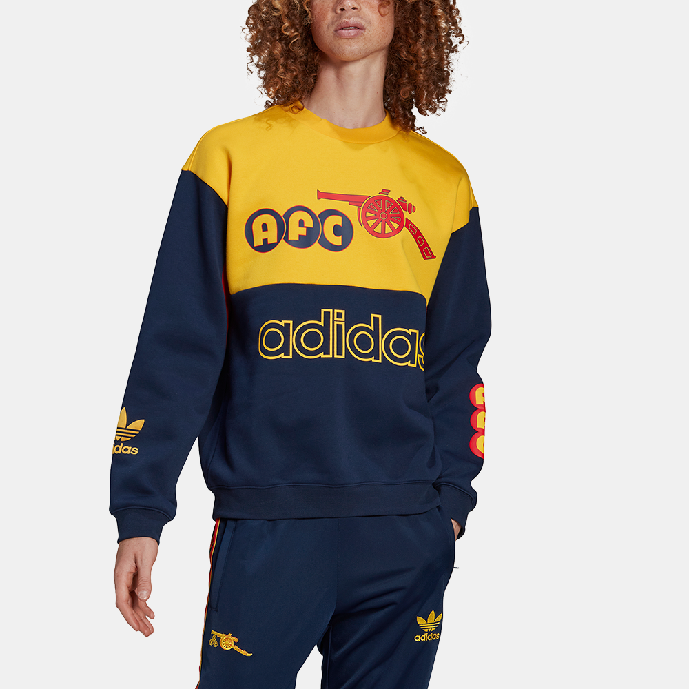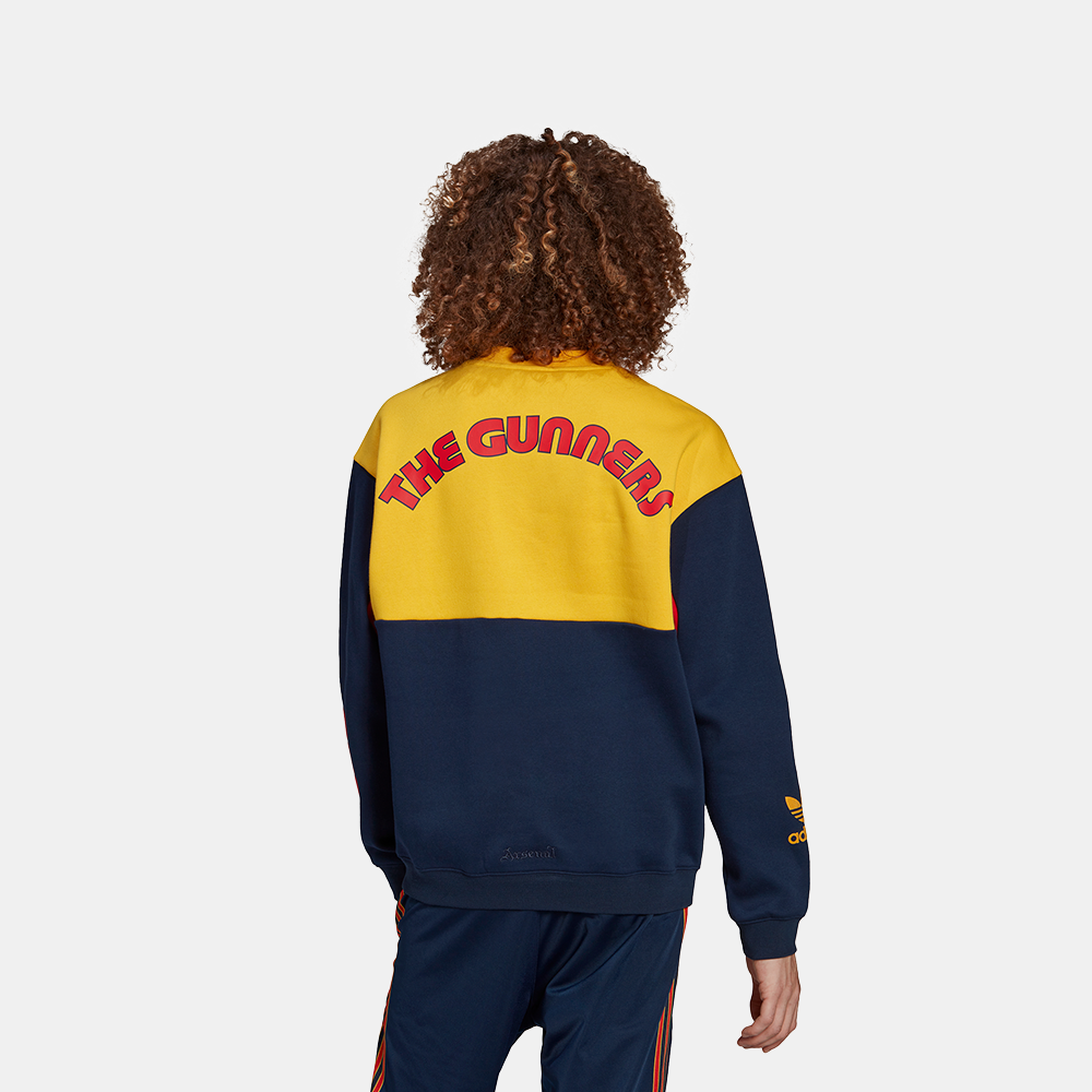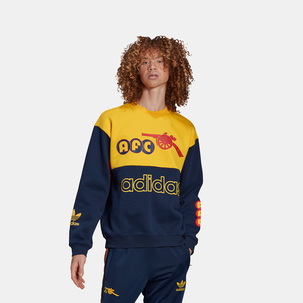"If there's anyone who knows about an epic comeback, it's Arsenal FC. Which is why we teamed up with them to revisit some of their early '90s kits. This adidas x Arsenal FC sweatshirt explodes with the club's colours in a clash of nostalgia and graphics. Their nickname signs things off on the back, and crests and logos throughout bring the look home. Our cotton products support more sustainable cotton farming."