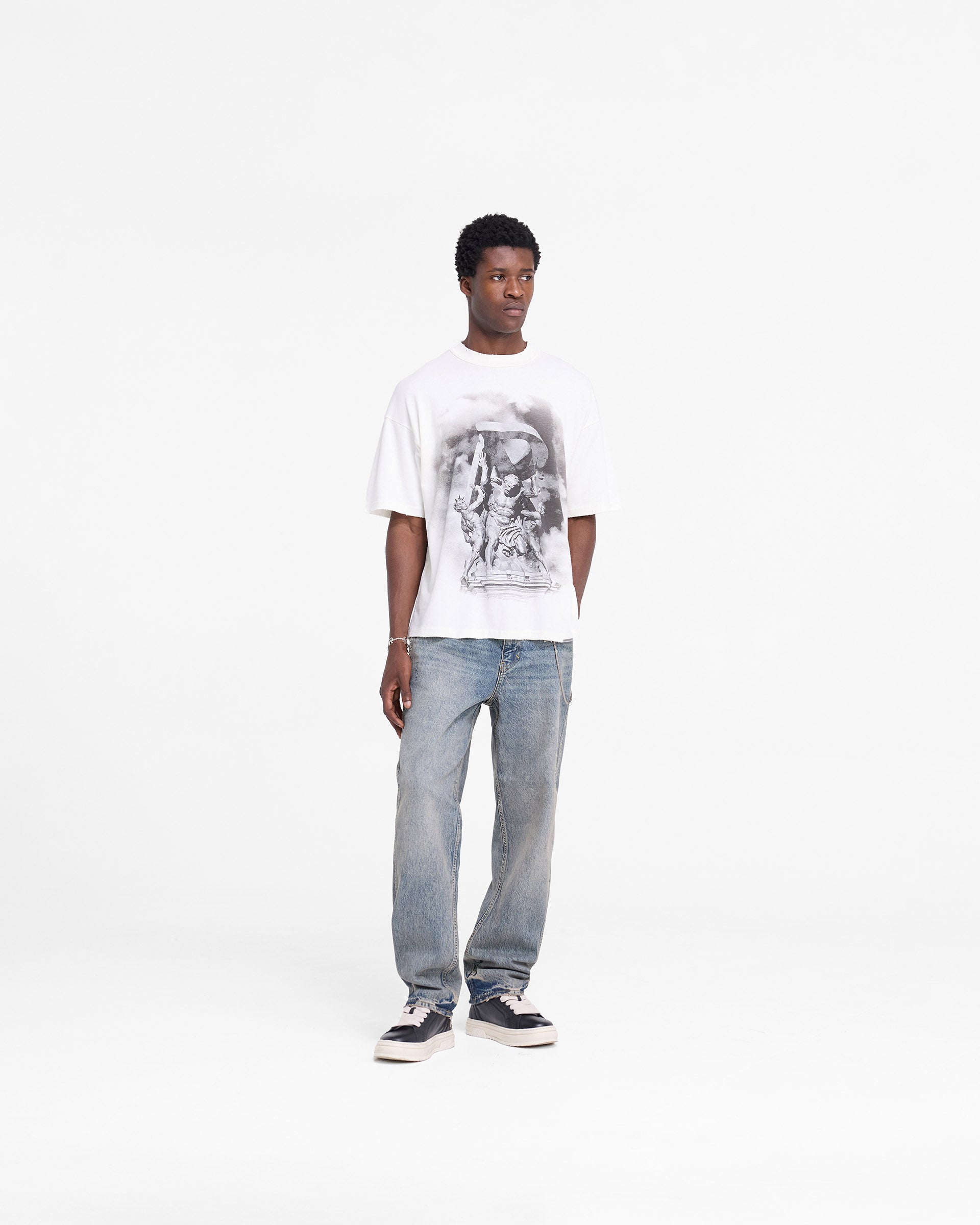 Introducing the Atlas T-Shirt in Flat White, a luxury oversized t-shirt, crafted from medium weight cotton. The Atlas T-Shirt features a mix of puff print and screen print to the back, with our screen printed Atlas graphic to the front. It is finished with nibbling details to the neckline, sleeve end and hem, with a Represent metal bar logo to the hem.