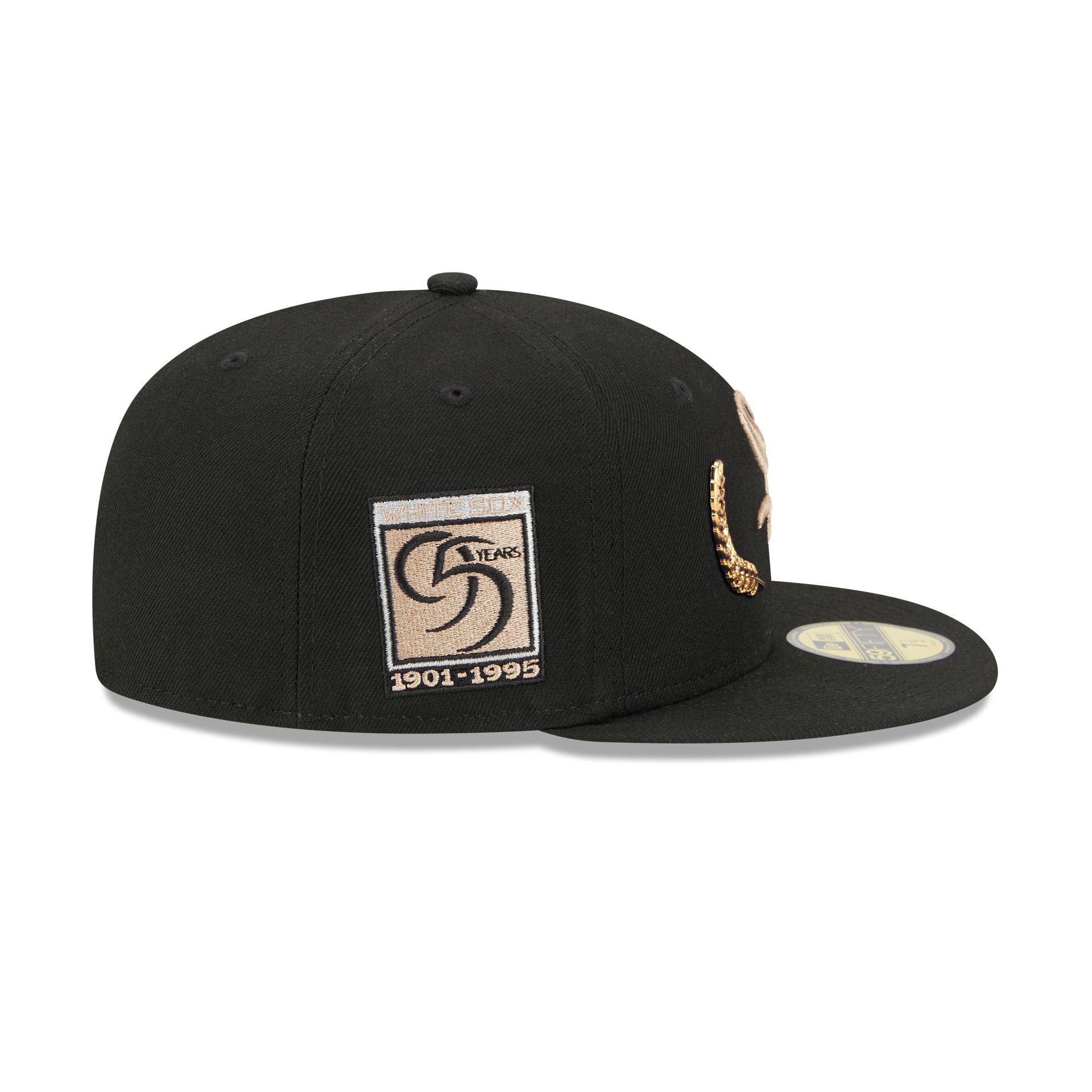 The Chicago White Sox Gold Leaf 59FIFTY Fitted Cap features an embroidered White Sox logo and gold leaf pins at the front panels with a matching MLB Batterman logo at the rear. Additional details include a 95 Years patch at the right-wear side and a gray undervisor.