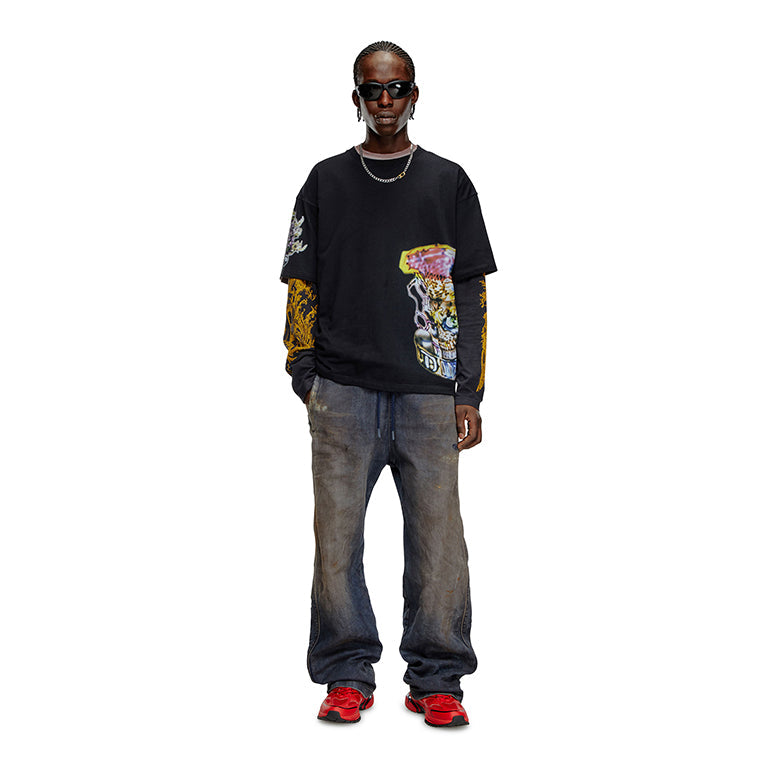 This men's black T-shirt is built for a relaxed fit from certified organic cotton jersey, spun from special raw-effect yarn for a vintage effect. The front, back and sleeve are embellished with colourful digital Diesel prints, inspired by tattoo designs with a blurry effect.
