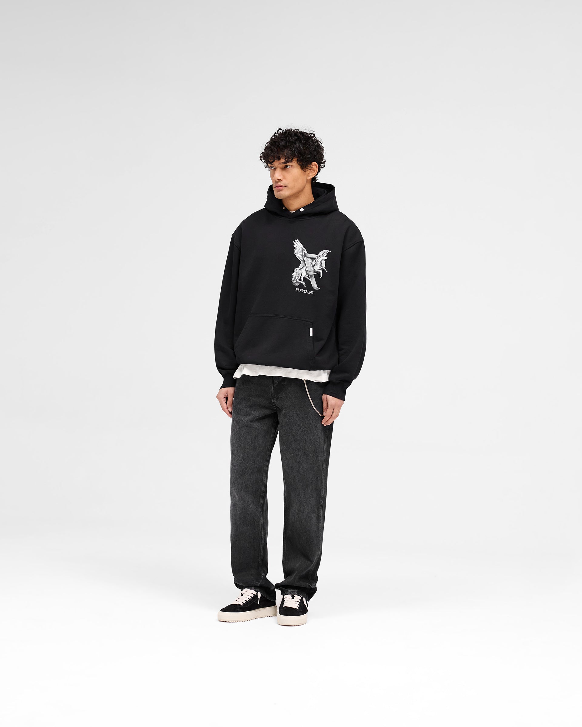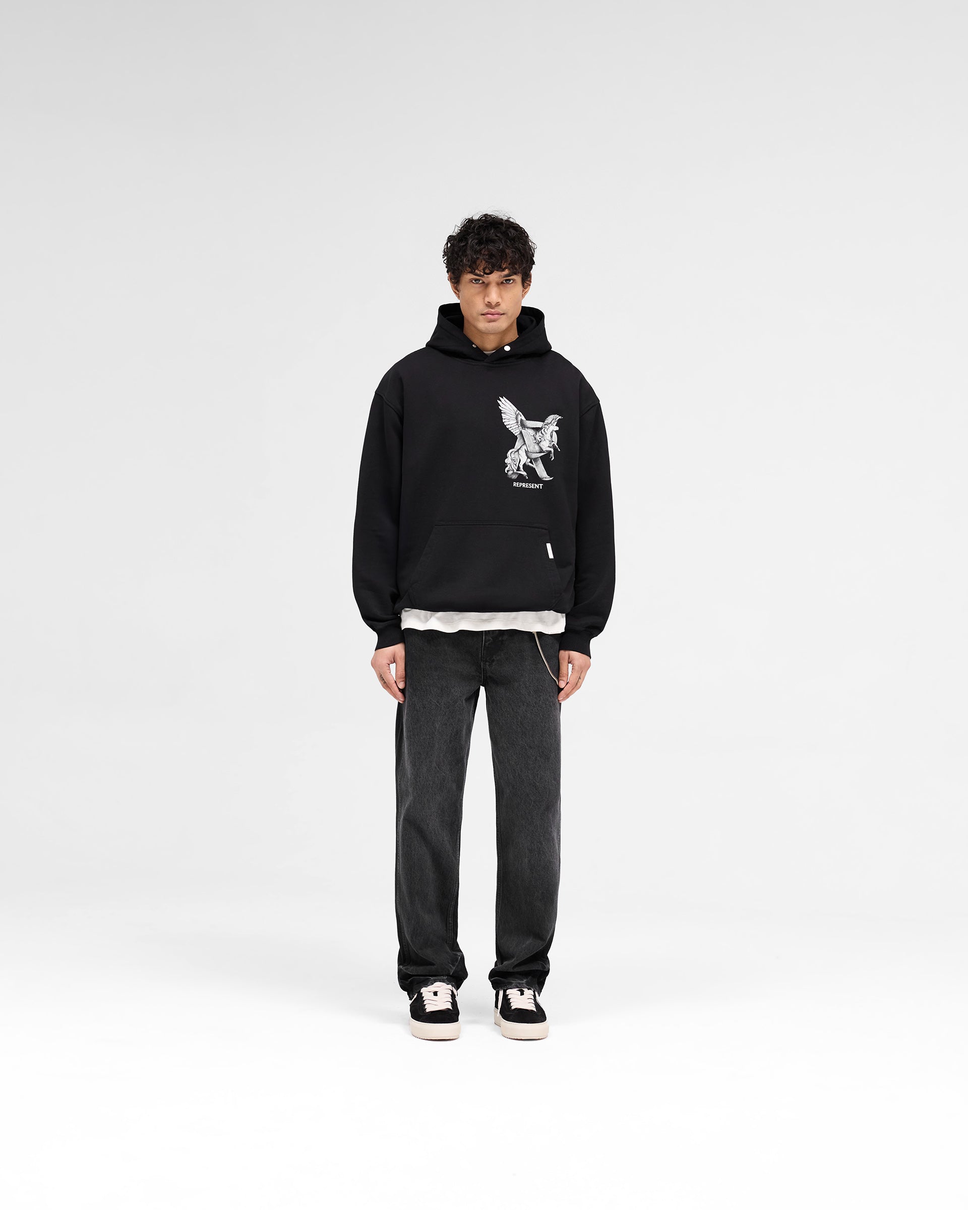 Introducing the Elegance in Motion Hoodie in Jet Black, a slightly oversized hoodie, crafted from heavy weight jersey cotton. The hoodie has our Elegance in Motion graphic to the front and back, finished with a Cobrax popper to the hood and Represent metal bar logo to the pocket.