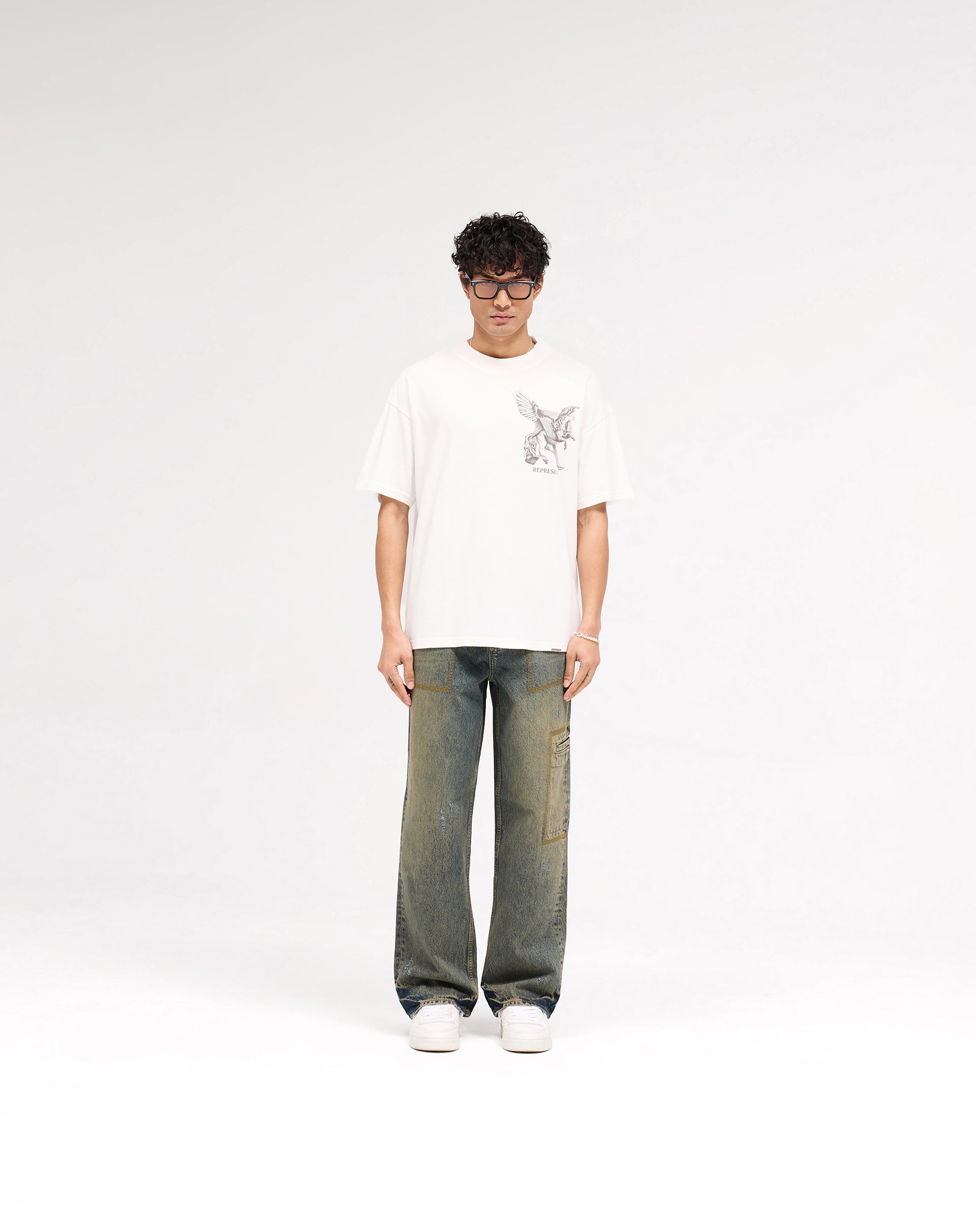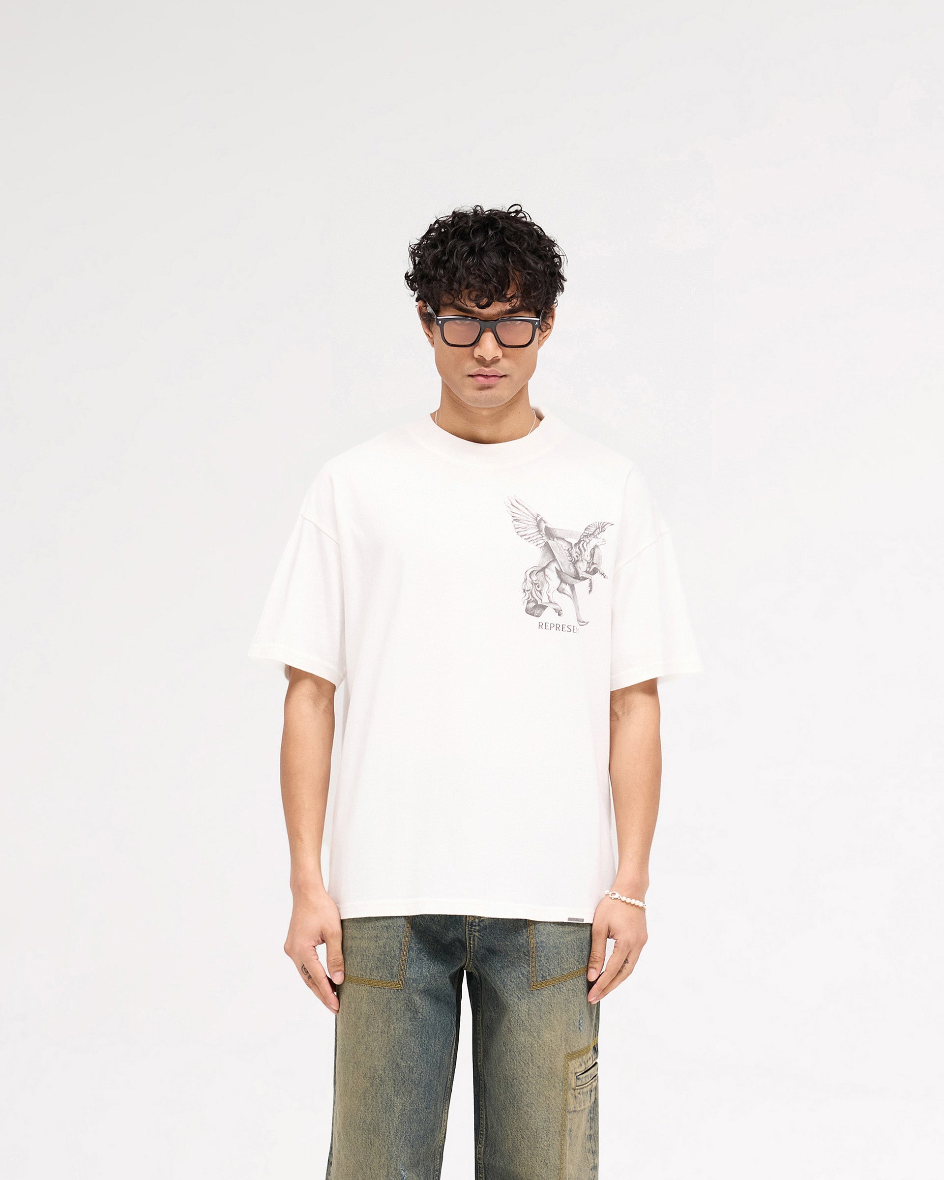 Introducing the Elegance in Motion T-Shirt in Flat White, a slightly oversized t-shirt, crafted from medium weight jersey cotton. The t-shirt has our Elegance in Motion graphic to the front and back, finished with a Represent metal bar logo to the pocket.