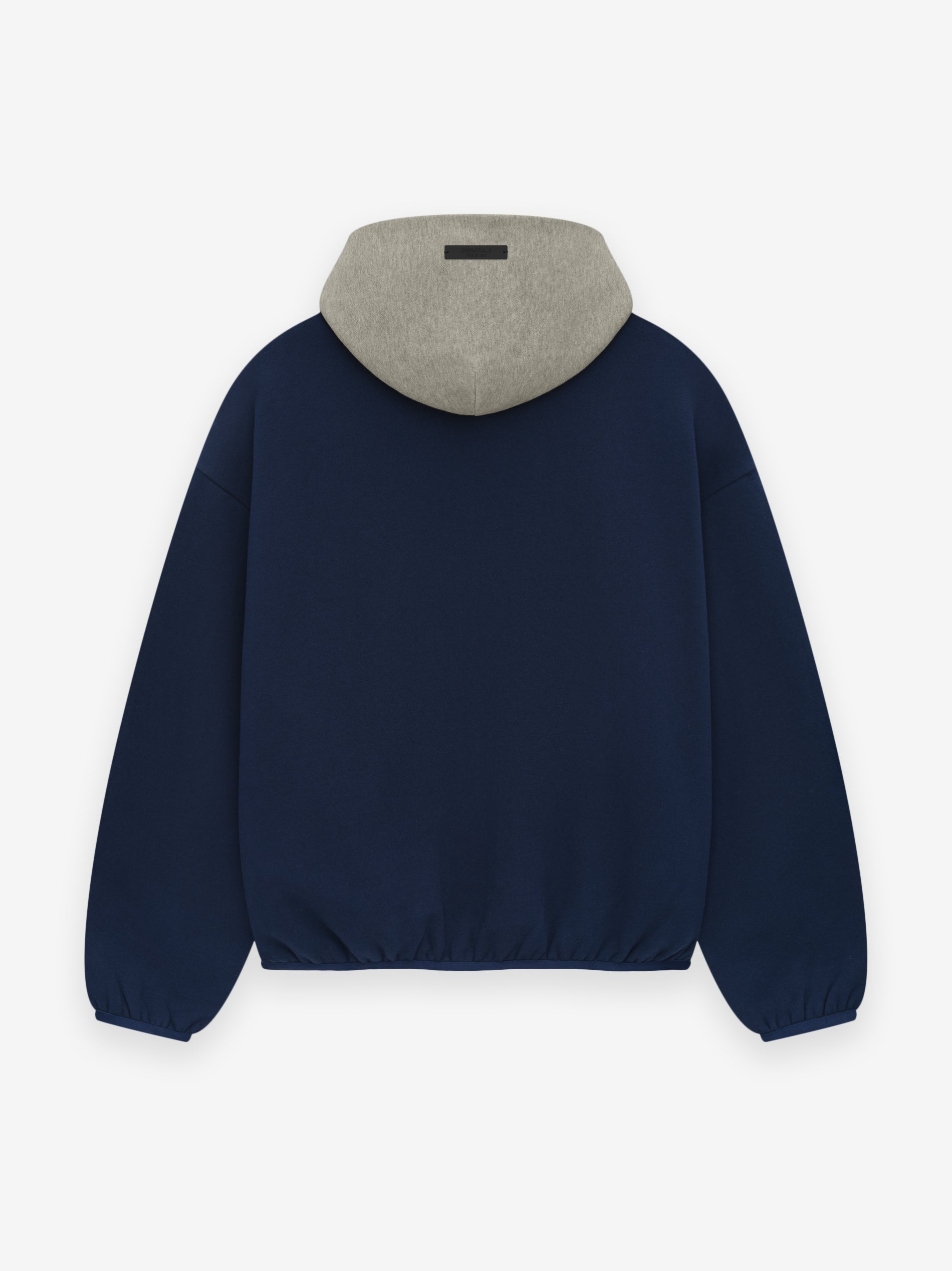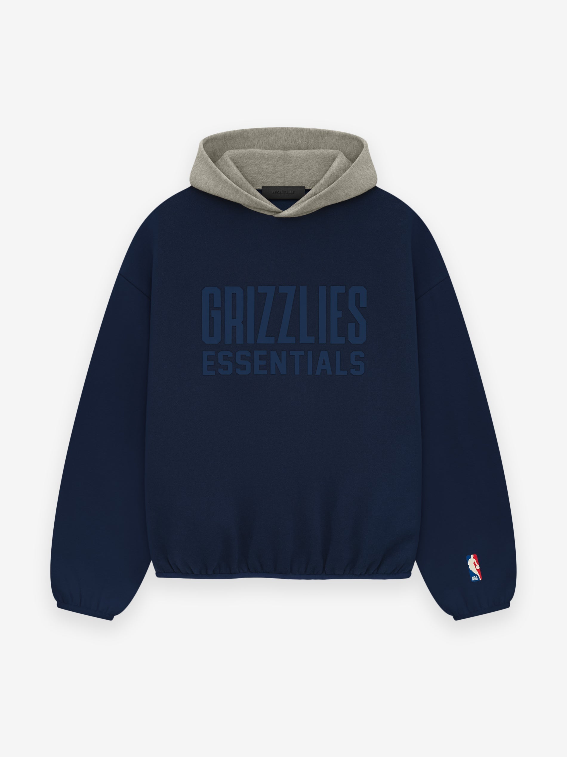 The Essentials Grizzlies hoodie is crafted from core fleece and features a voluminous, cropped silhouette. The front displays a rubberized soft-touch Grizzlies Essentials lockup along with the iconic NBA logo on the sleeve. Additional details include a contrasting double layered hood, side seam pockets, and elastic bindings at the cuffs and waist hem. A rubberized Fear of God label is attached to the hood.