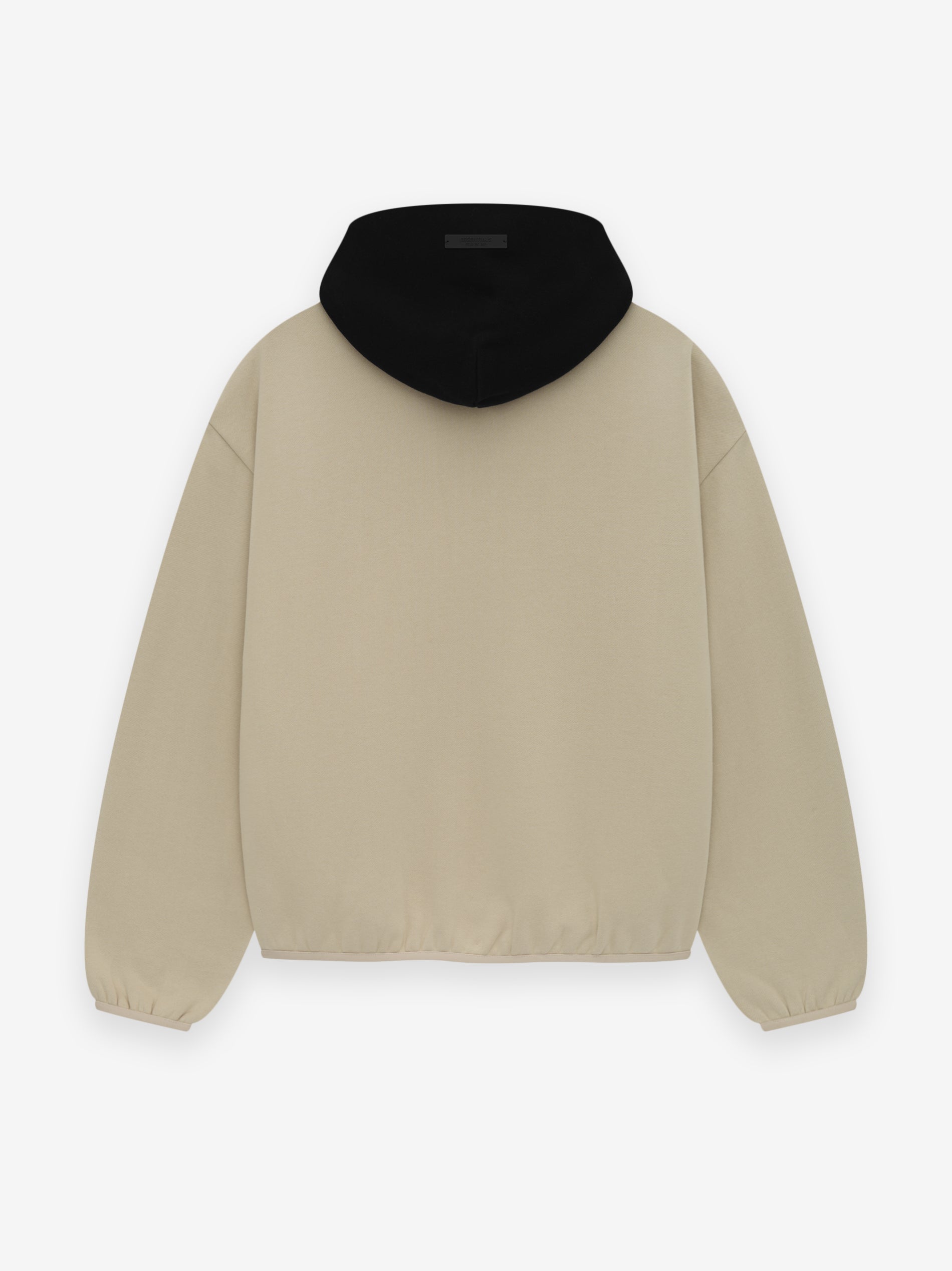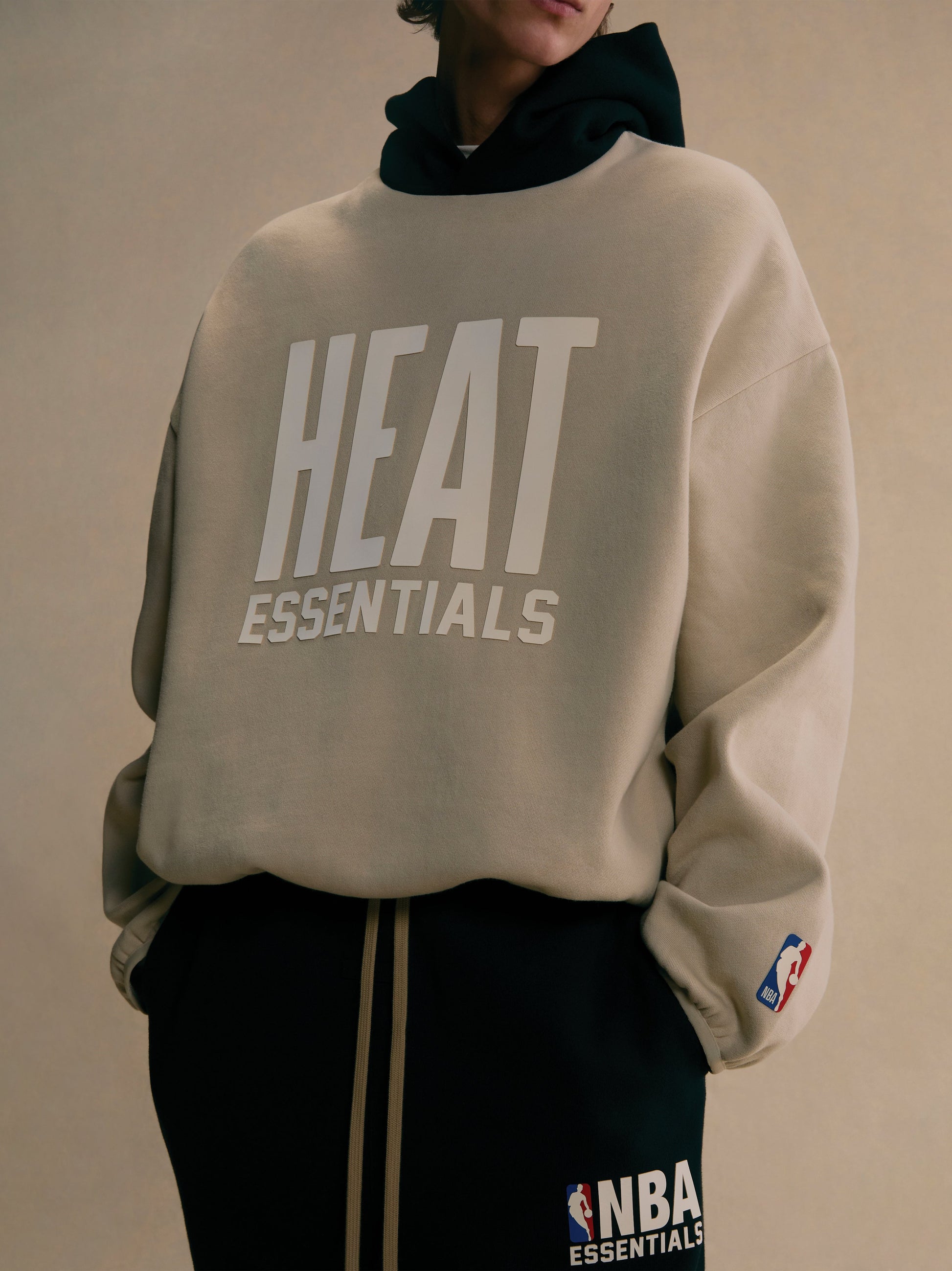 The Essentials Heat hoodie is made from core fleece and showcases a trendy cropped silhouette. The front features a rubberized soft-touch "HEAT ESSENTIALS" logo, along with the iconic NBA logo on the sleeve. Additional details include a contrasting double-layered hood, side seam pockets, and elastic bindings at the cuffs and hem. A rubberized "Essentials Fear of God" label is attached to the hood.