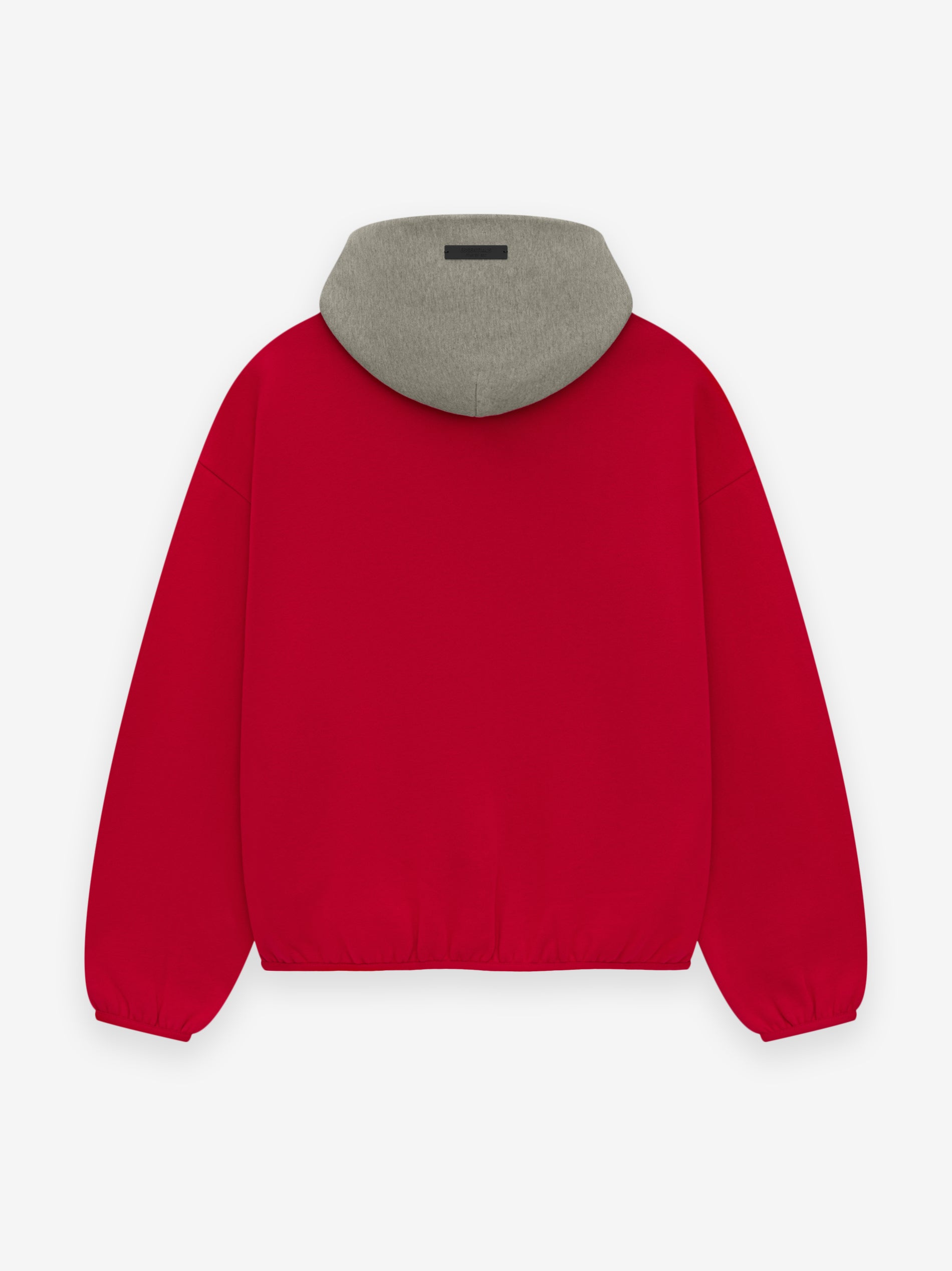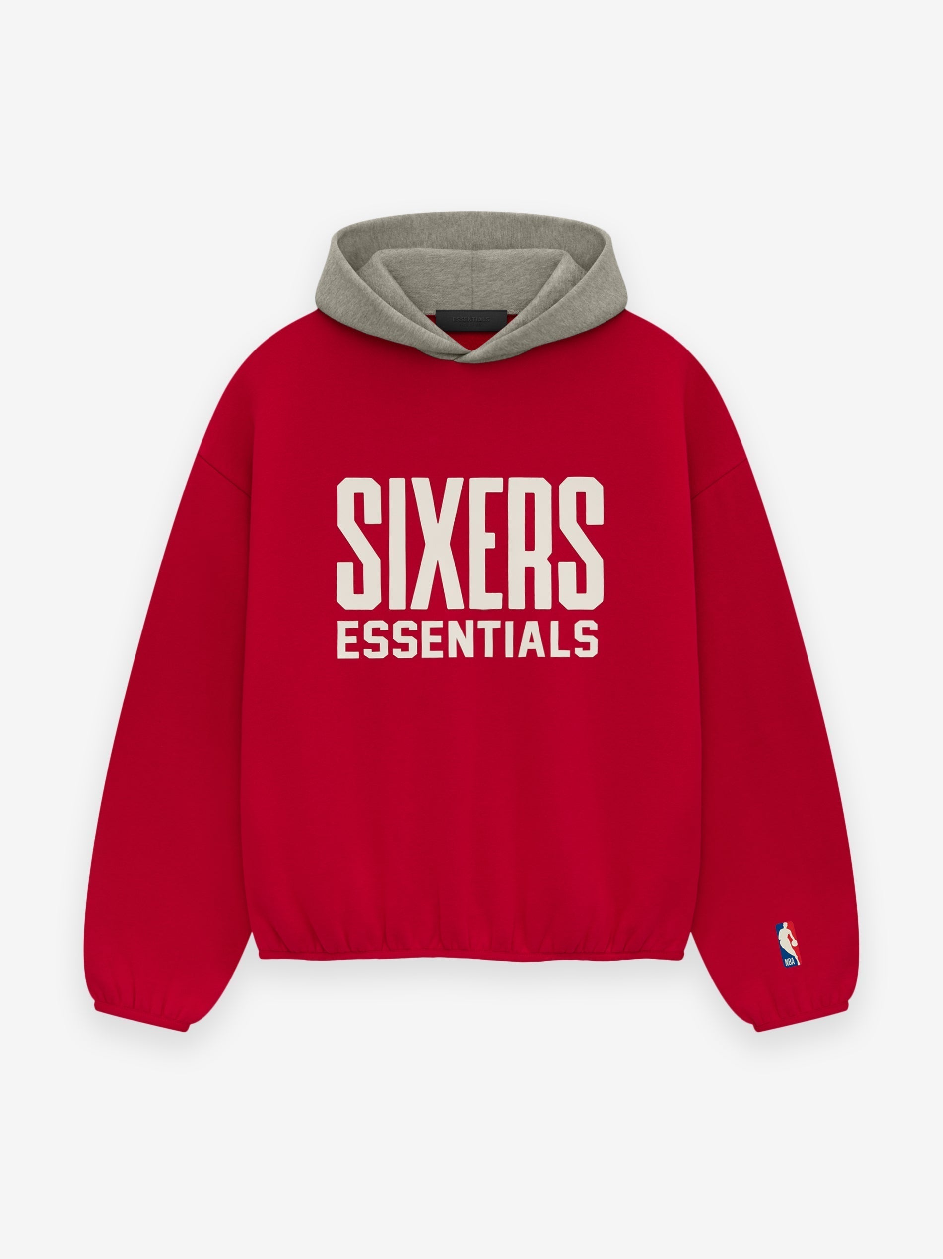 The Essentials Sixers hoodie is crafted from core fleece and features a voluminous, cropped silhouette. The front displays a rubberized soft-touch Sixers Essentials lockup along with the iconic NBA logo on the sleeve. Additional details include a contrasting double layered hood, side seam pockets, and elastic bindings at the cuffs and waist hem. A rubberized Fear of God label is attached to the hood.