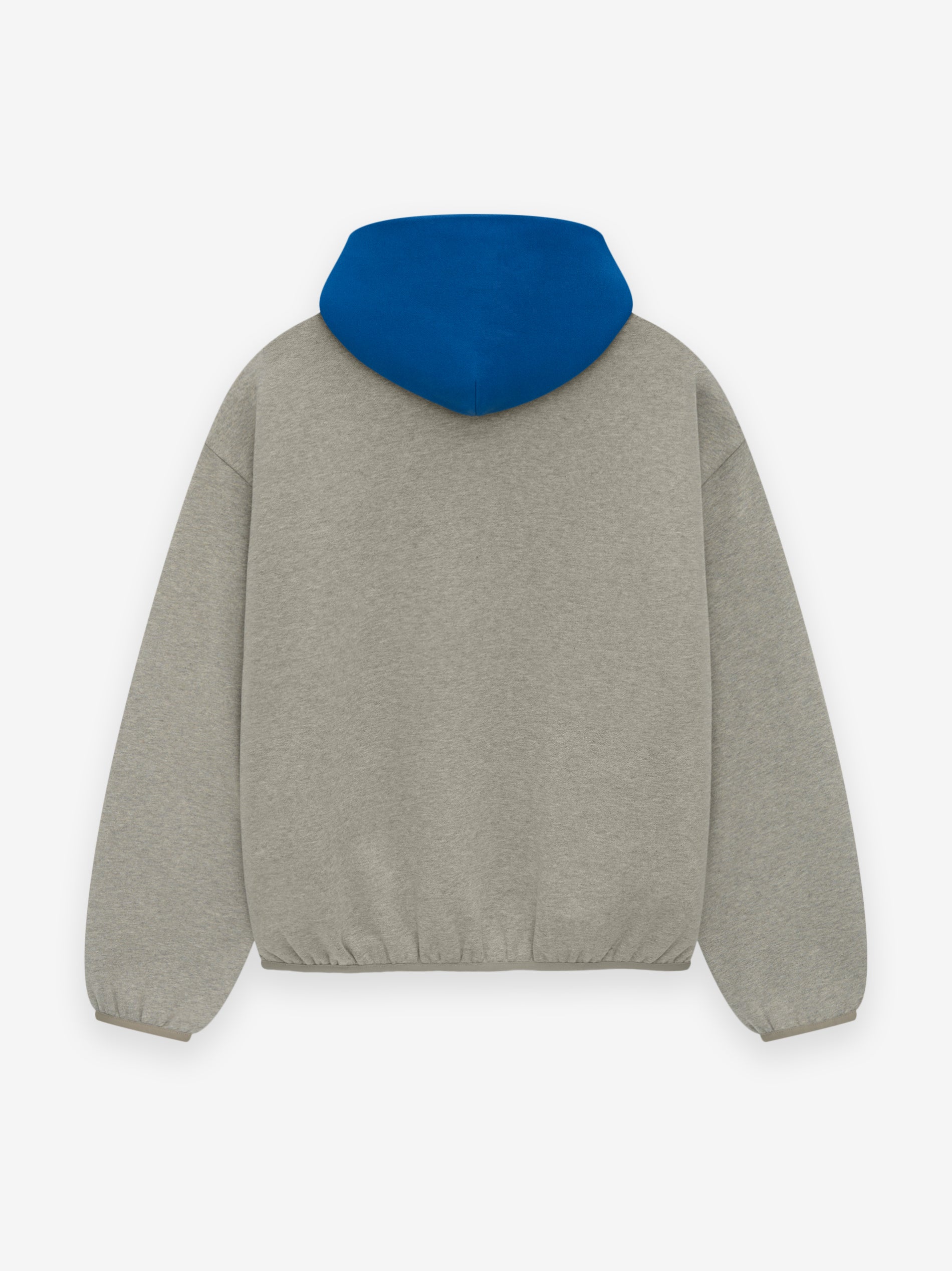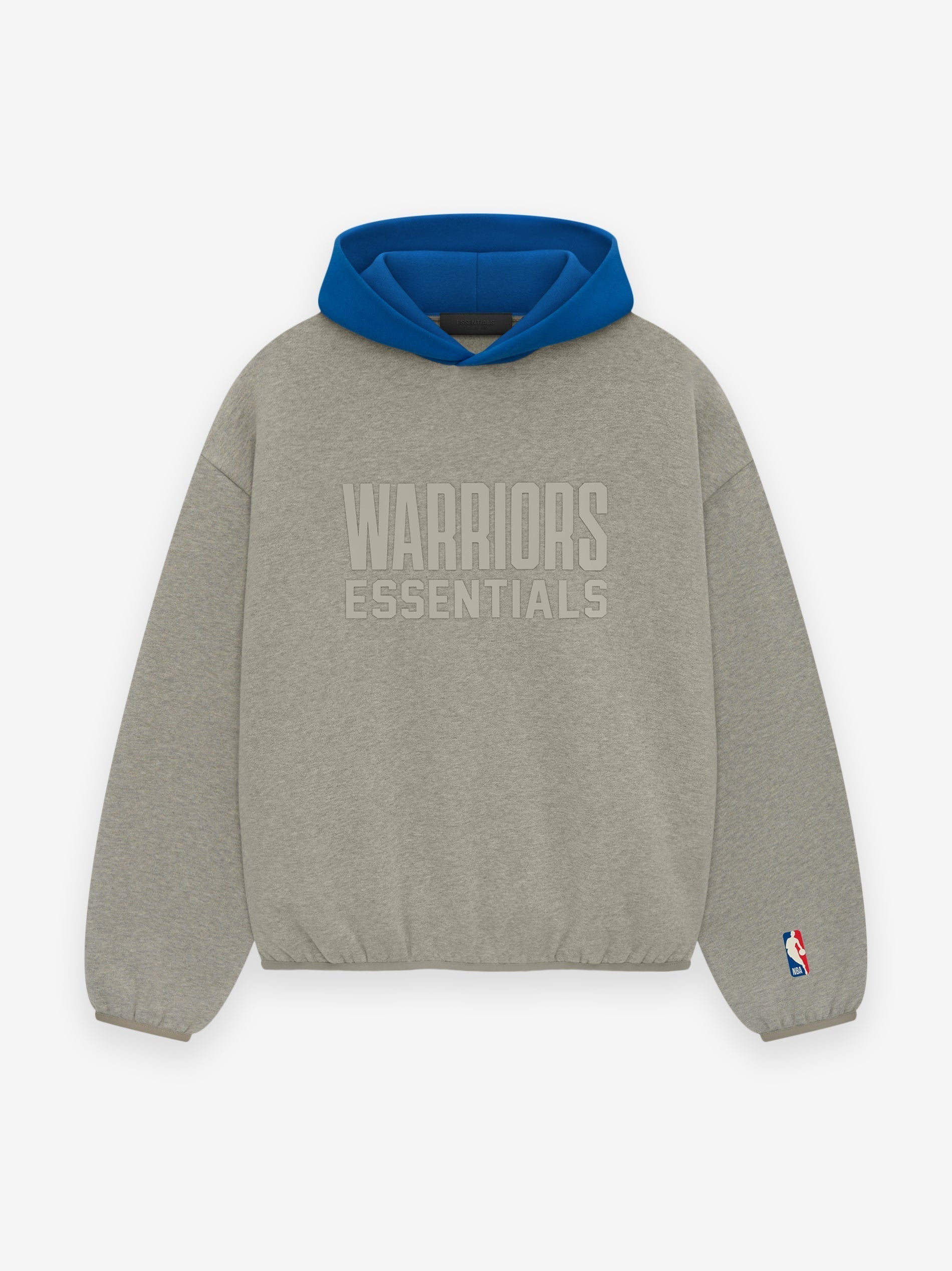 The Essentials Warriors hoodie is crafted from core fleece and features a voluminous, cropped silhouette. The front displays a rubberized soft-touch Warriors Essentials lockup along with the iconic NBA logo on the sleeve. Additional details include a contrasting double layered hood, side seam pockets, and elastic bindings at the cuffs and waist hem. A rubberized Fear of God label is attached to the hood.