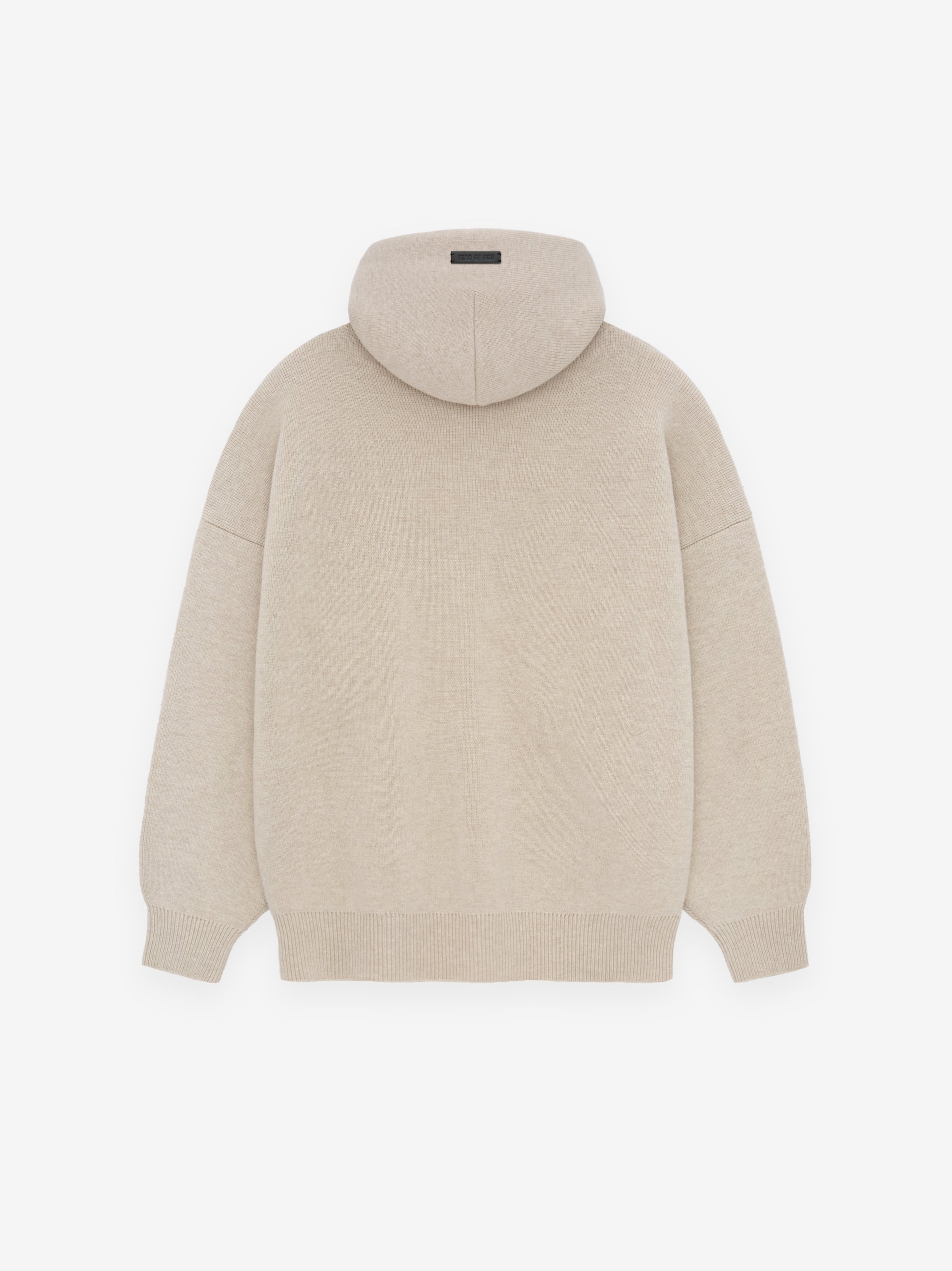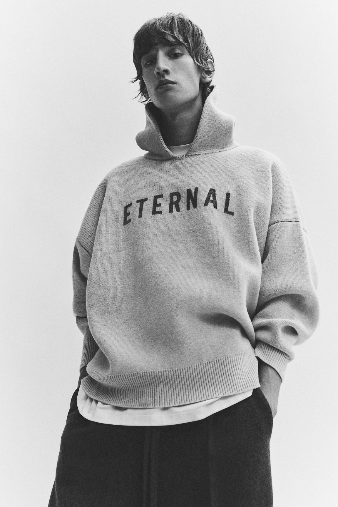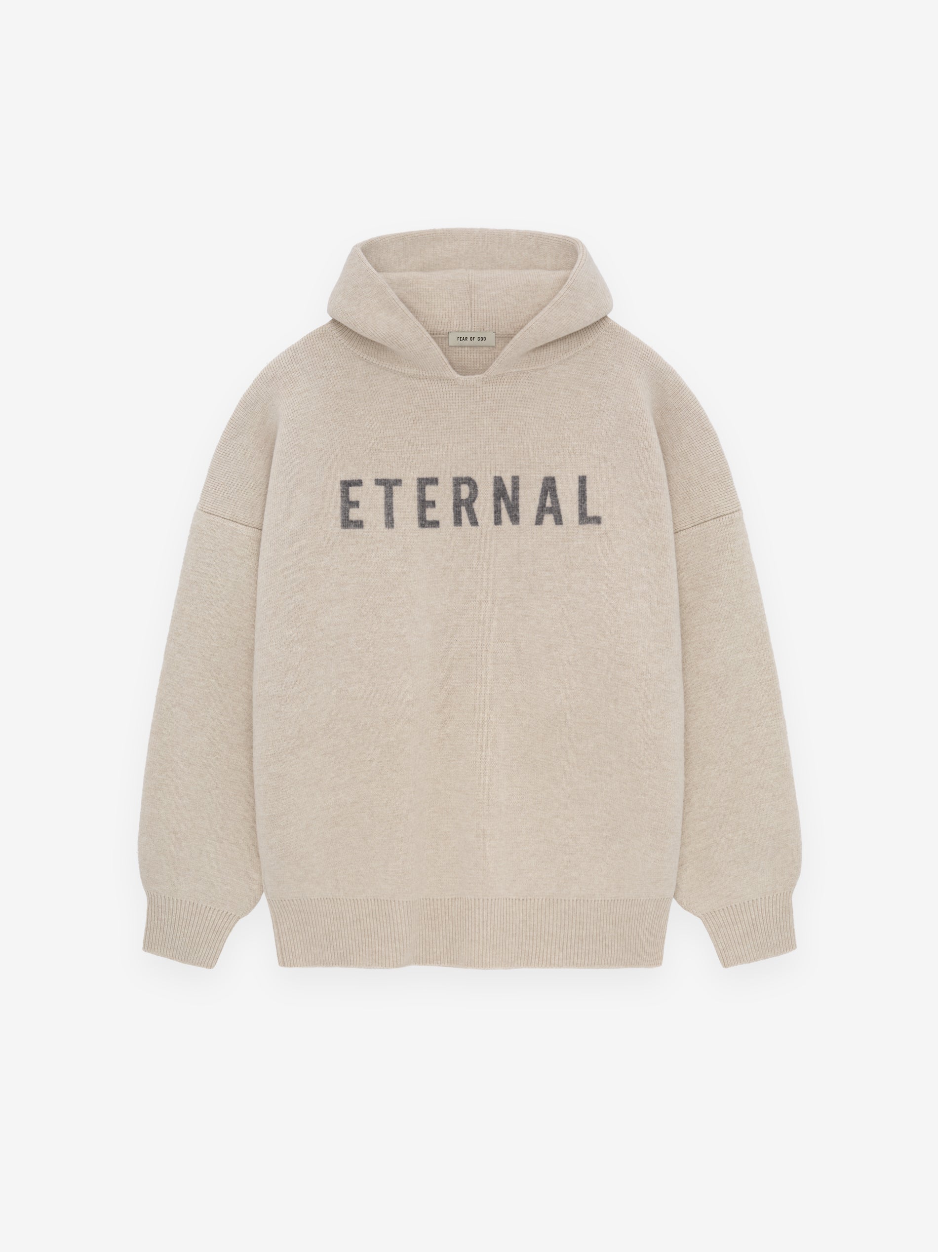 The Eternal Knit Hoodie is knitted in Italy from 100% merino wool, and detailed with a jacquard "ETERNAL" logo. The designed volume in the body and sleeves to creates a round silhouette. The hood, rib-knit cuffs, and waist hem frame the piece. A Fear of God label is stitched on the hood.