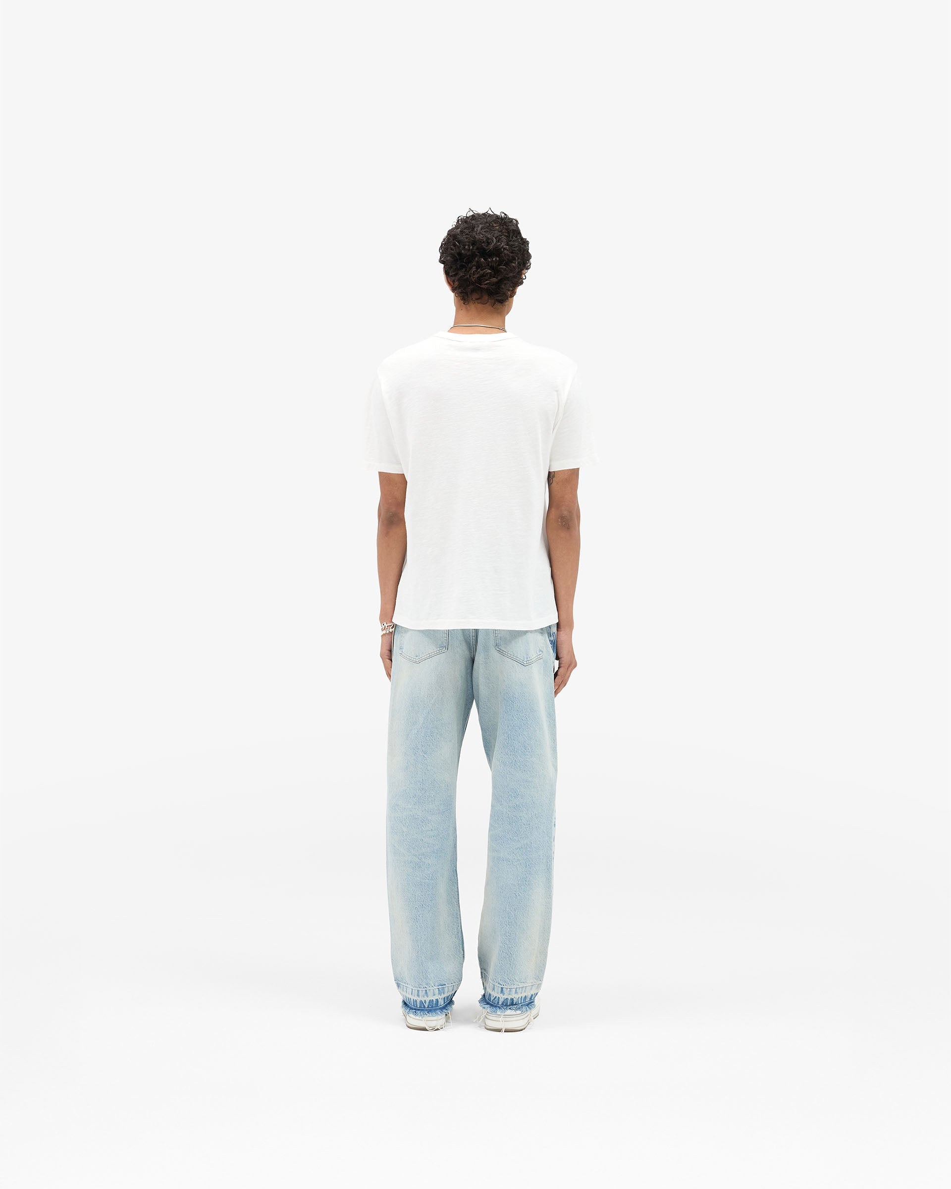 The GH T-Shirt in Flat White is a refined everyday layer from the Heaton Capsule. Designed by George Heaton, this new silhouette features a regular-slim fit and is crafted from lightweight 160GSM cotton. It’s finished with a laid-on rib collar and blind hems for a clean, minimal profile. Subtle detailing at the hem nods to Represent’s signature design language.