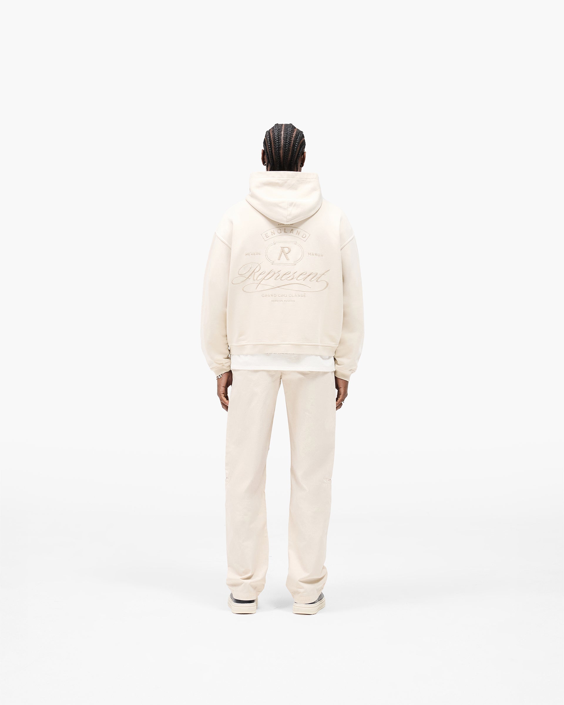 This hoodie features high build and flat embroidery to the chest and back, showcasing the Grand Cru crest and Represent script in tonal thread. With a relaxed fit, popper fastening at the hood, and a garment-dyed, spray-finished surface, it blends vintage inspiration with modern refinement.