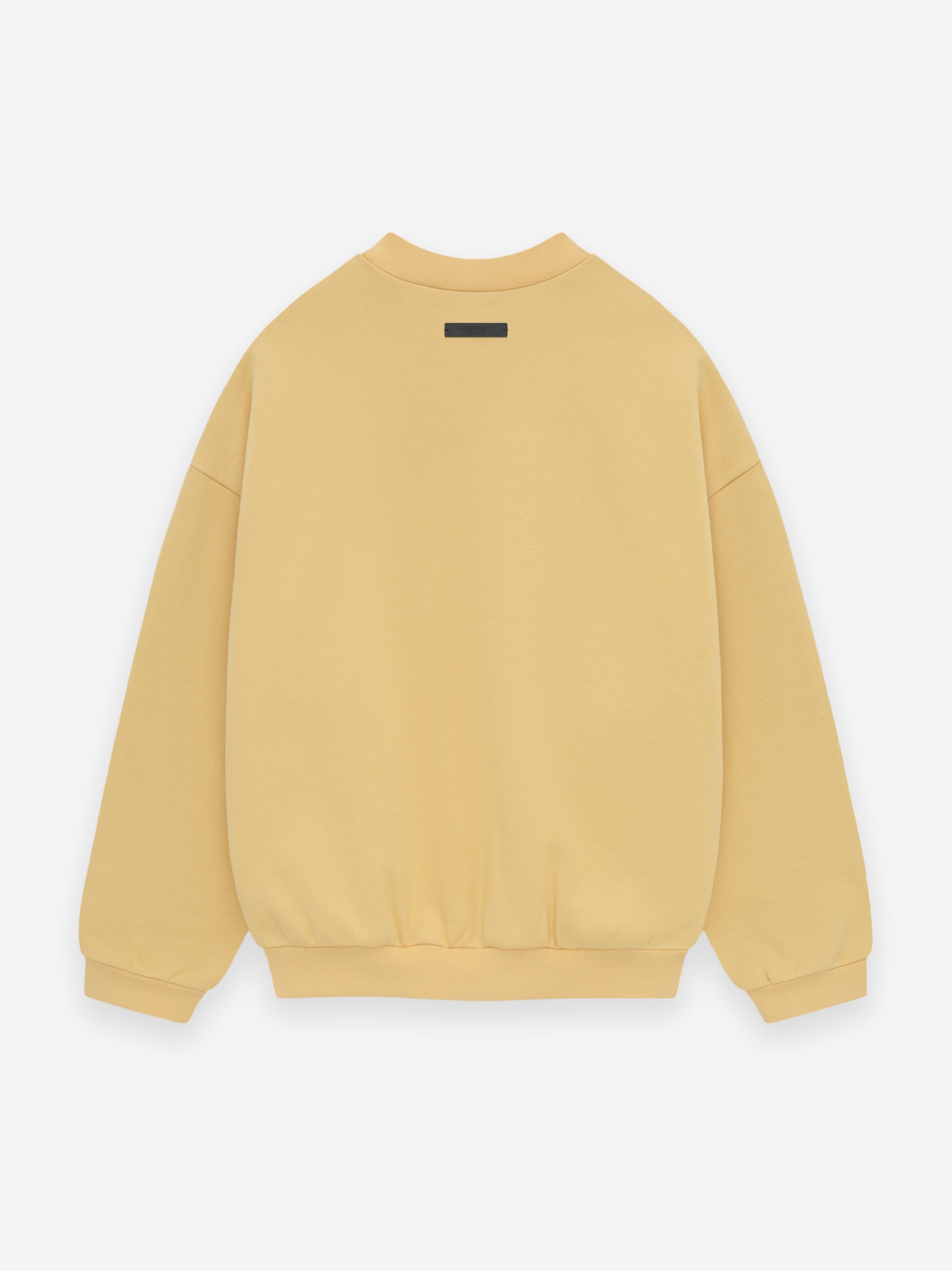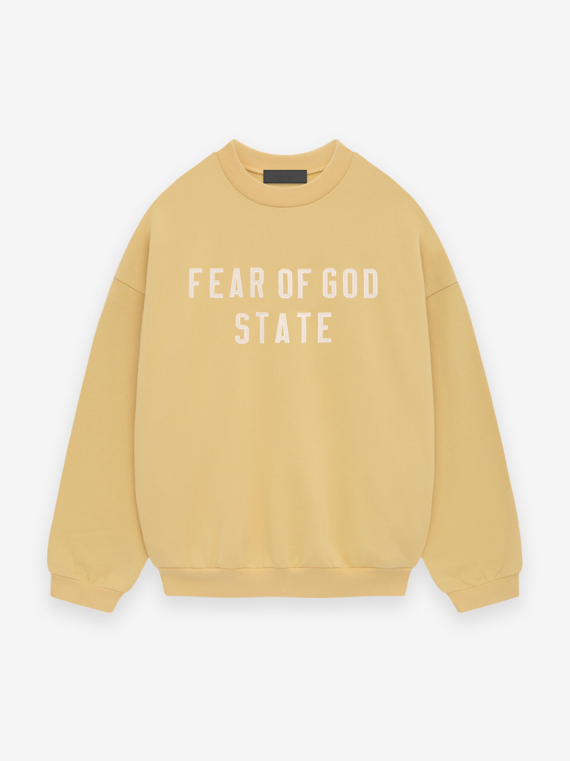 The Heavy Fleece Crewneck is made from heavyweight 520gsm, 100% cotton fleece with a subtle vintage wash. The designed volume creates a round, cropped silhouette. A collegiate-inspired "Fear of God State" satin twill varsity lettering is stitched across the front. Details include a rib-knit collar, cuffs, waist-hem, and side pockets. The Essentials Fear of God rubberized label is at the back collar.