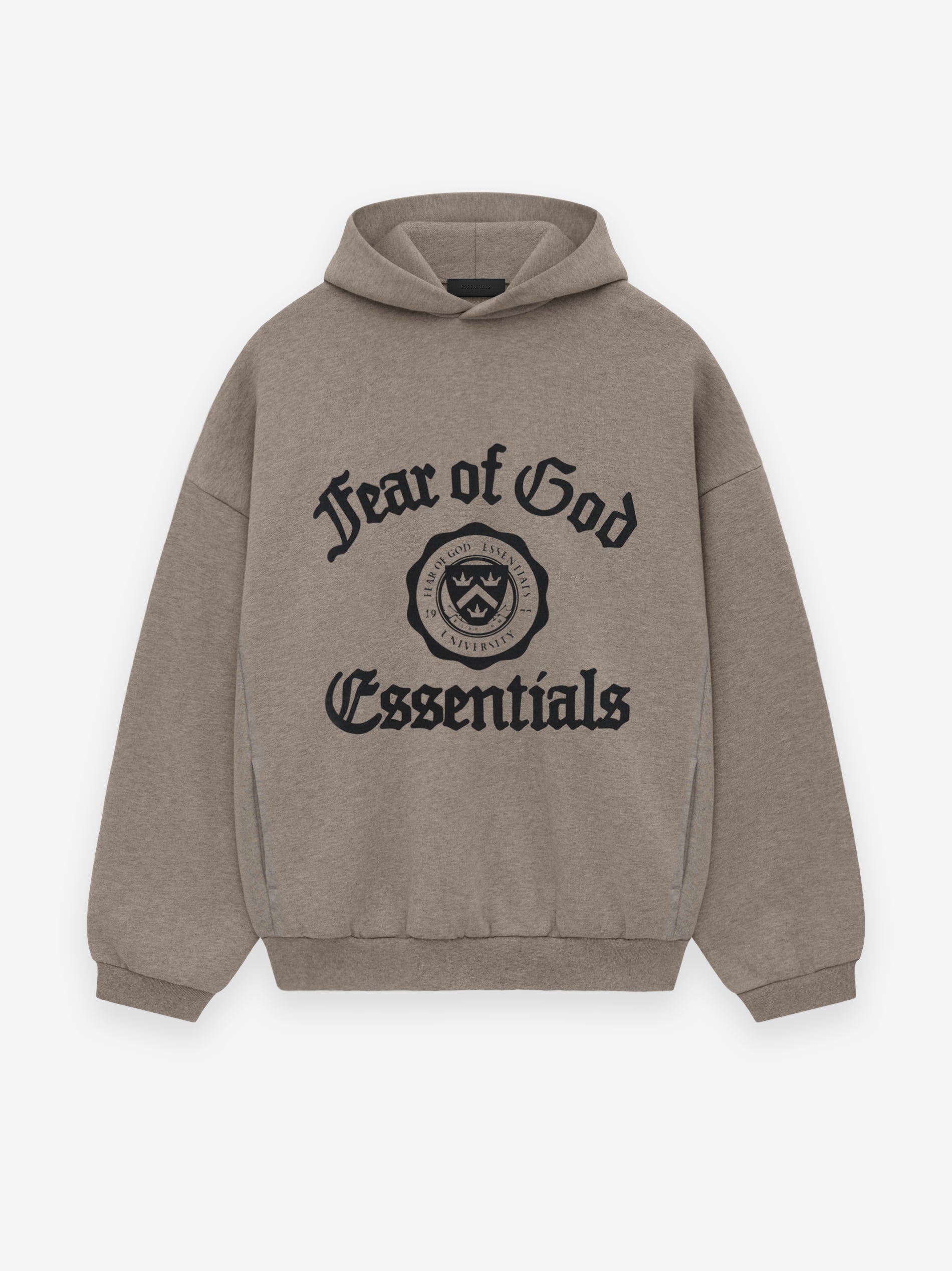 The Heavy Fleece Vintage Shrunken Hoodie is made from heavyweight 520gsm, 100% cotton fleece with a subtle vintage wash. The silhouette is influenced by shrunken fit of the 1980's. An Old English "Fear of God University" with shield graphic is printed on the chest. Details include an double layer hoodie, rib-knit cuffs, waist-hem, and side pockets. The Essentials Fear of God rubberized label on the collar.