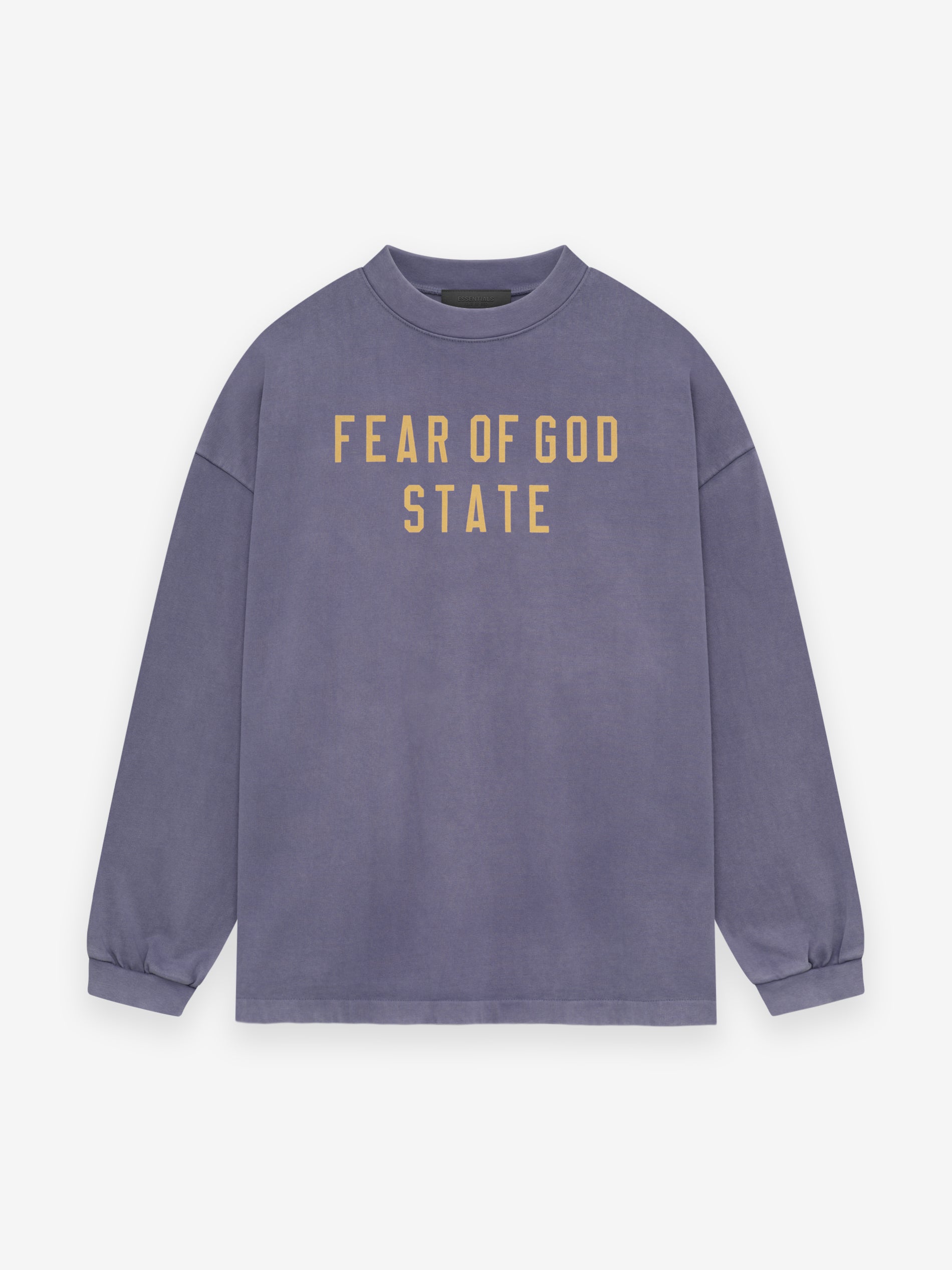 The Heavy Long Sleeve Tee is elevated in a 380-gram heavy cotton jersey to provide pronounced weight and structure. The rib-knit crewneck tee fits relaxed in the body with dropped shoulders. A collegiate-inspired "Fear of God State" graphic is screen printed on the center front, and the Essentials Fear of God rubberized label is at the back collar.