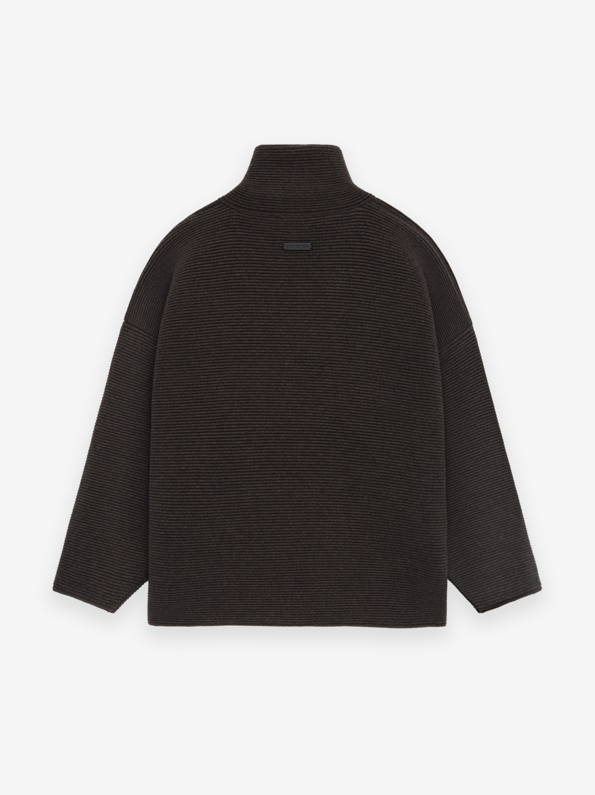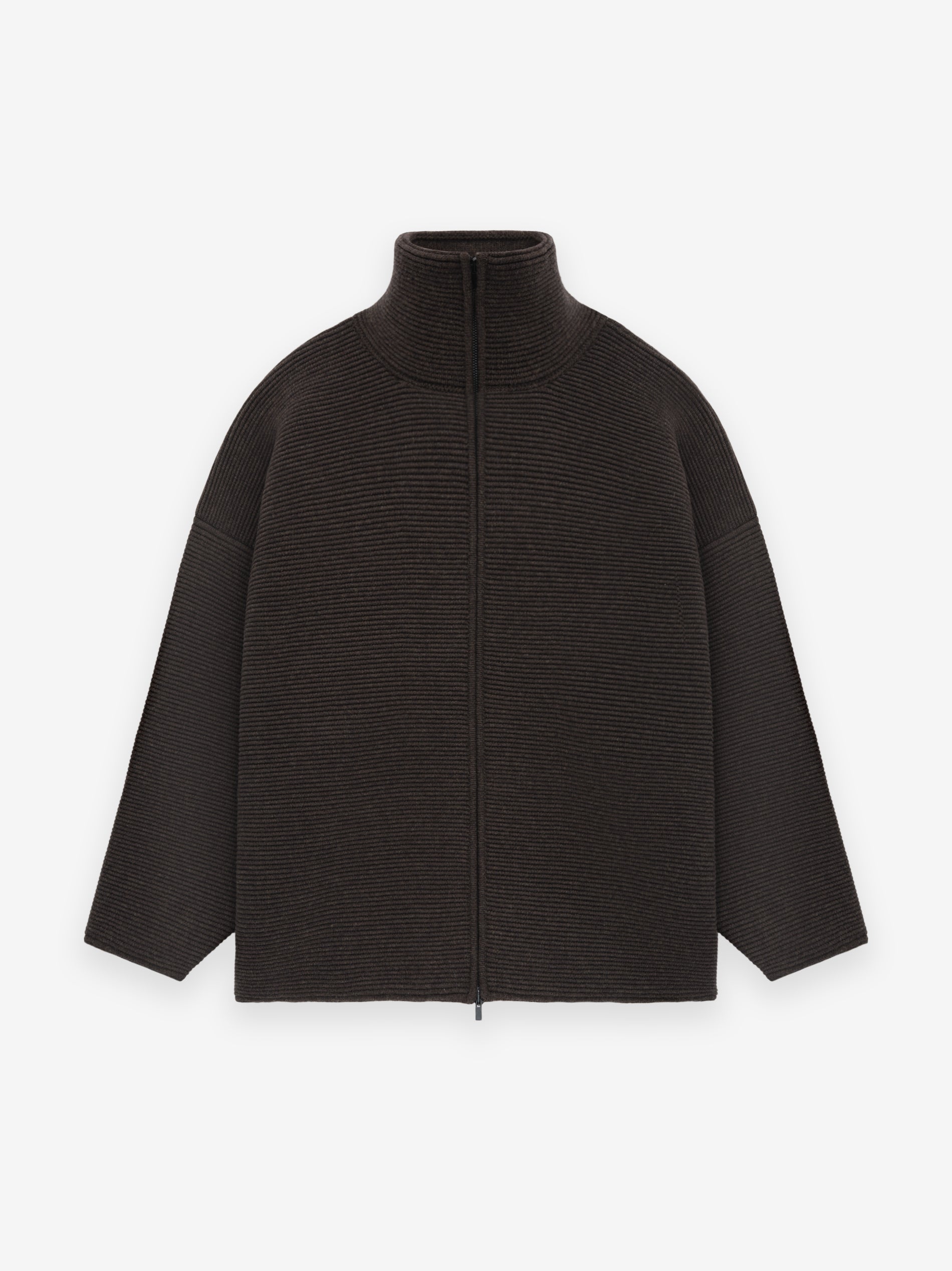 The Heavy Ottoman Full-Zip Sweater is knitted in a wide horizontal rib from ultra-heavyweight merino wool, creating a striking texture. The design includes a high neck, full front zip, and volume in the body and sleeves to create a round silhouette. A Fear of God leather label is stitched at the back collar.