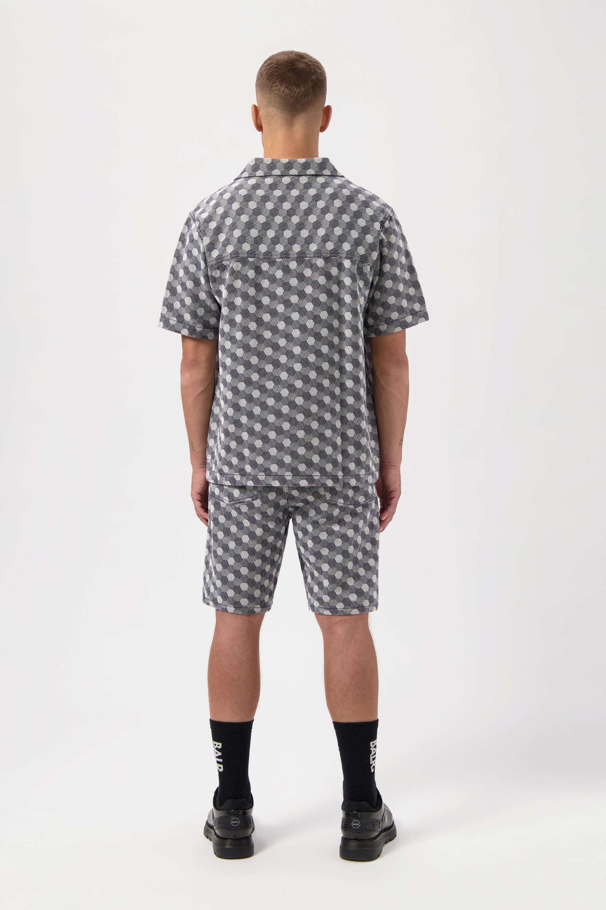 Experience timeless style and comfort in our Hex Jacquard Box Shirt in Indigo. Its box fit and branded silver metal buttons give a modern edge to the classic hex pattern woven denim fabric. Complete the look with the complementary relaxed shorts.