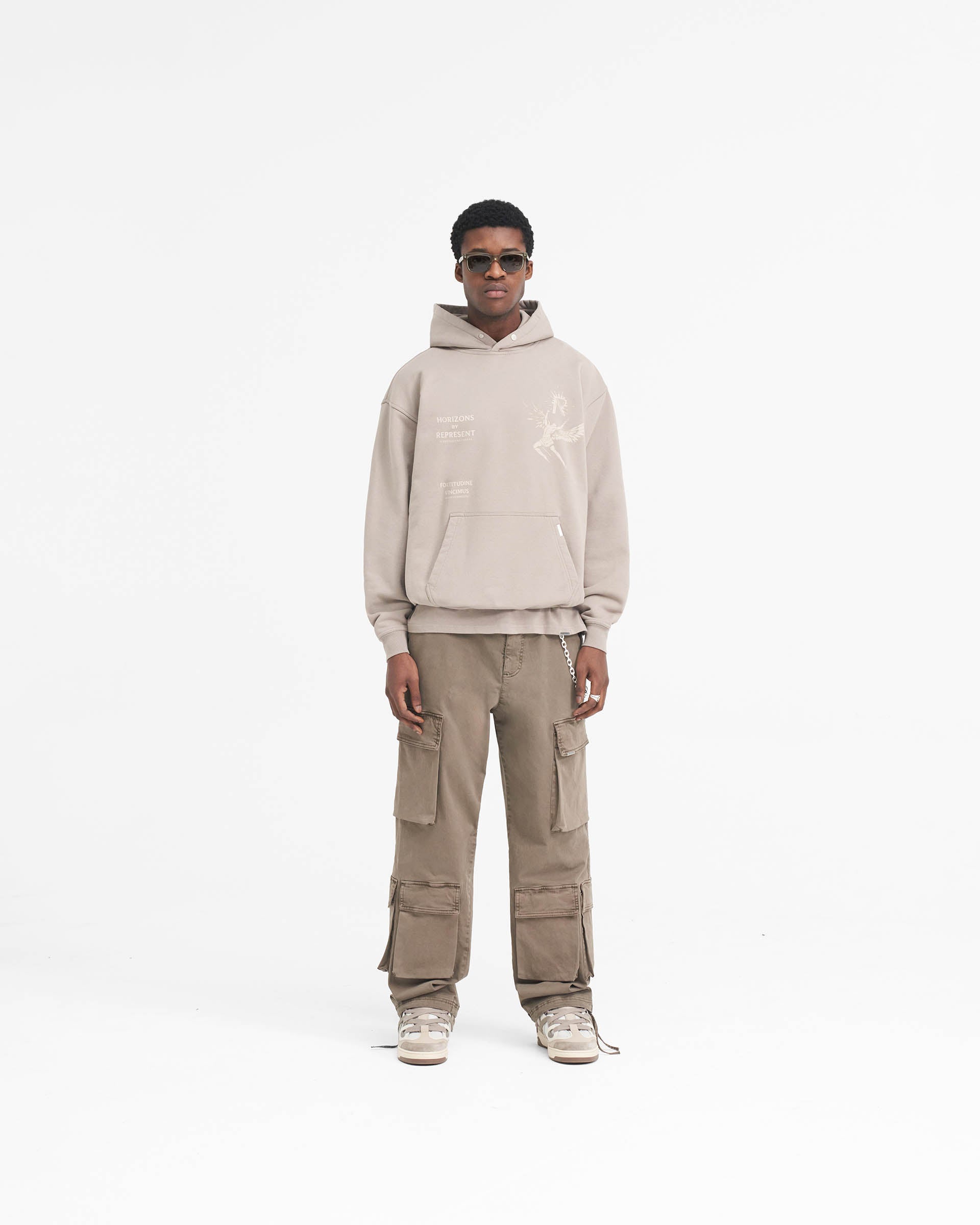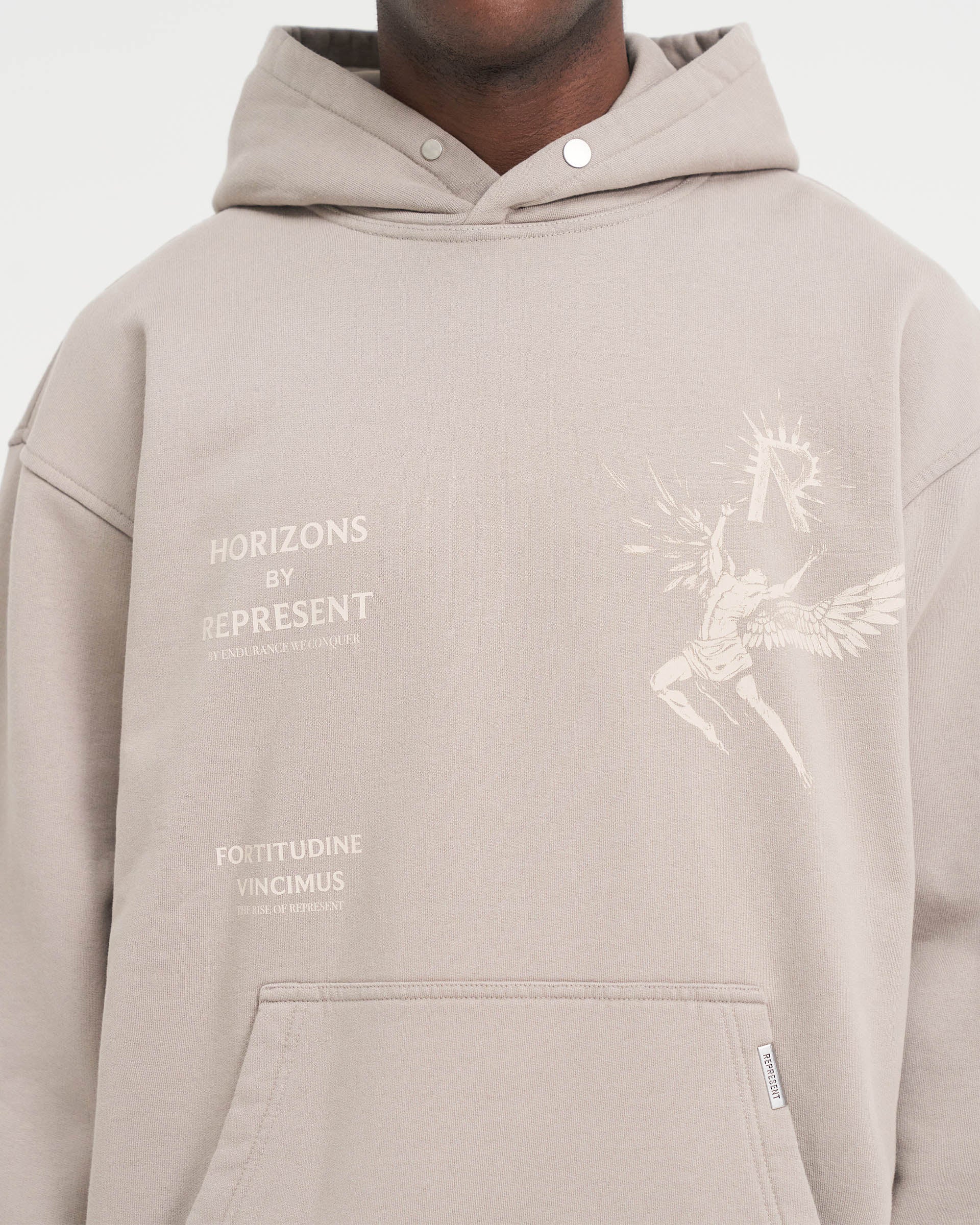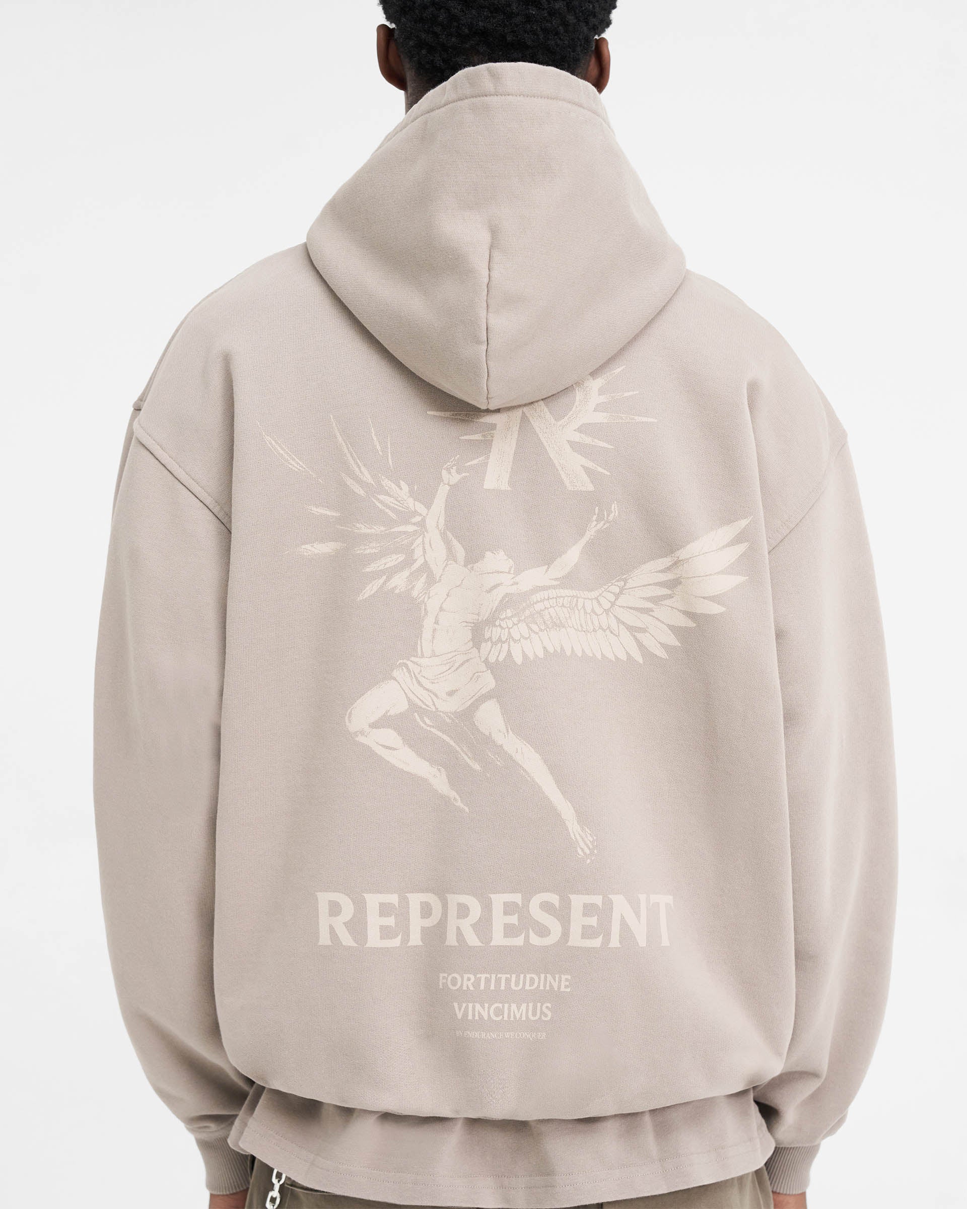 Introducing the Icarus Hoodie in Taupe, a luxury hoodie crafted with an oversized fit. The hoodie has ribbed hem and cuffs and is finished with a Represent metal bar to the pocket and Cobrax popper to the hood.