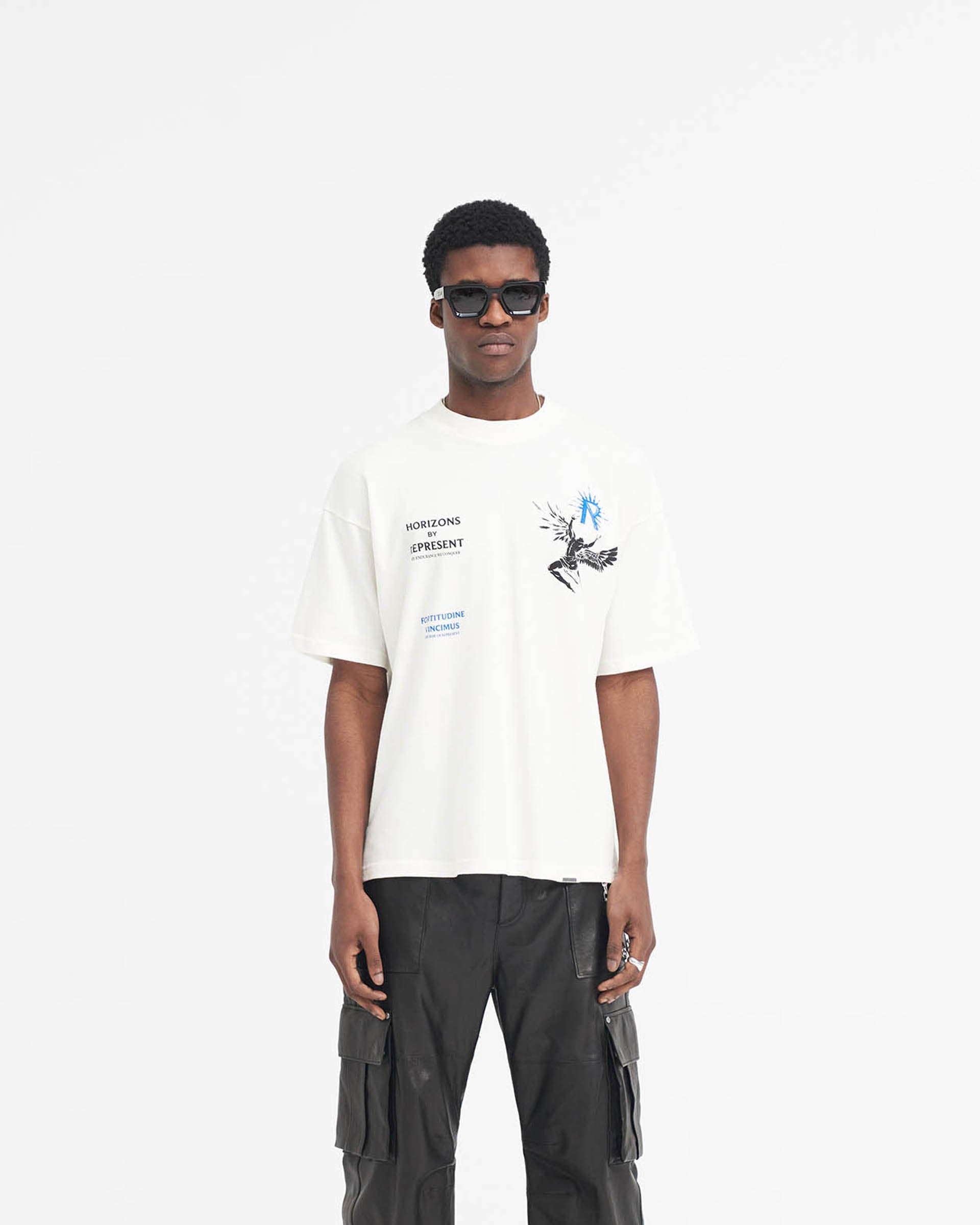 Introducing the Icarus T-Shirt in Flat White, a t-shirt crafted from luxury medium weight cotton, with a slightly oversized fit. It features our Icarus graphic to the front and back and is finished with our Represent metal bar to the hem.