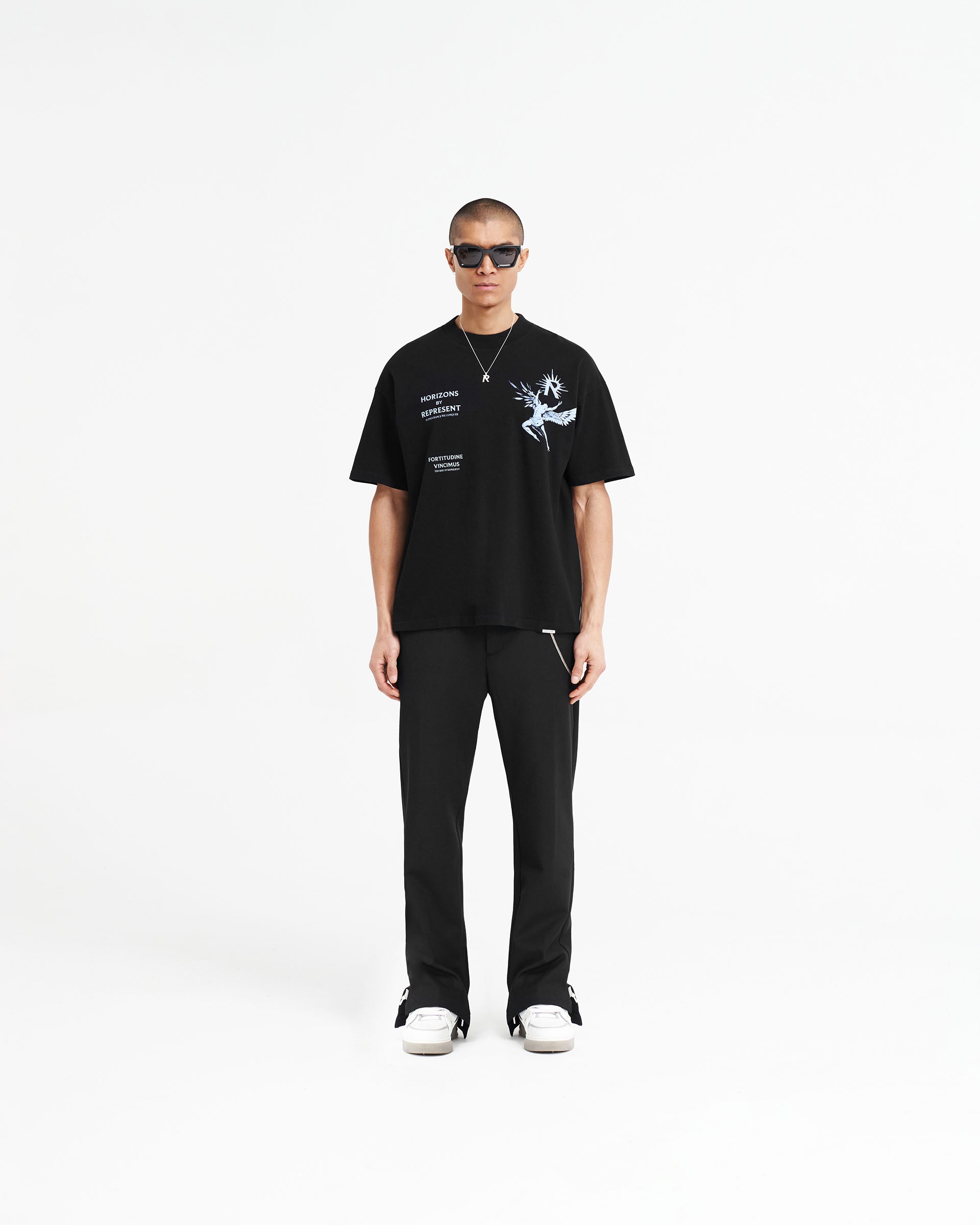 Introducing the Icarus T-Shirt in Jet Black & Blue, a t-shirt crafted from luxury medium weight cotton, with a slightly oversized fit. It features our Icarus graphic to the front and back and is finished with our Represent metal bar to the hem.
