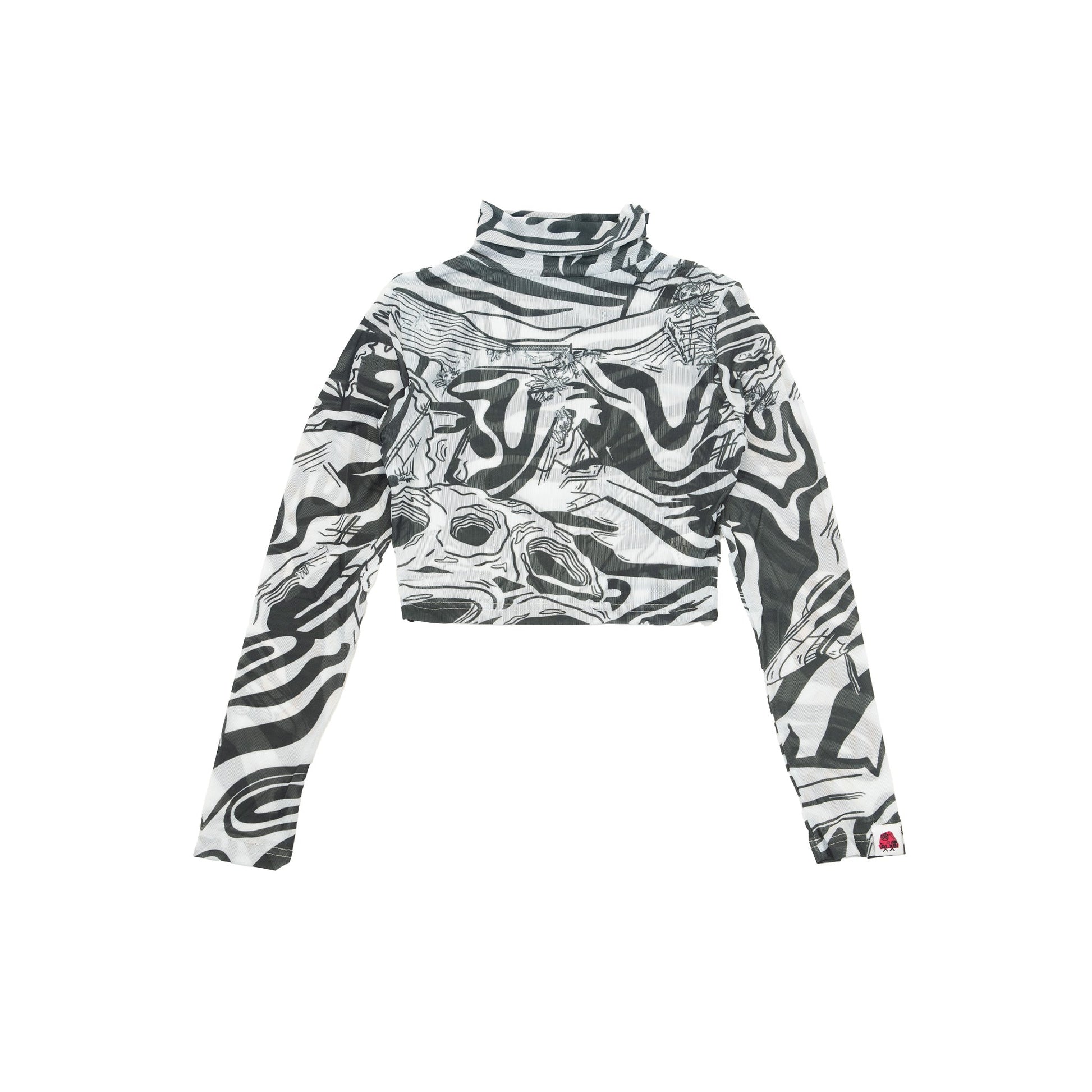 IN THE MESH CROP TOP crafted from 95% Polyester and 5% Spandex. Designed in partnership with Rocking the Daisies. with Milkyway and meteors design.