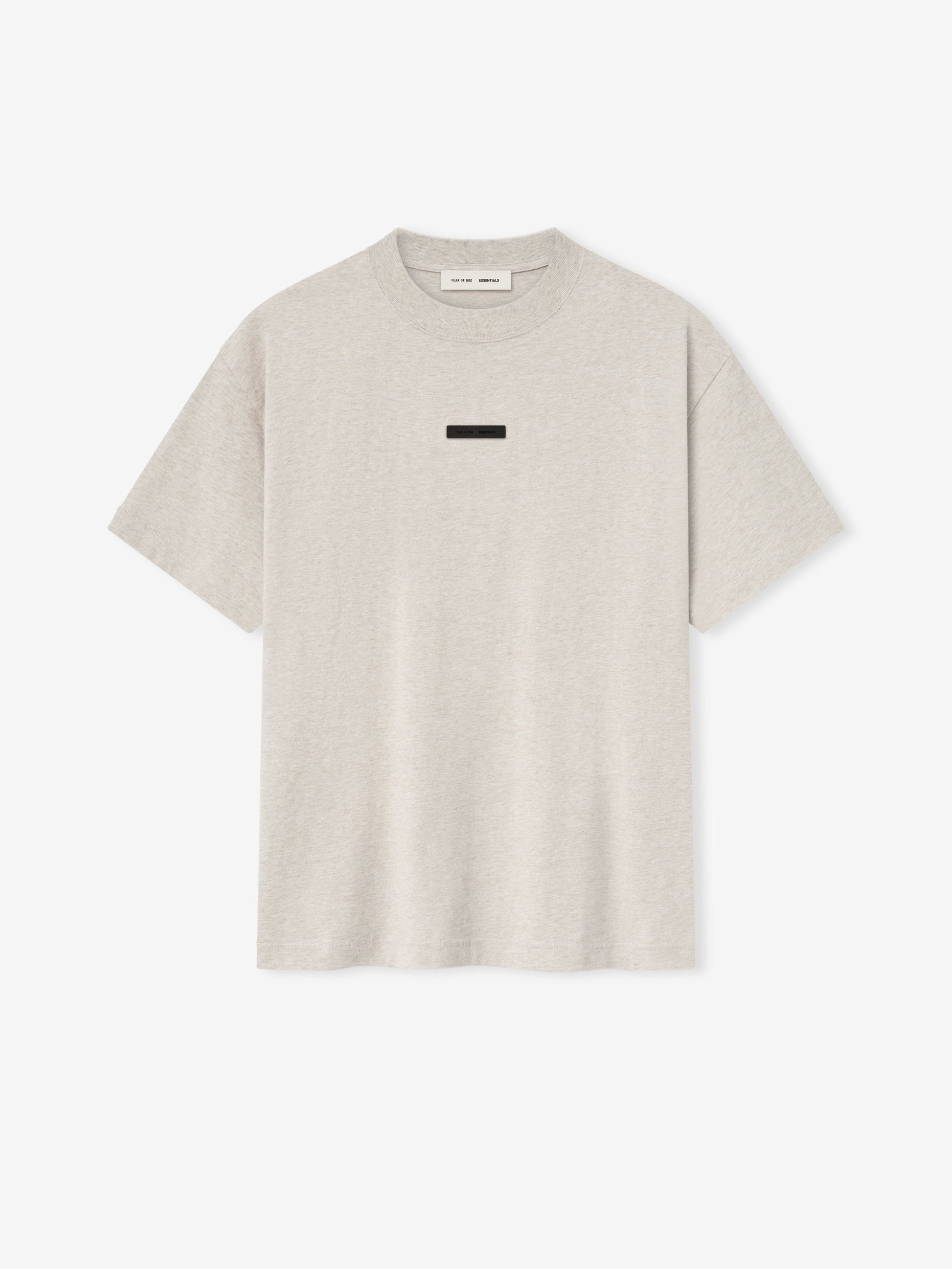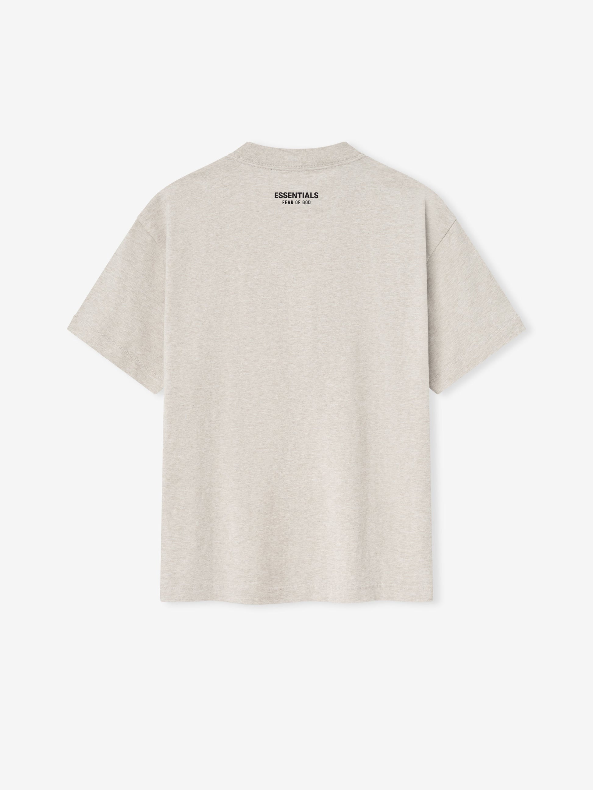 The Lightweight Essential Tee is crafted from lightweight 100% cotton jersey. The rib-knit crewneck tee features a vintage fit to shape more closely to the body with shorter sleeves. Branding includes a "Fear of God Essentials" rubberized label at the center front and the "Essentials Fear of God" logo at the back collar.