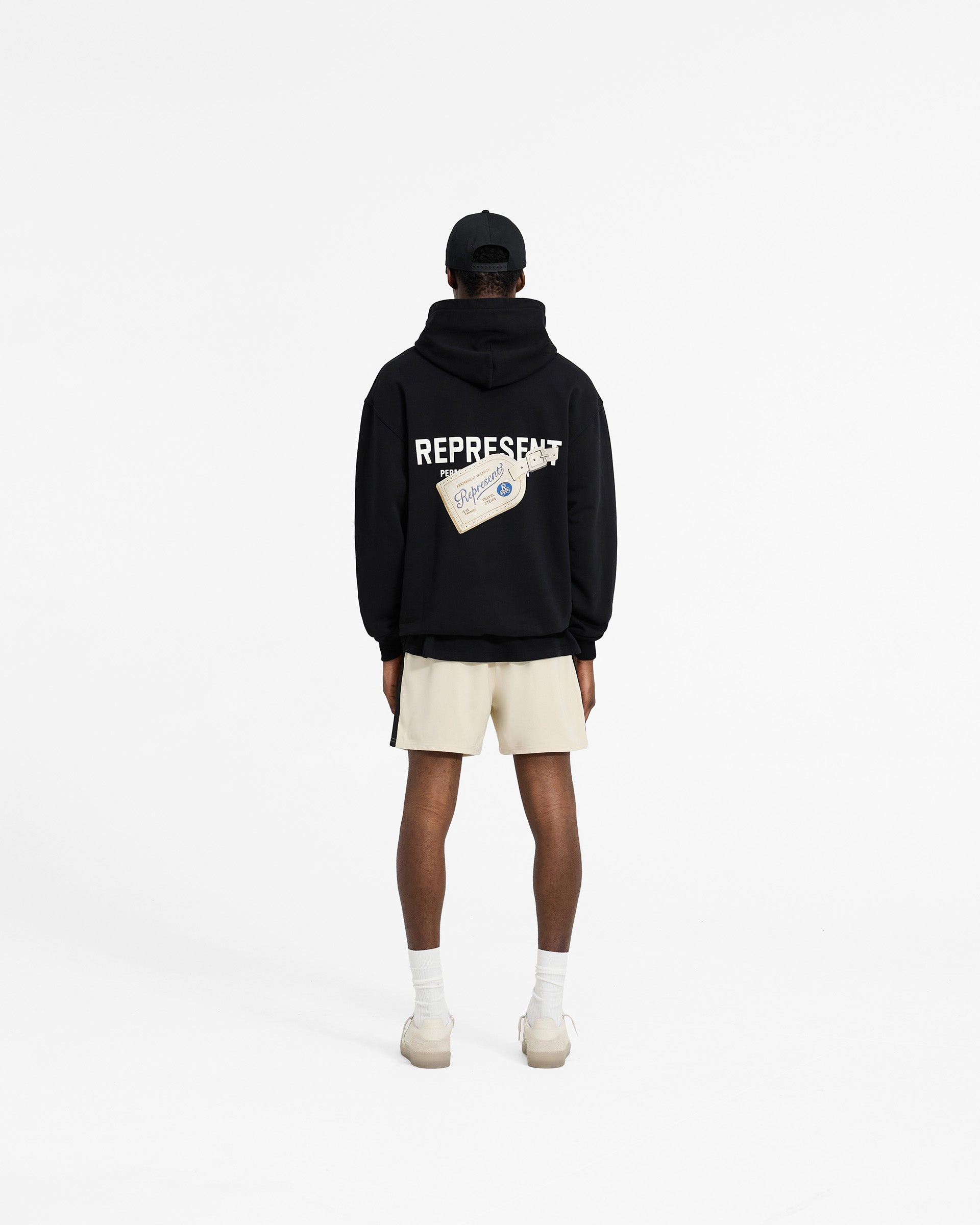 Introducing the Luggage Tag Hoodie in Jet Black, a luxury hoodie crafted with an oversized fit. The hoodie has ribbed hem and cuffs and features our luggage tag screen printed graphic to the front and back. It is finished with a Represent metal bar to the pocket and Cobrax popper to the hood.