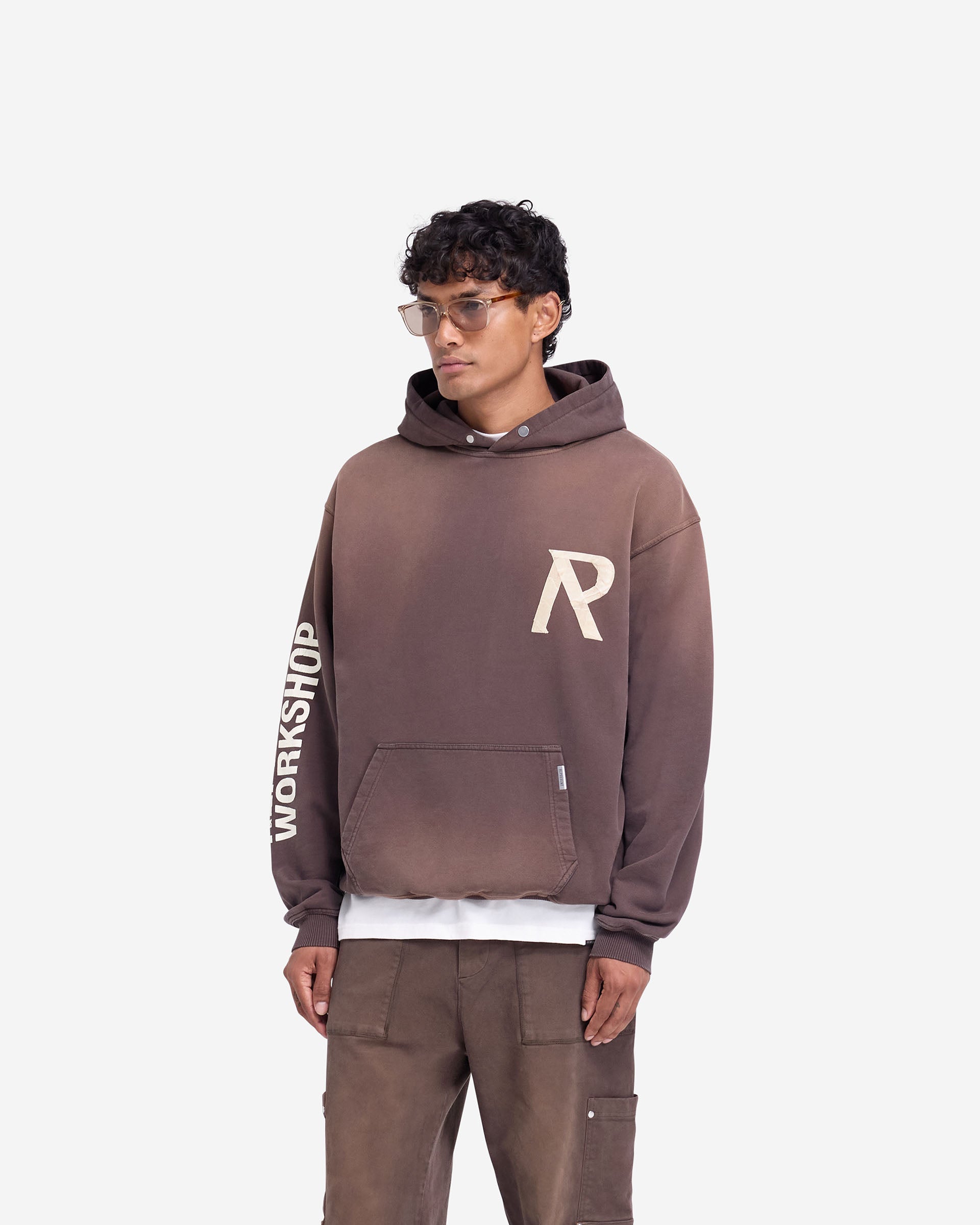 Introducing the Masking Tape Initial Hoodie in Cedar, a luxury slightly oversized hoodie, crafted from heavy weight jersey cotton. The hoodie showcases a 3D masking tape effect Initial to the front and back, with a cracked print to the sleeve. It has a corrosion vintage spray applied to the fabric, creating a vintage hue to the hoodie. It is finished with a Cobrax metal popper to the hood, and a Represent metal bar to the pocket.
