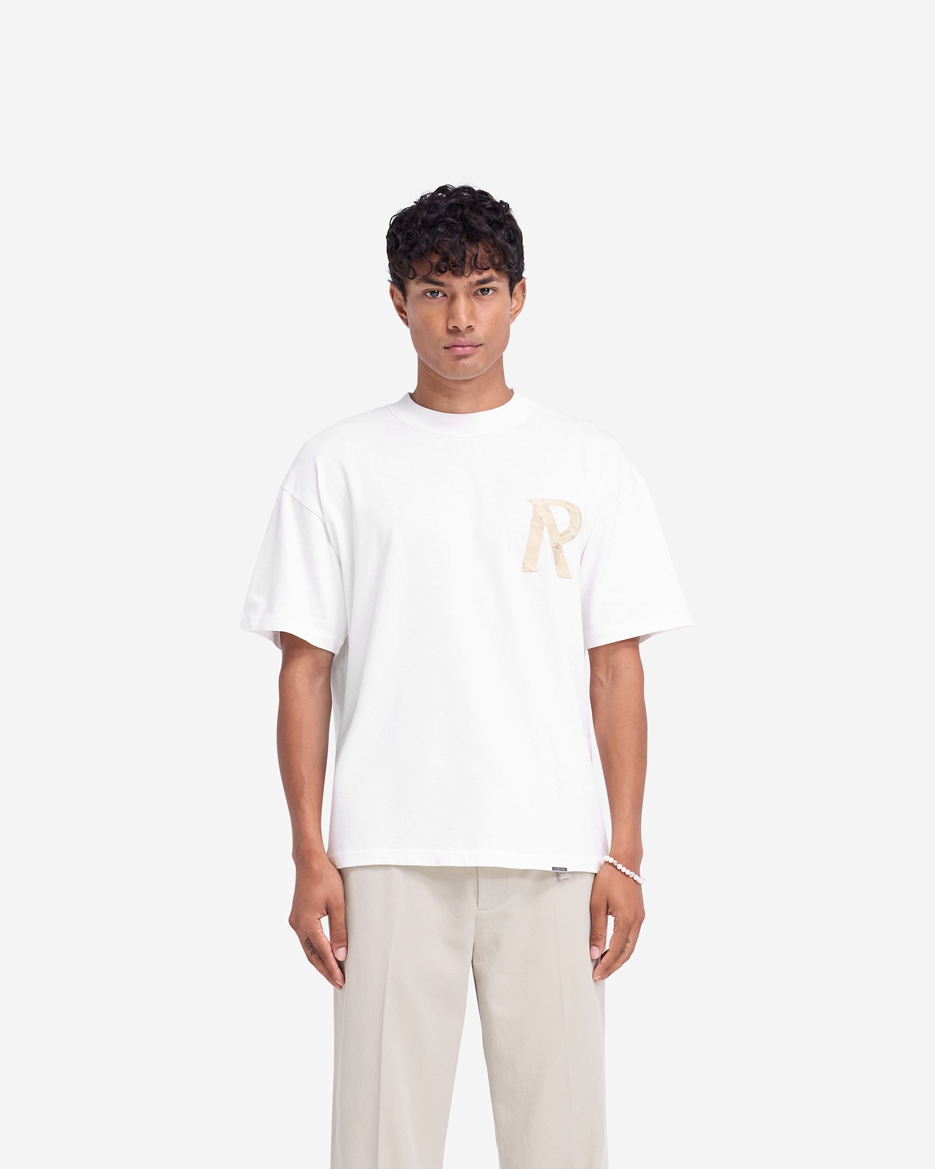 Introducing the Masking Tape Initial T-Shirt in Flat White, a luxury slightly oversized t-shirt, crafted from medium weight jersey cotton. The t-shirt showcases a 3D masking tape effect Initial to the front and back, finished with a Represent metal bar to the hem.