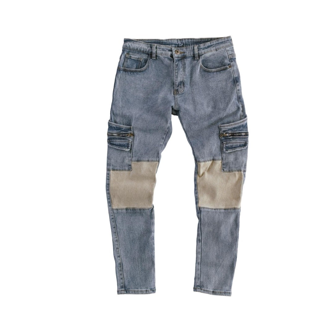 Introducing the Men's Slim fit Utility Patchwork Cargo Denim Jeans. Designed for both style and functionality, these Patchwork Cargo Denim Jeans jeans for men showcase a slim fit for a modern and fashionable look. With utility patchwork and cargo pockets, these jeans offer ample storage space while still maintaining a sleek silhouette.