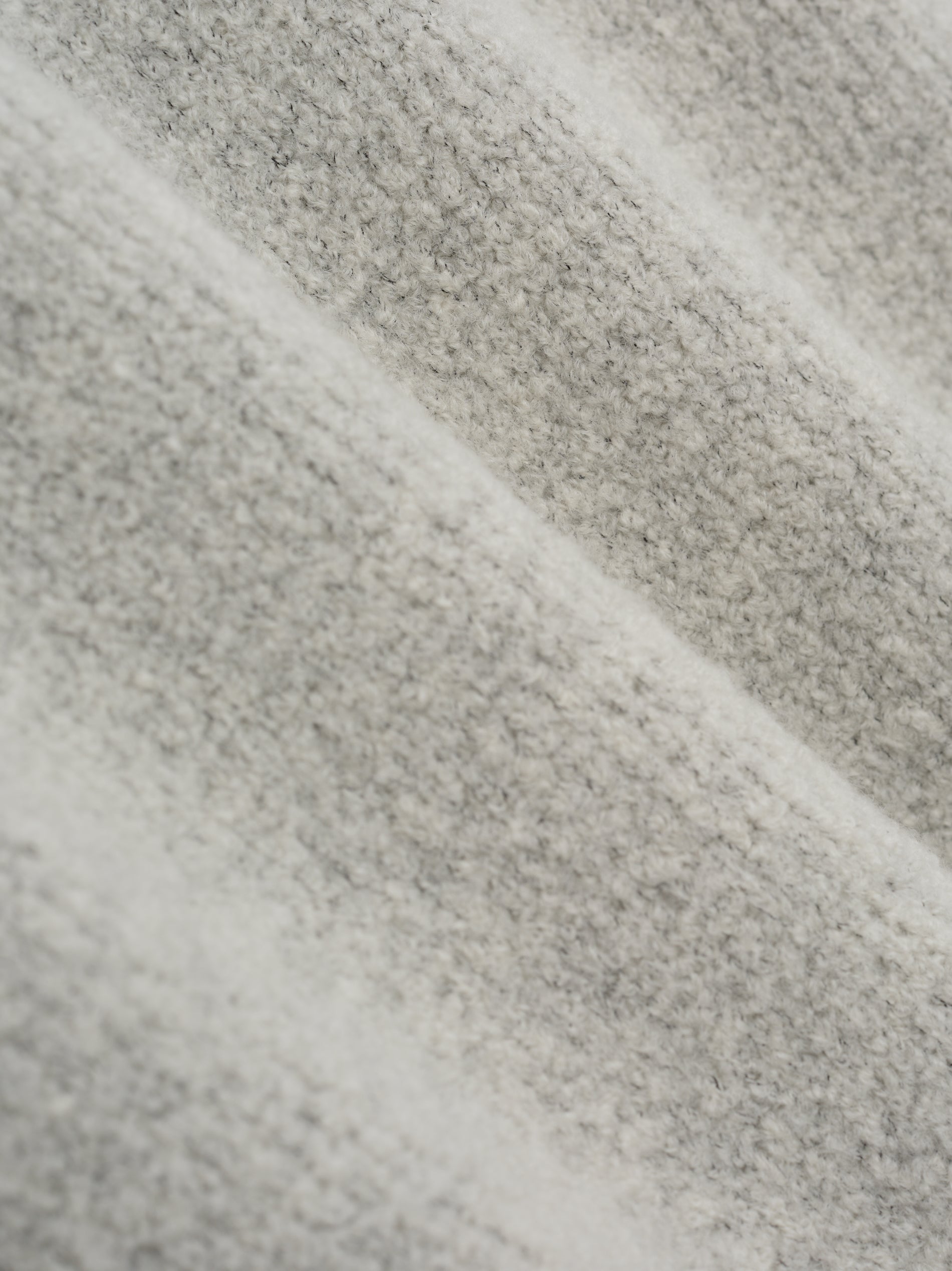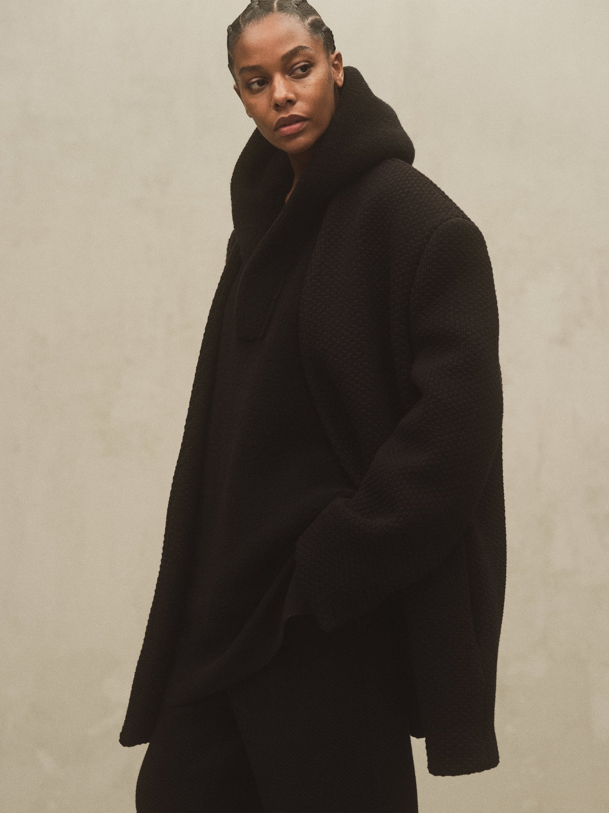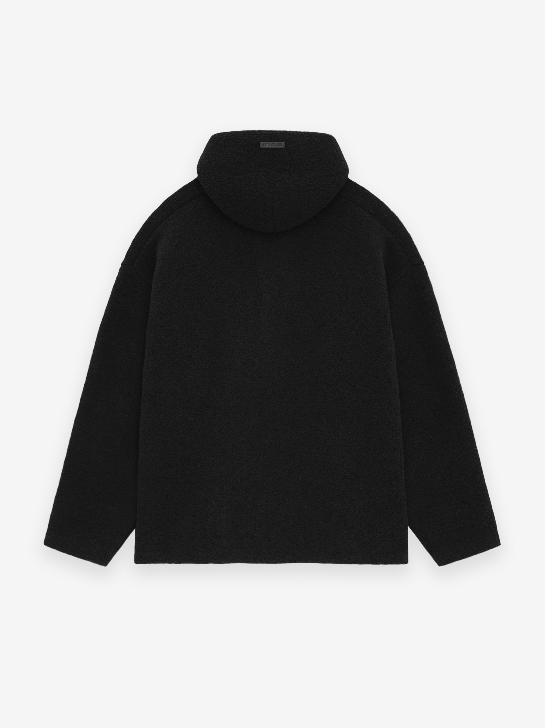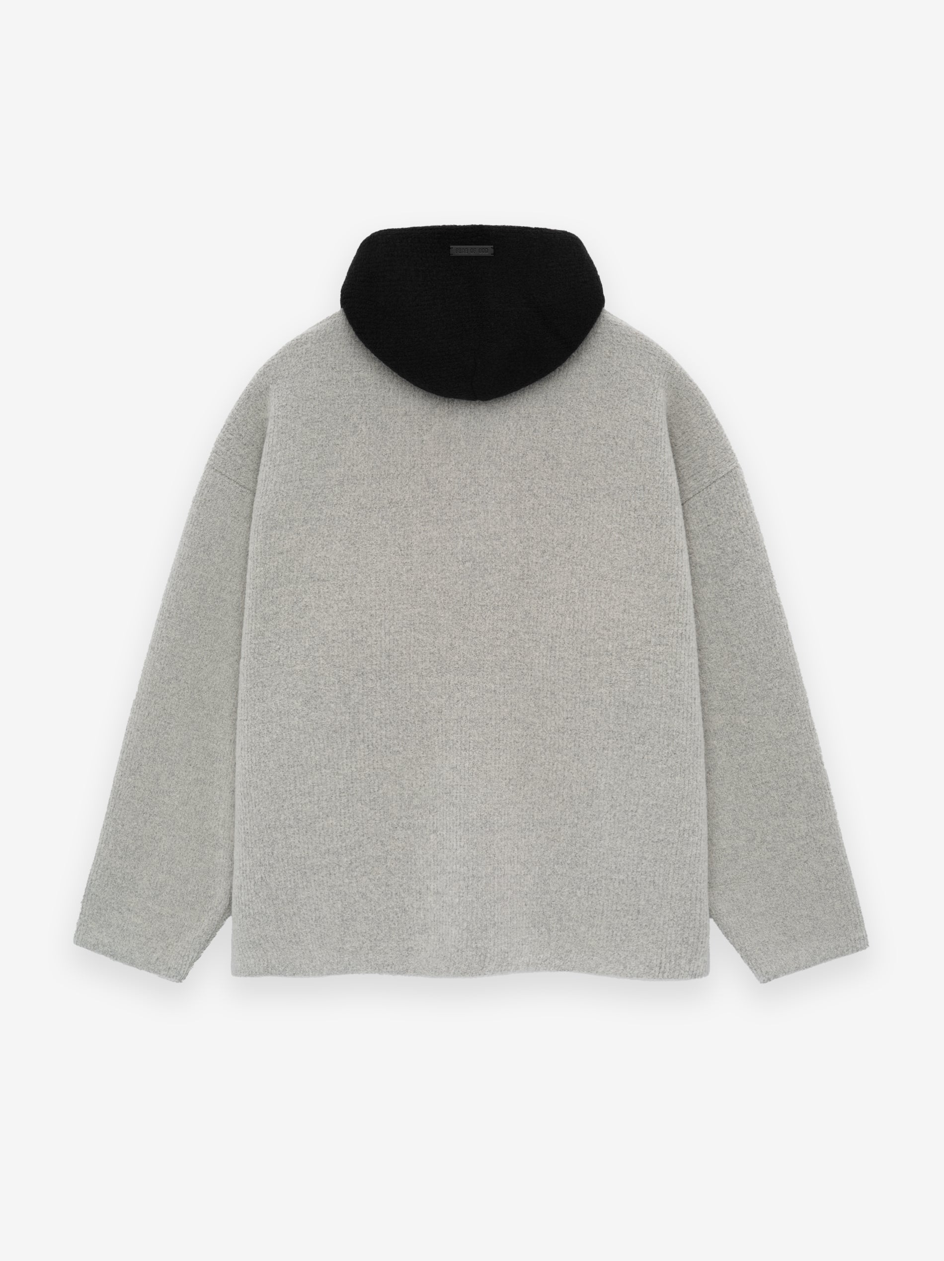 The Polo Hoodie is knitted in Italy from a heavy merino wool blend with a boucle texture. The designed volume in the body and sleeves creates a round silhouette. The polo placket, hood, rib-knit cuffs, and waist hem frame the piece. A Fear of God leather label is stitched at the back collar.