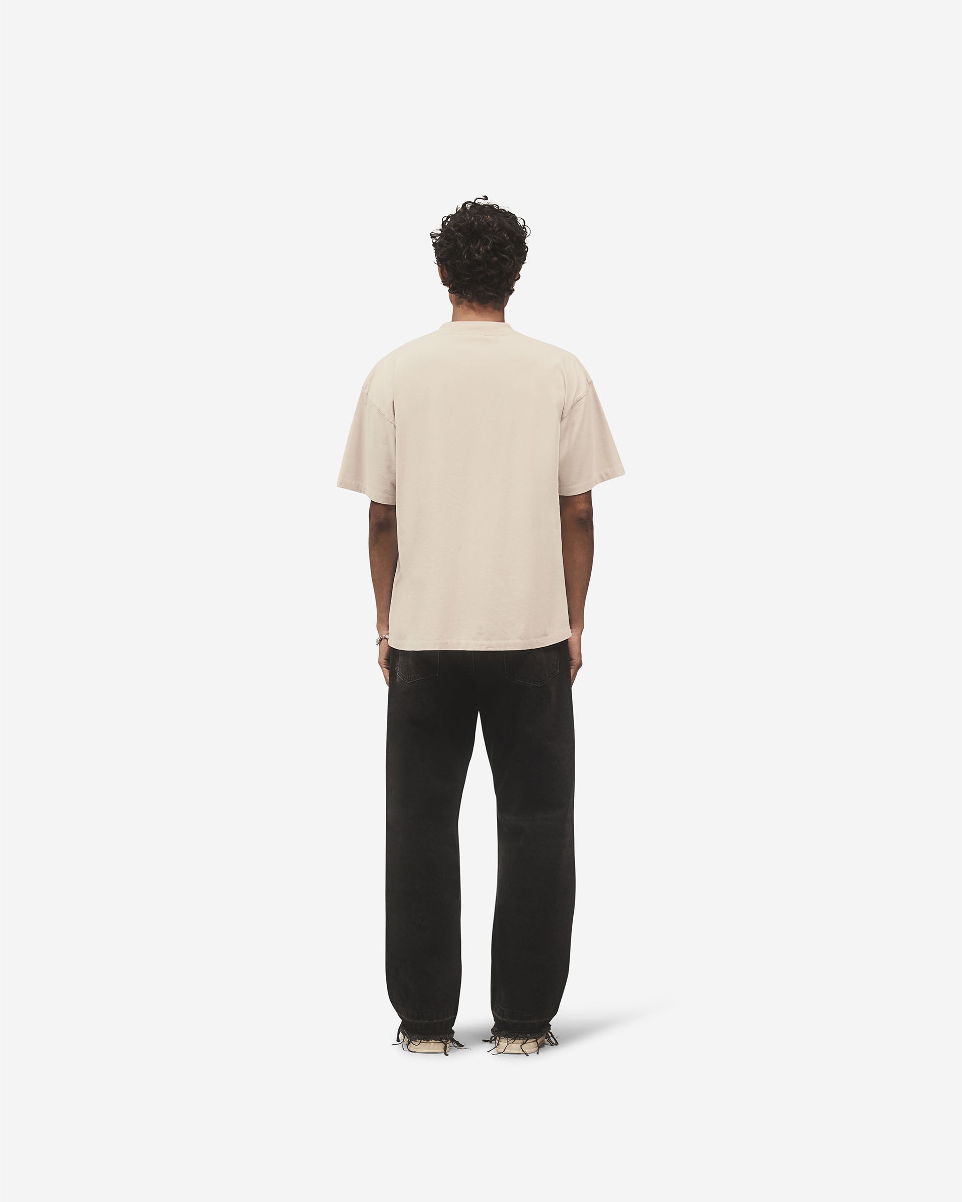 Introducing the Block Logo T-Shirt in Concrete, a slightly oversized t-shirt crafted from soft jersey cotton with a smooth carbon finish for all-day comfort. Featuring a silver metal block logo at the chest, the tee keeps things clean and refined with a minimalist blind hem and our signature Represent metal bar at the hem.