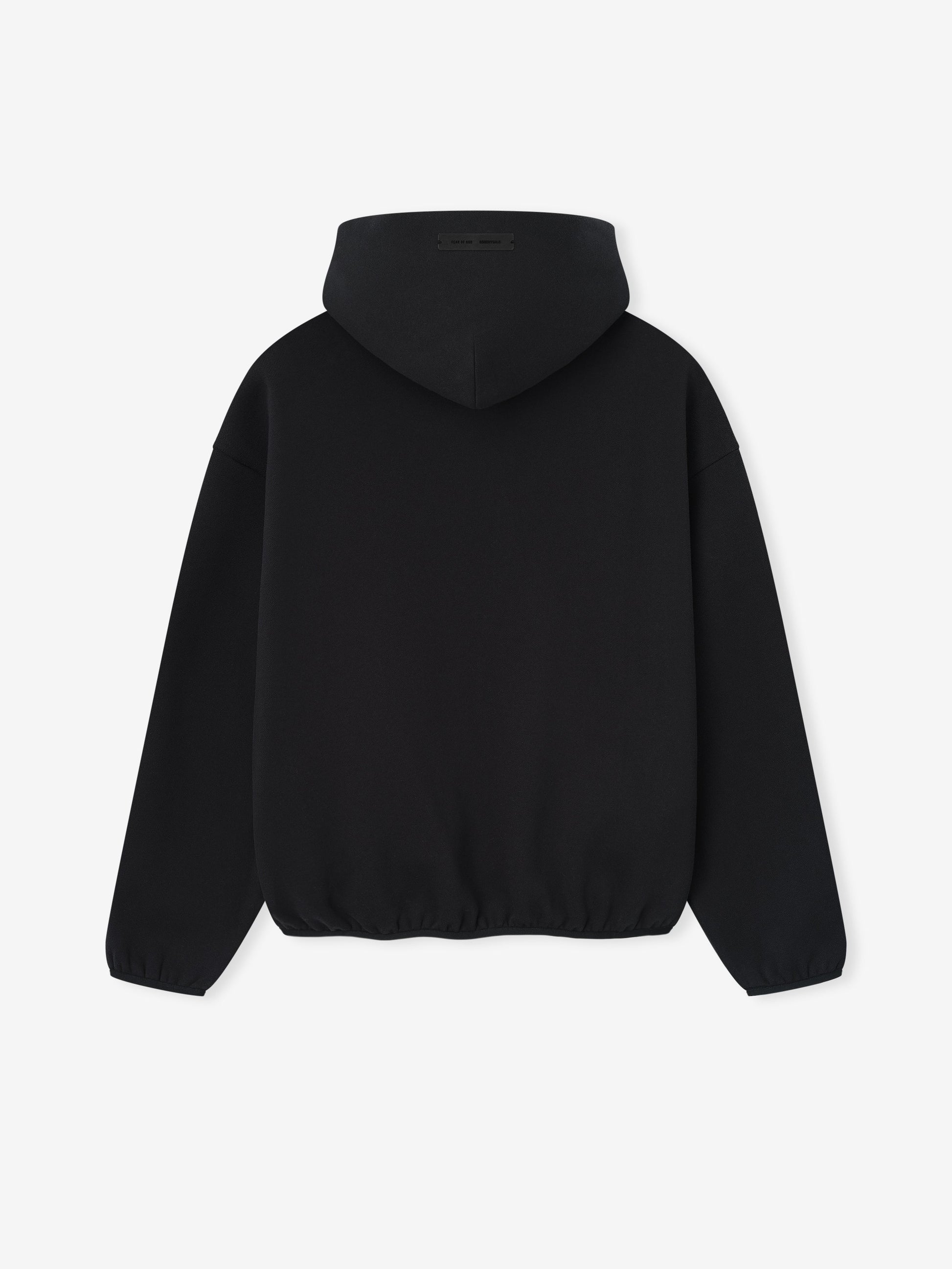 The Modern Hoodie is crafted from 380gsm core fleece, offering exceptional comfort and structure. It features a modern fit forming wider relaxed proportions with a cropped length. The branding is minimalist, showcasing "Fear of God Essentials" rubberized labels on the center front and sleeve. Additional details include a double-layer hoodie, side pockets, and elasticized piping on the cuffs and waist hem.