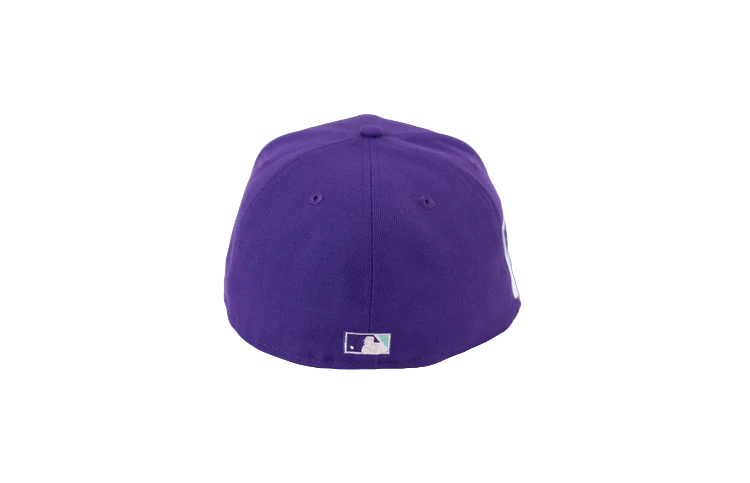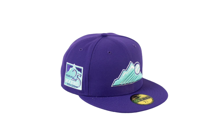 This Custom New Era 59Fifty Fitted Hat celebrates the Colorado Rockies 25th Anniversary. Crafted in the iconic style, it features a True Purple crown with Clear Mint accents. Featuring structured fabric and an embroidered Colorado Rockies logo, this hat is perfect for commemorating the occasion.