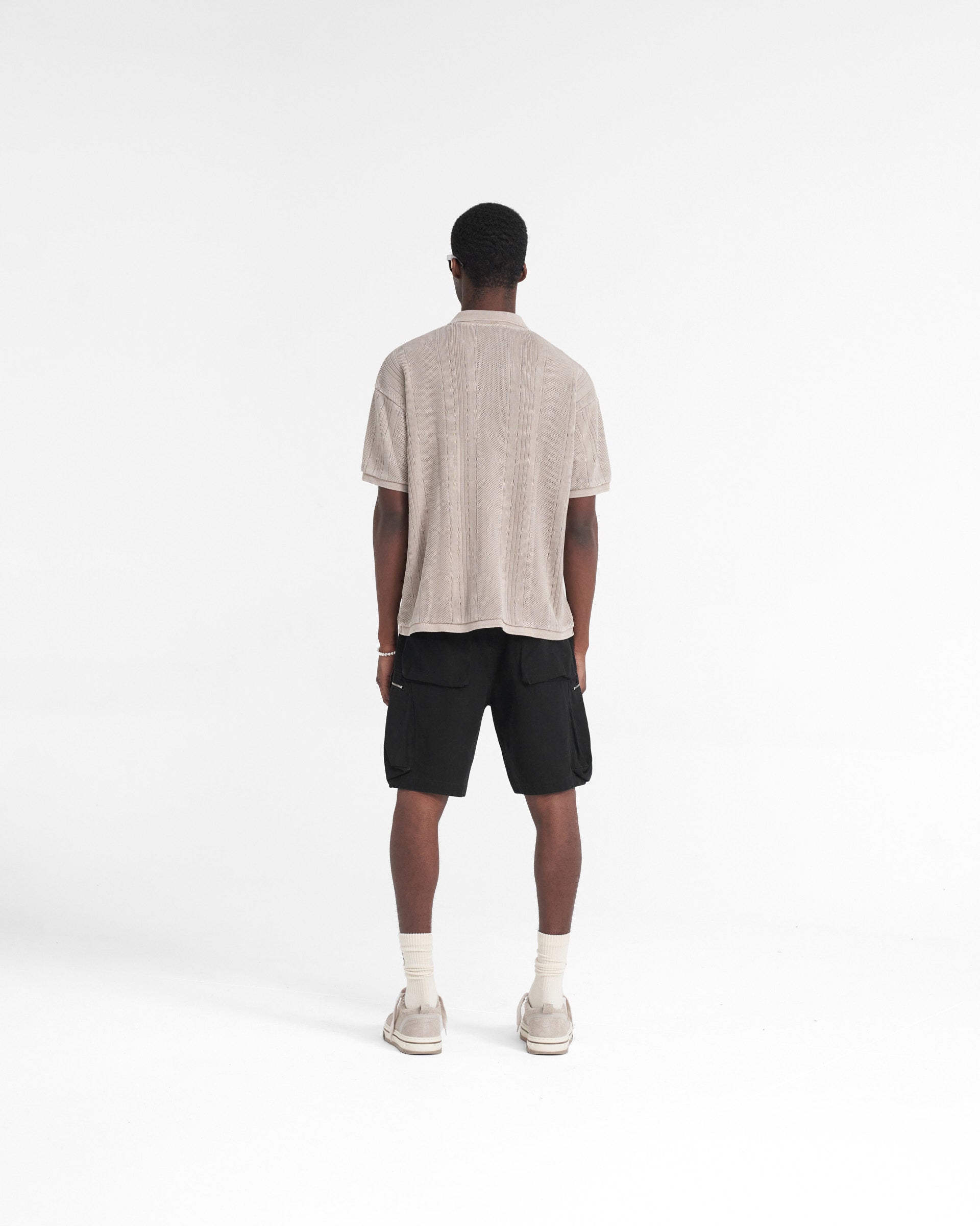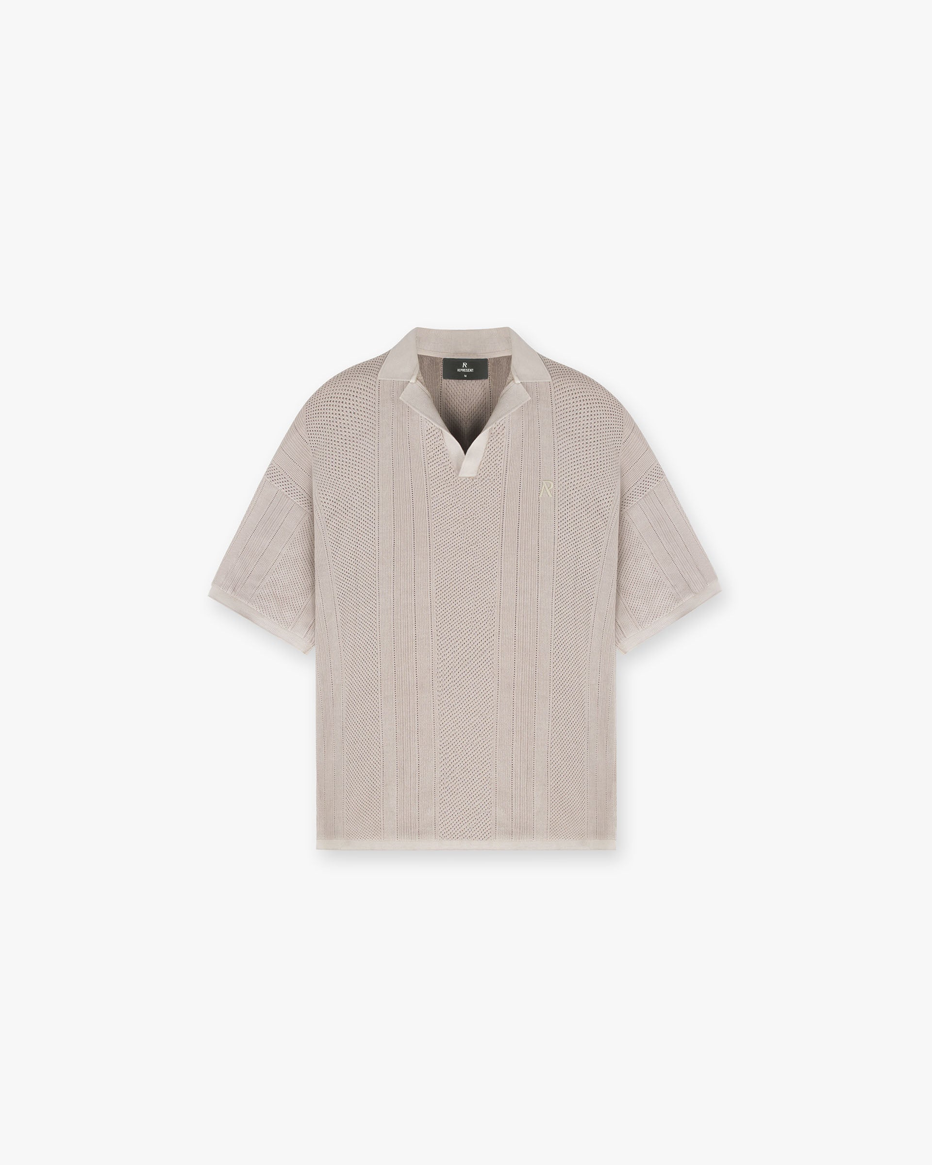 Introducing the Open Stitch Polo in Cashmere, a slightly oversized fit shirt, crafted from a pigment dye, vertical strip, 100% cotton fabric. The shirt has an open polo collar, and is finished with an embroidered Initial logo to the chest.