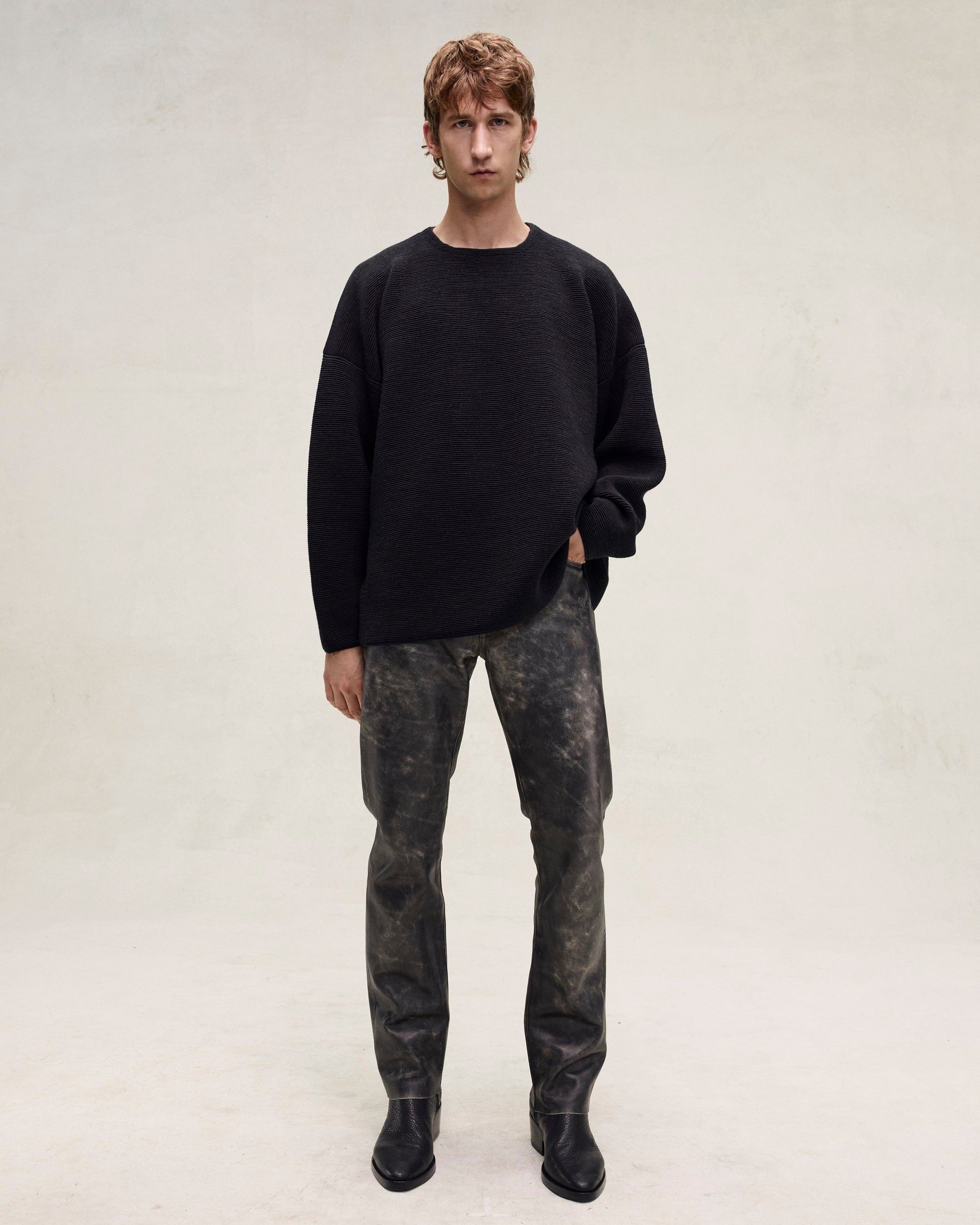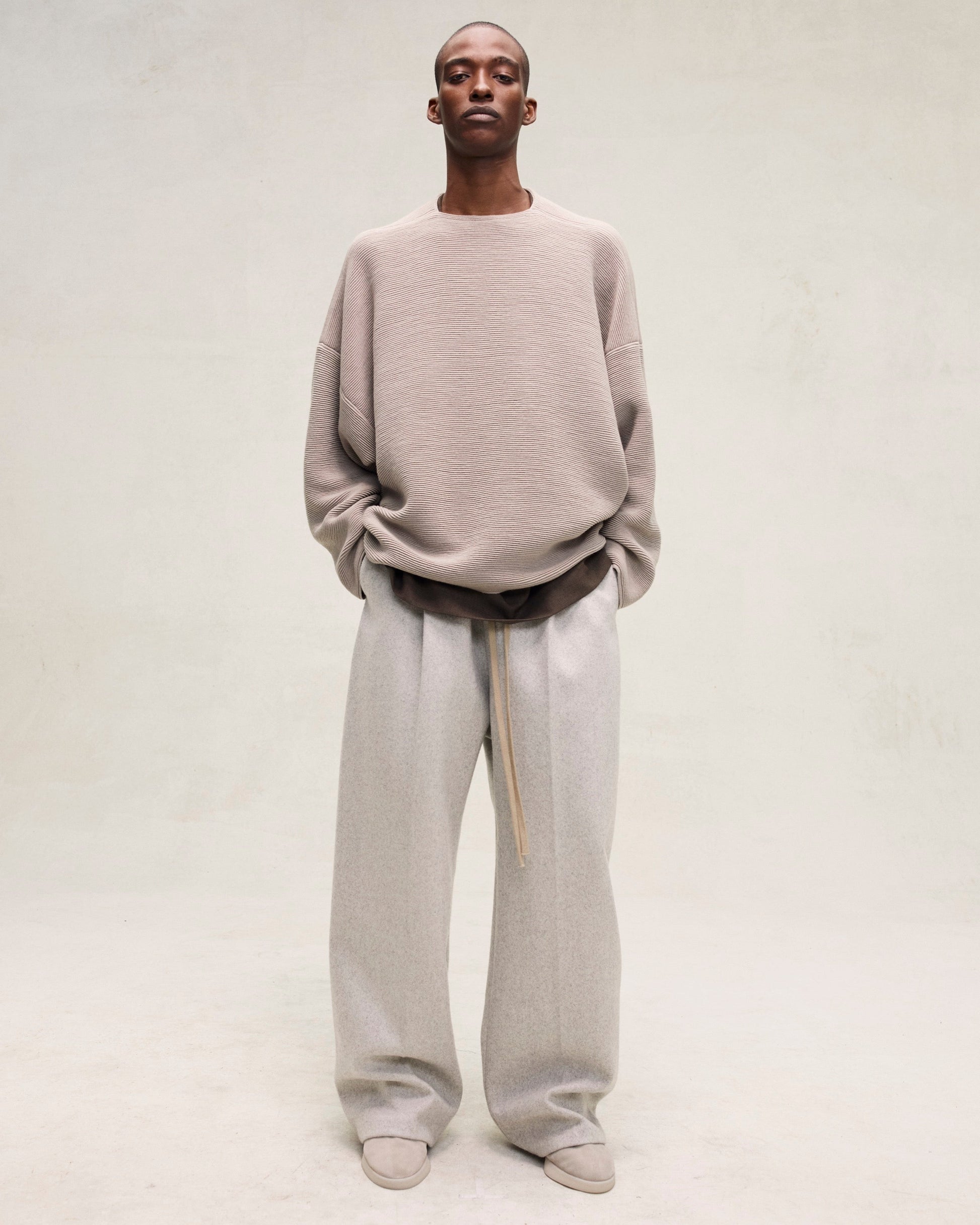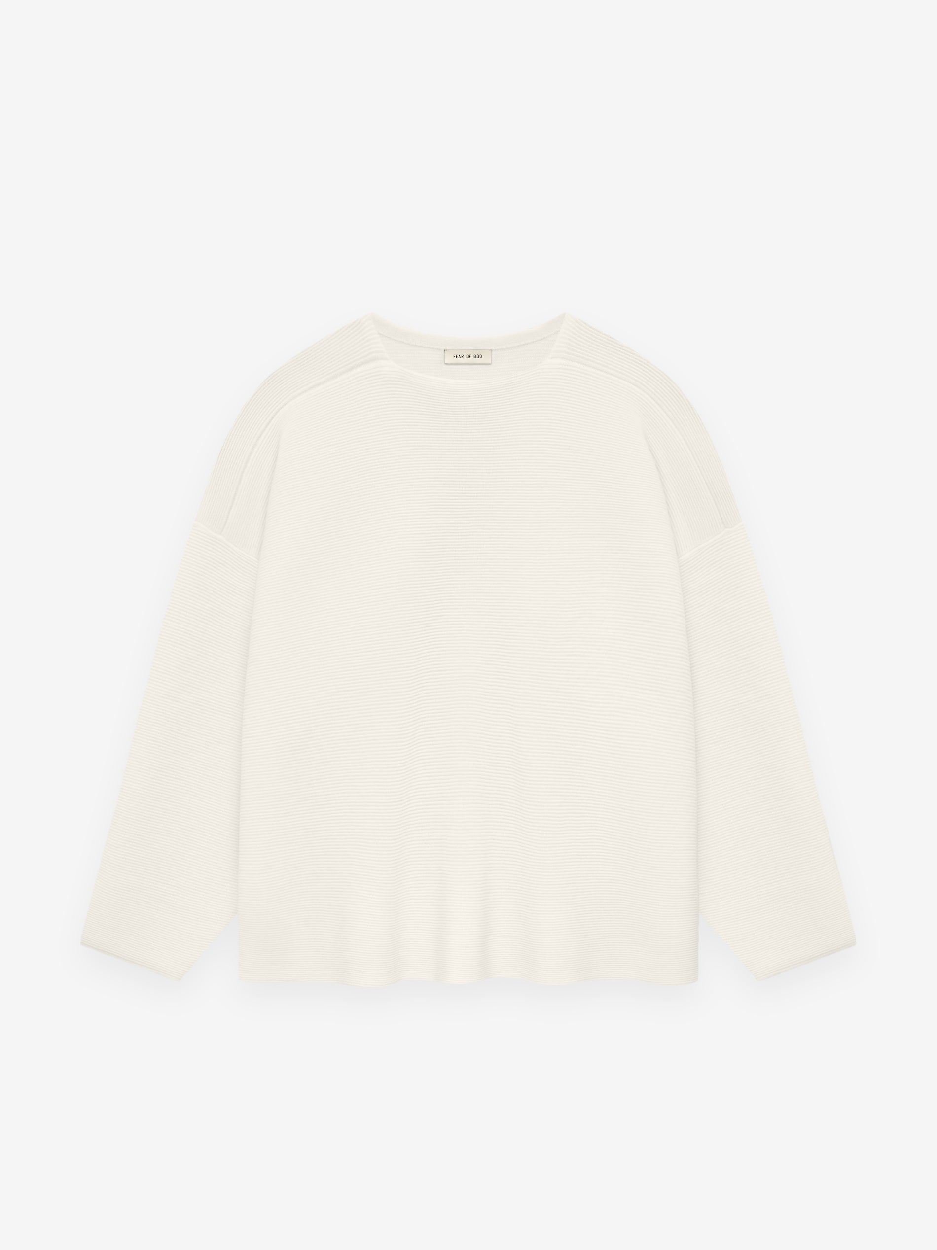 The Ottoman Straight Neck Sweater is knitted in a horizontal rib from virgin wool for compelling texture.The design features a straight neckline with volume in the body and sleeves creating a round silhouette with drape. A Fear of God leather label is stitched at the back collar.