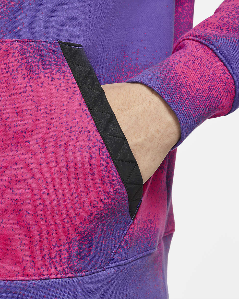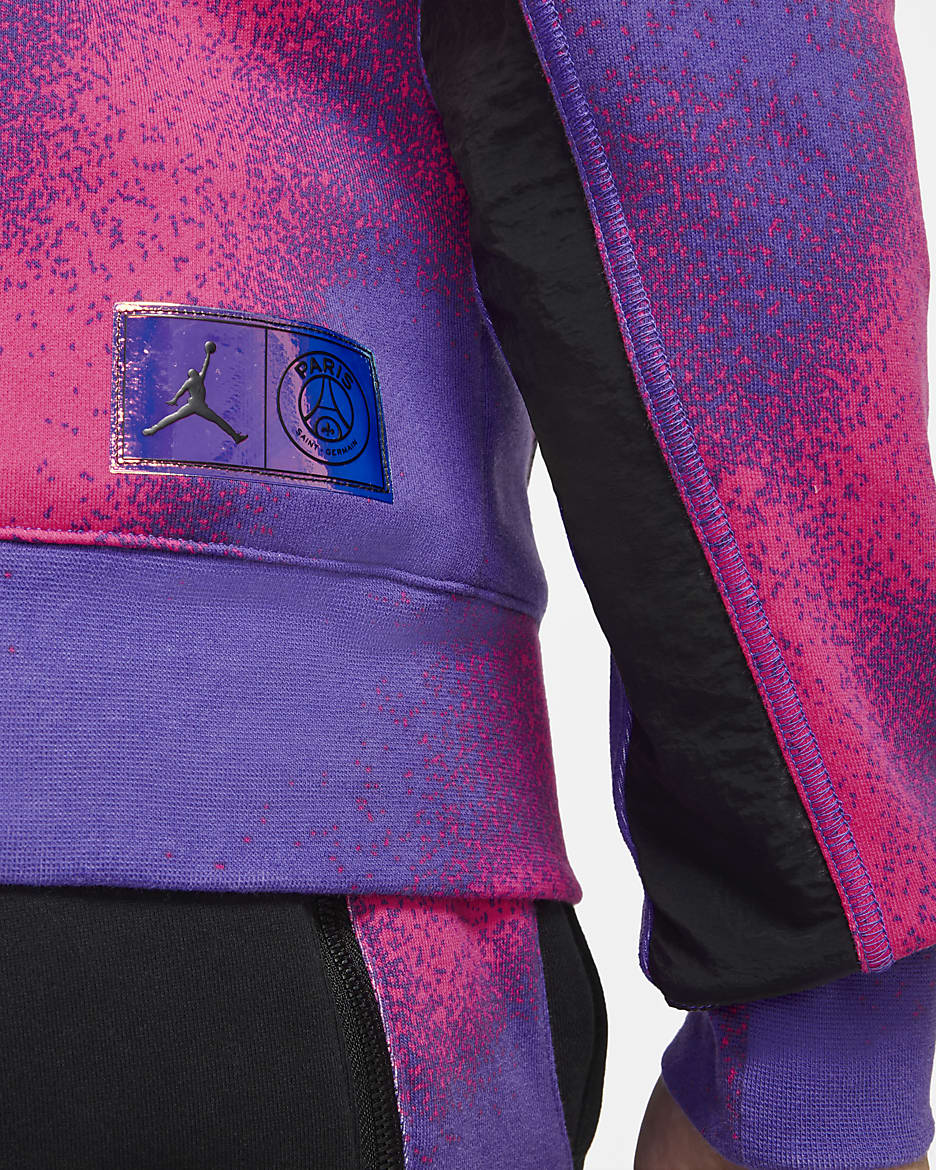 Rep Jordan Brand and French football powerhouse Paris Saint-Germain in this all-over printed pullover hoodie. It features a shiny, iridescent jock tag and an oversized Paris Jumpman crest. Bold, nebula-like colours are inspired by the team's 4th kit.