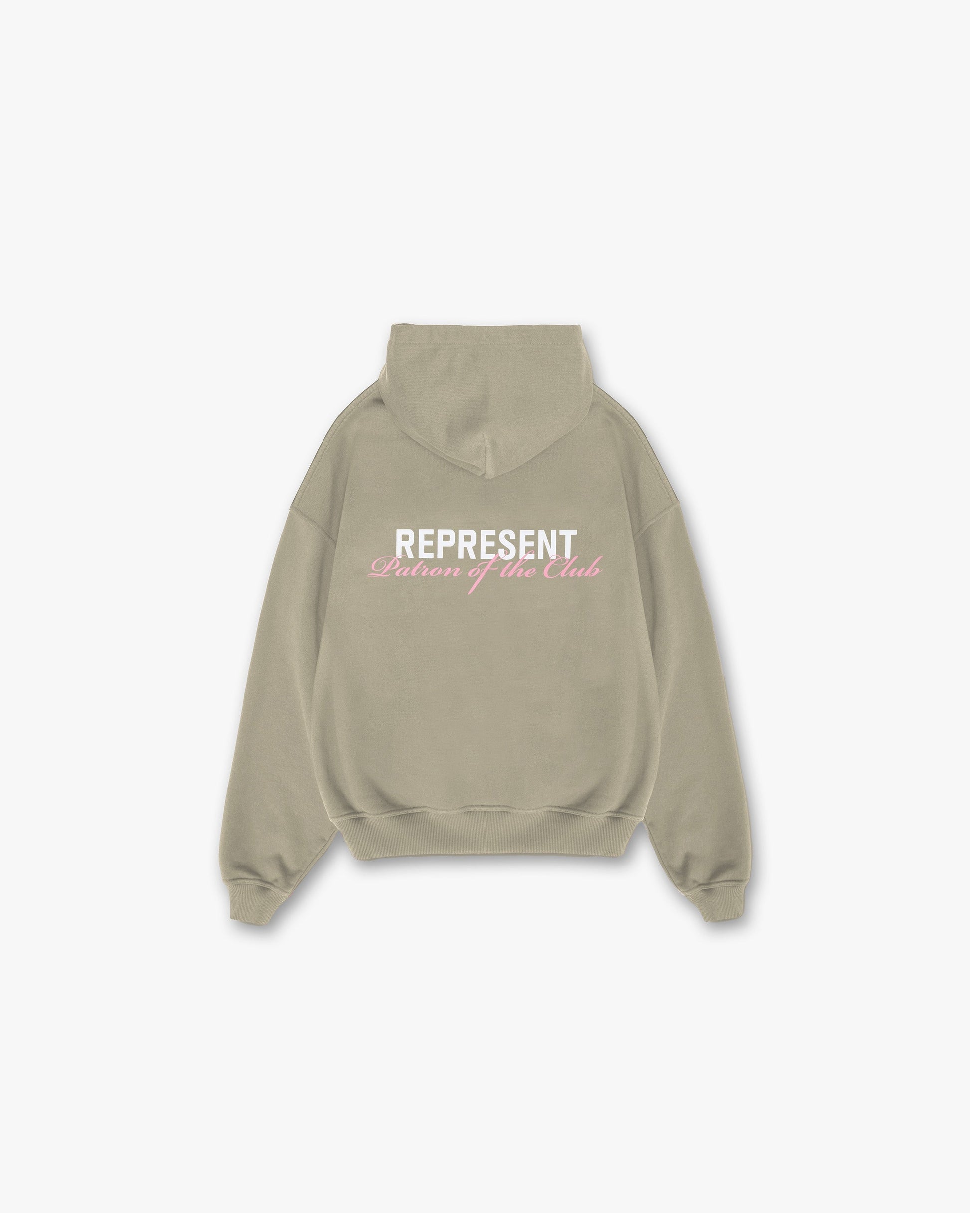 Introducing the Patron of the Club Hoodie in Khaki Pink a luxury hoodie with an oversized fit, crafted from heavy weight jersey cotton. Super soft, pre-shrunk and piece dyed for the ultimate jersey. Ribbed hem & cuffs and featuring our Patron of the Club print to the chest & back. The hoodie is finished with a Represent metal bar to the pocket.