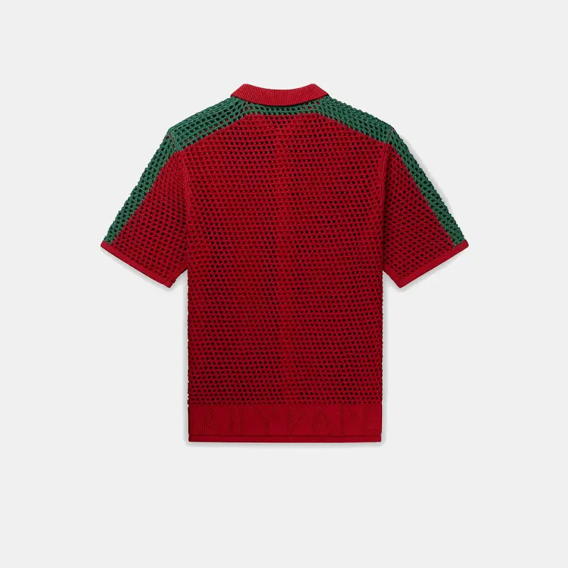The Petiri short sleeve shirt is made from soft cotton with a crochet technique. Equipped with dropped shoulders, a traditional polo collar with buttons and a 3D knitted logotype at the bottom.