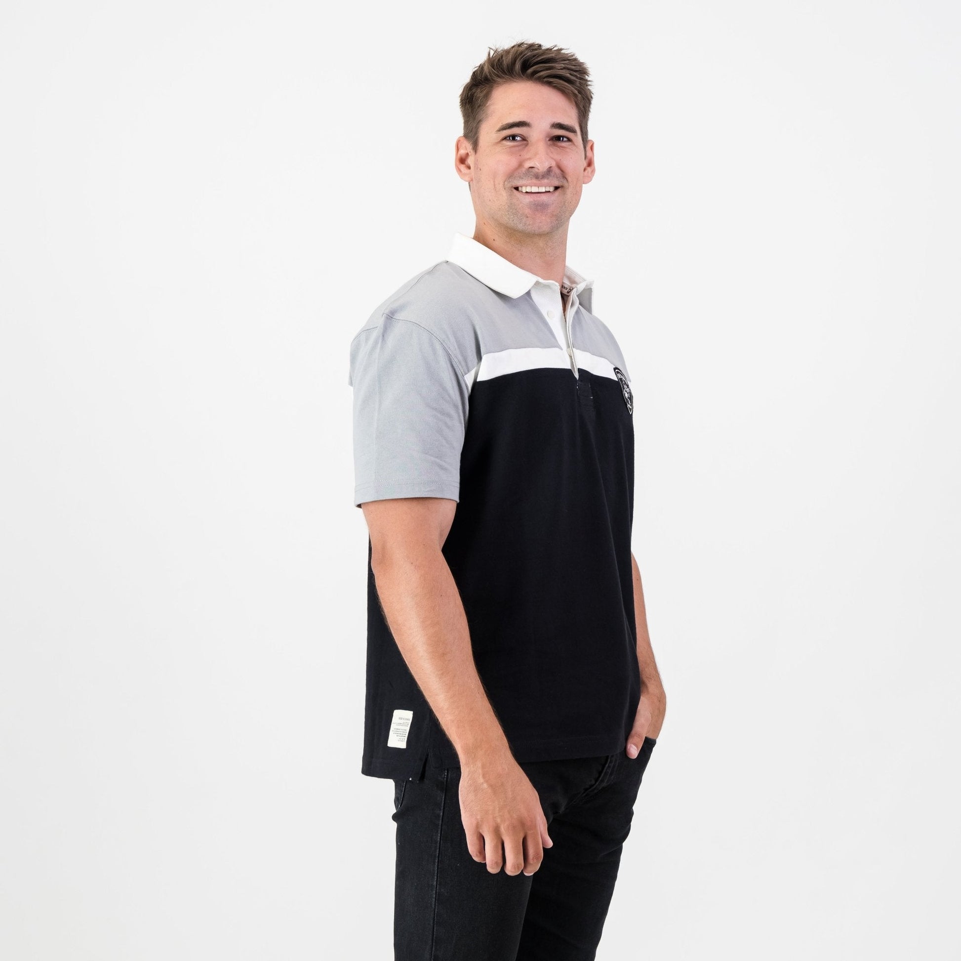 Attention, Sharks supporters! The new updated short sleeve jersey has arrived, crafted from the 100% heavyweight cotton you know and love. This stylish jersey features the Sharks emblem beautifully embroidered on the wearer’s left chest, complemented by cut-and-sew panels in striking black, grey, and white.