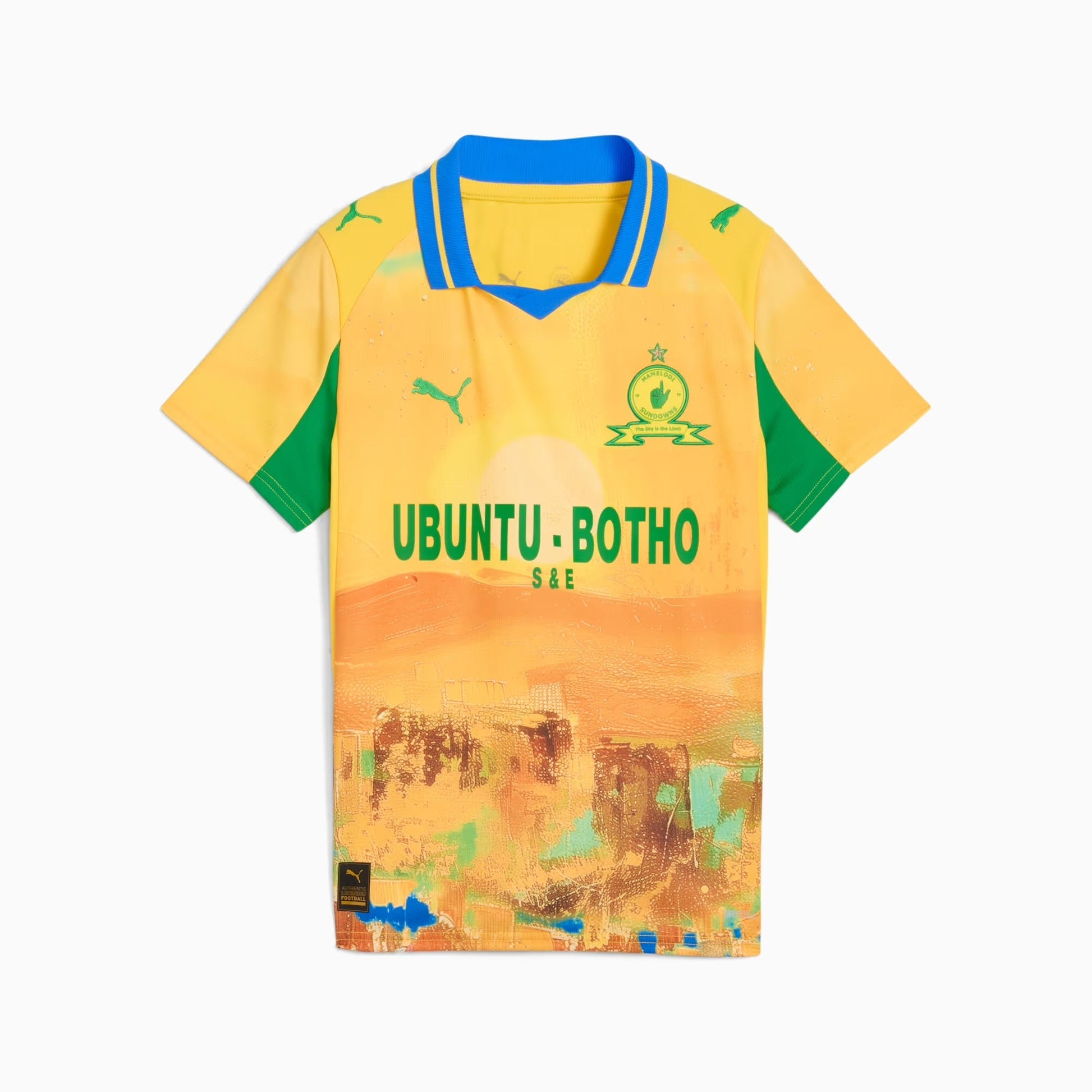 Tshwane’s evening sky hits different. In the PUMA x KIDSUPER collaboration, the Mamelodi Sundowns Home Kit does the same – blending warm, sunlit tones with cooler shades to reflect the club’s signature style. The result captures the rhythm, energy, and joy of Sundowns football, known locally as “shoeshine and piano.”