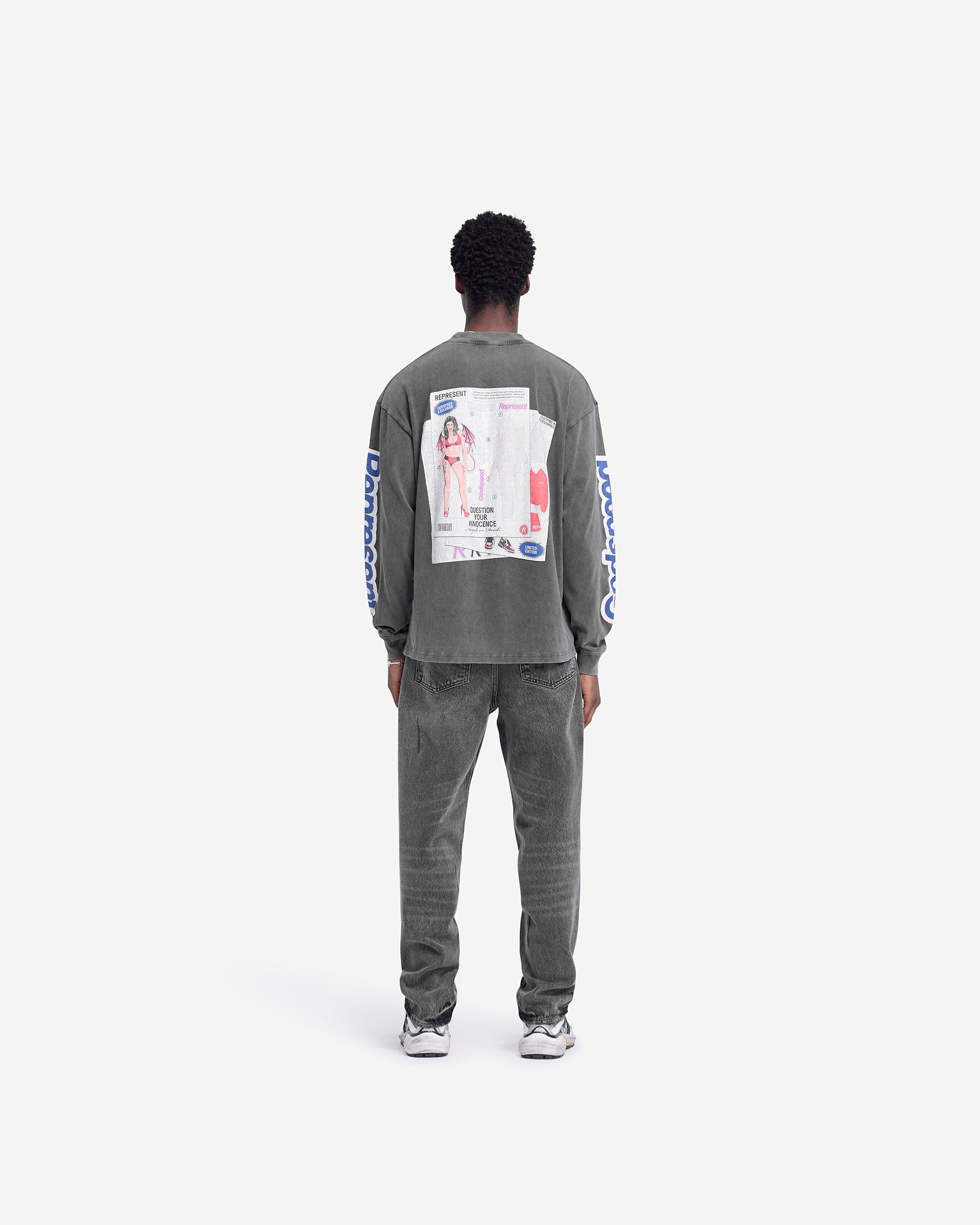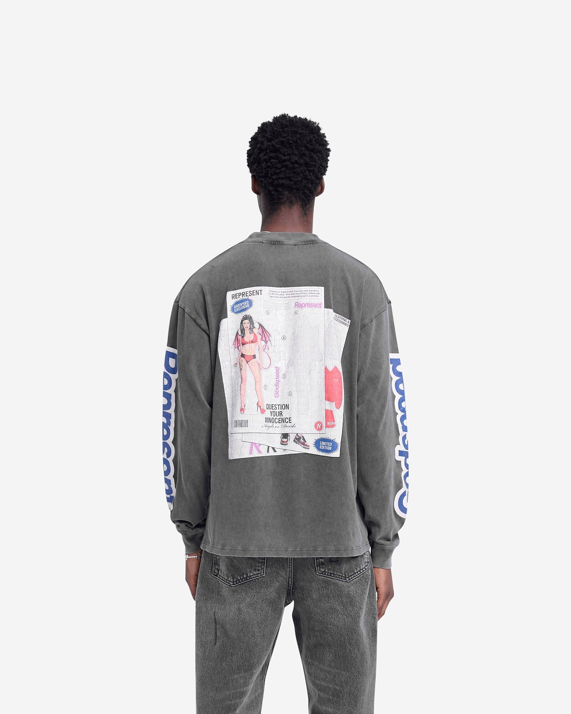 Introducing the Question Your Innocence Long Sleeve T-Shirt in Vintage Grey, a luxury slightly oversized t-shirt crafted from medium weight jersey cotton. The t-shirt has a fade out wash for a vintage look with a cracked print graphic to the front, back and sleeves. It is finished with an overlaid collar detail and a Represent metal bar logo to the hem.
