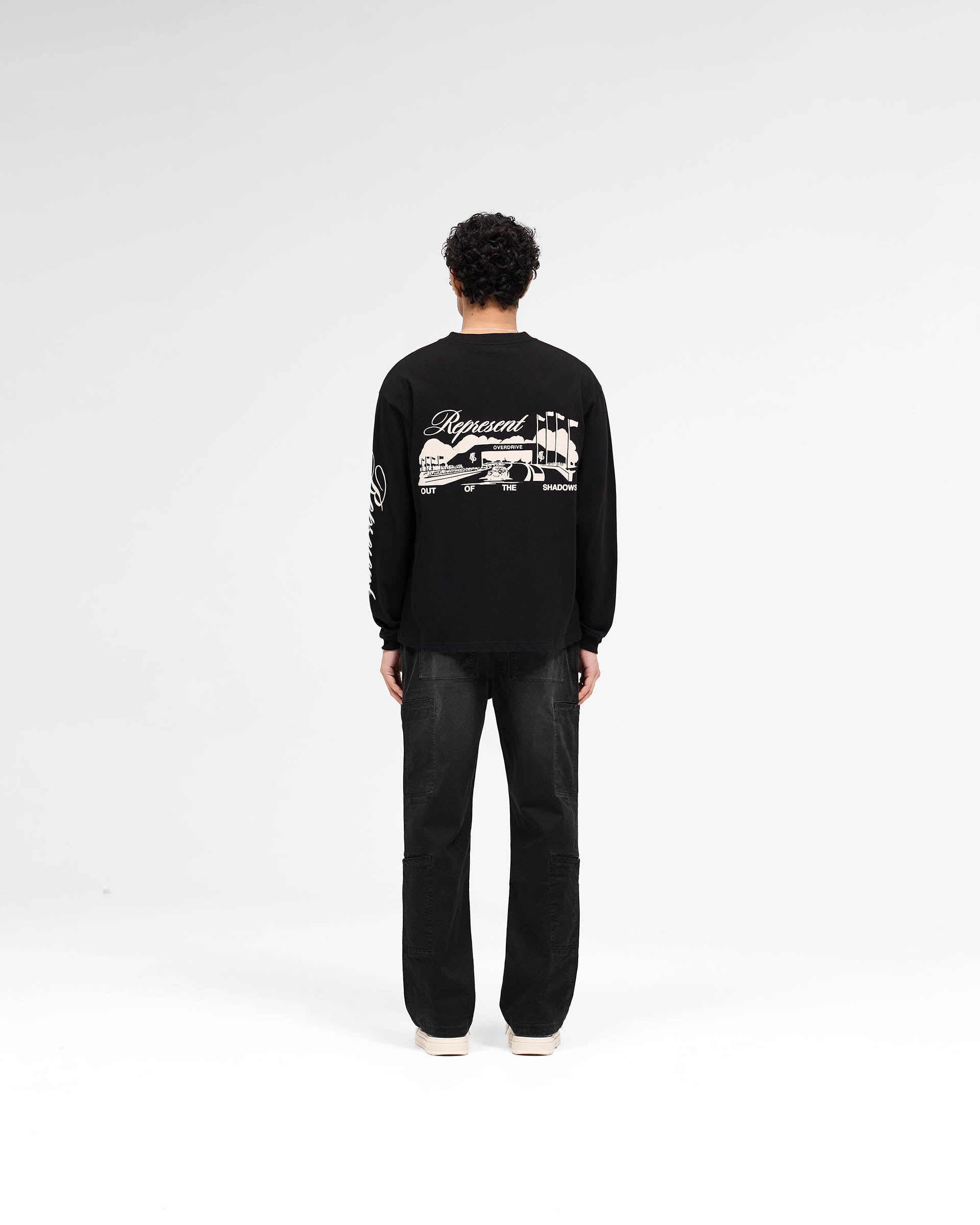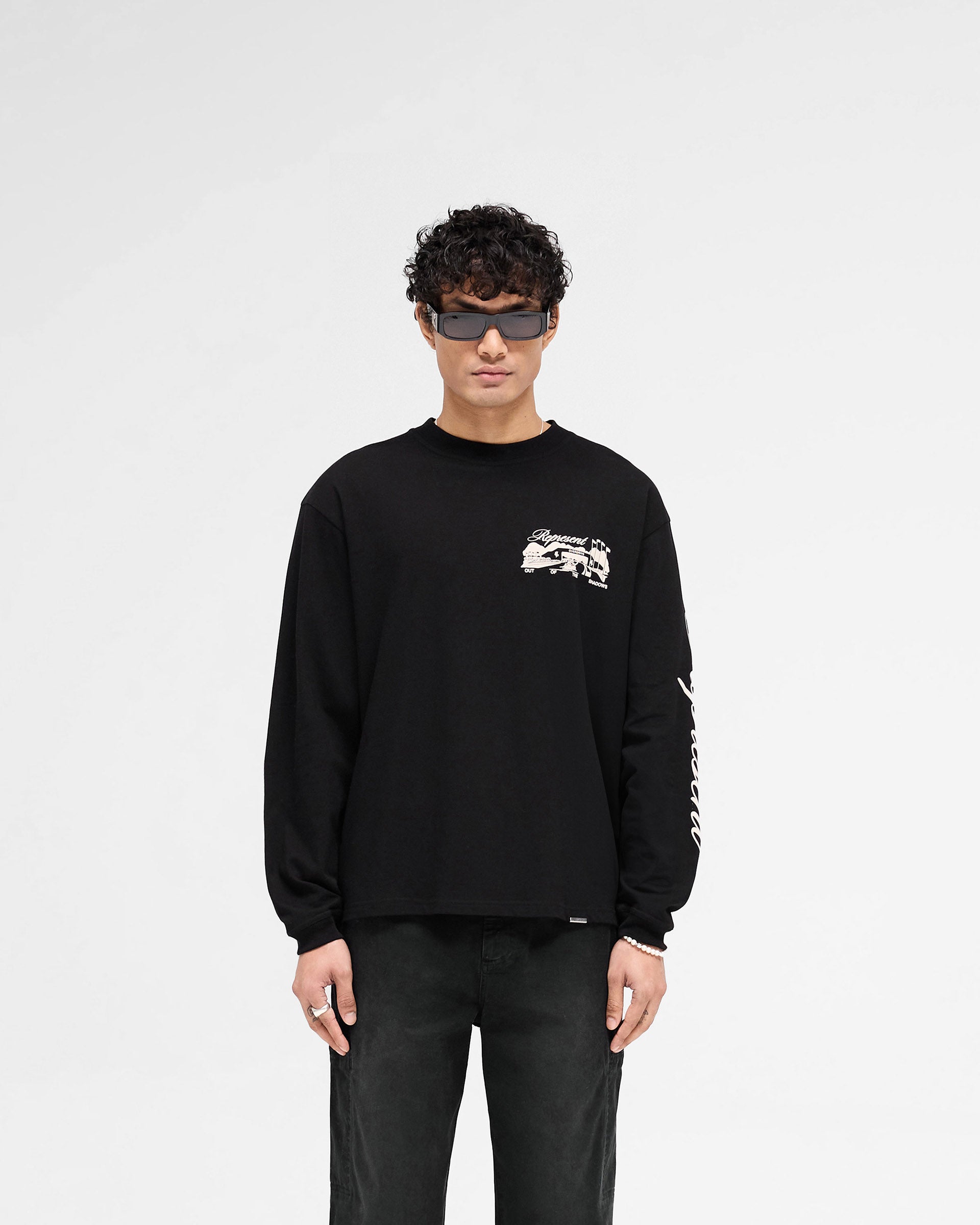 Introducing the Raceway Long Sleeve T-Shirt in Jet Black, a slightly oversized t-shirt, crafted from medium weight jersey cotton. The t-shirt showcases a puff print graphic to the front and back, with a further graphic print to the sleeves, finished with Represent branding to the back hem and our signature metal bar logo to the front hem.