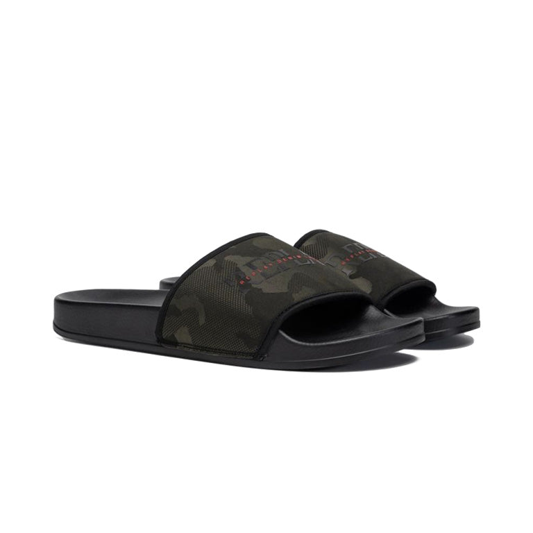 Up Hidden sliders featuring a camouflage upper and a lettering print with a distinctive broken effect. Flat sole.