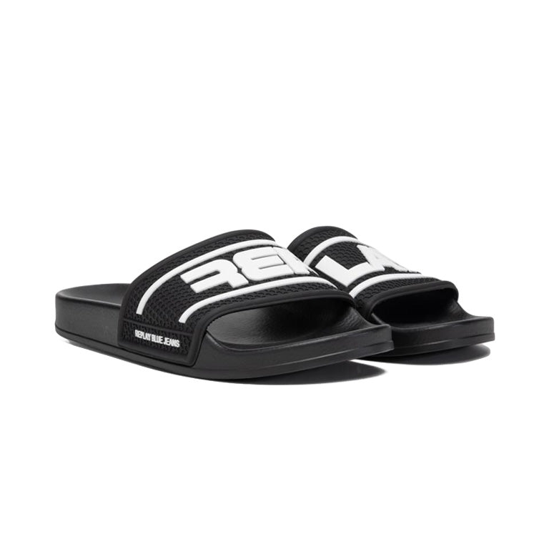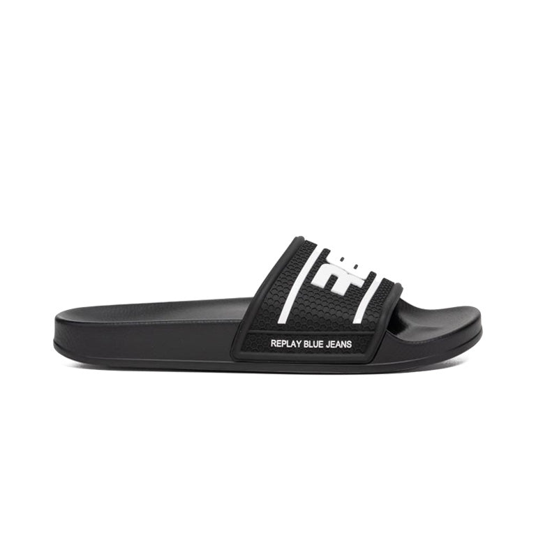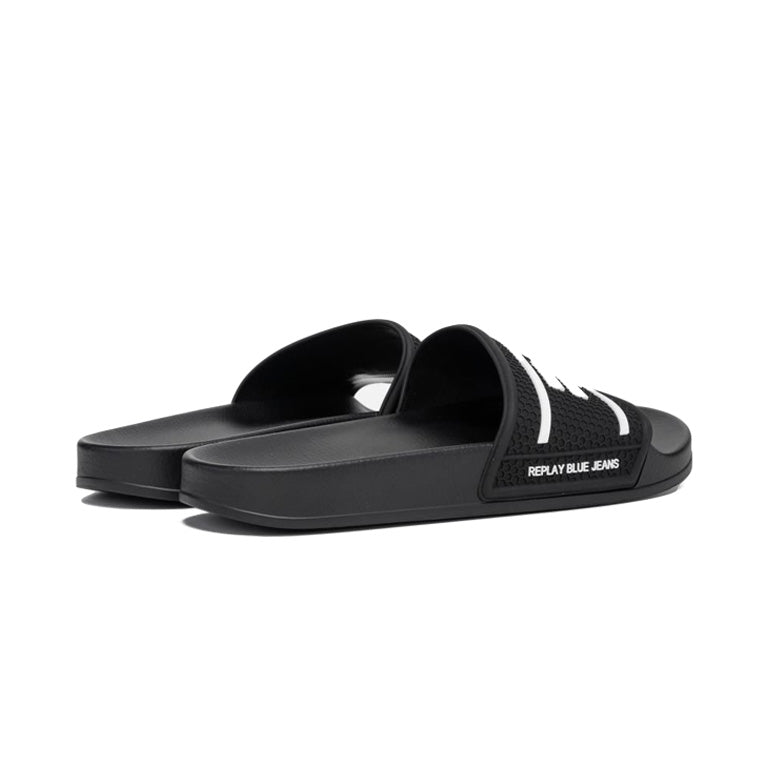 Up Quar P sliders featuring a solid-colour thermoplastic rubber upper with honeycomb design and embossed lettering logo. Flat sole.