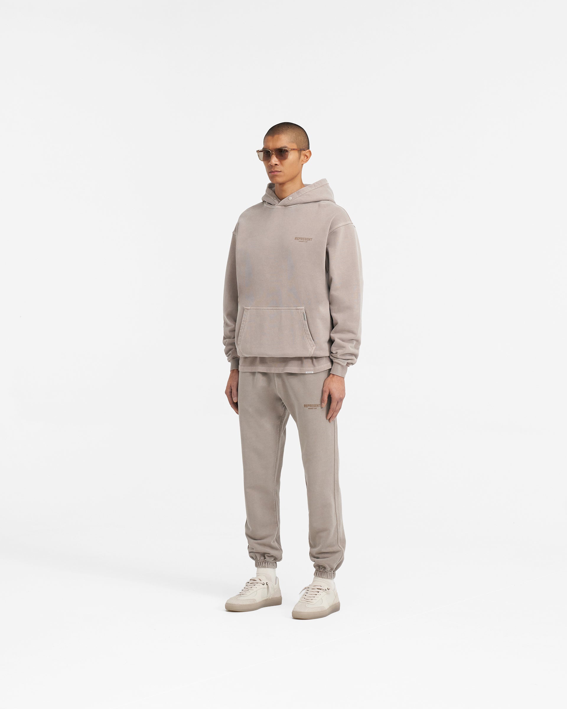 The wash on this hoodie is a pigment wash, an intensive process of taking pieces constructed with no colouring, and manually dying post-formation. The infusion of fabric and pigment ushers to propel the garments to a degree of unparalleled richness; a visual symphony of depth and texture, with dye accrued around areas such as seams, hem and hood, creating an illusion of natural fade on base elements of the clothing.