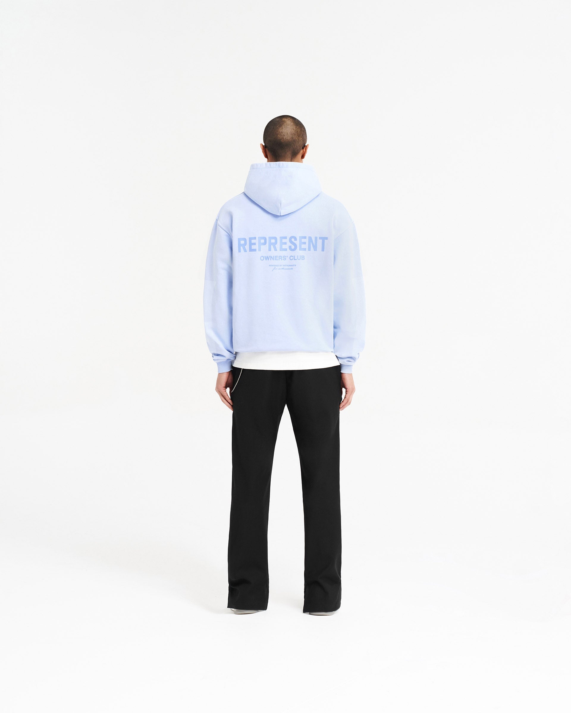 Vista Blue Hoodie with an oversized fit, crafted from a heavy weight jersey cotton. Super soft, pre-shrunk and piece dyed for the ultimate jersey. Ribbed hem & cuffs. Owners Club print to the chest & back. This vista blue hoodie is finished with our signature metal bar logo to the pocket.