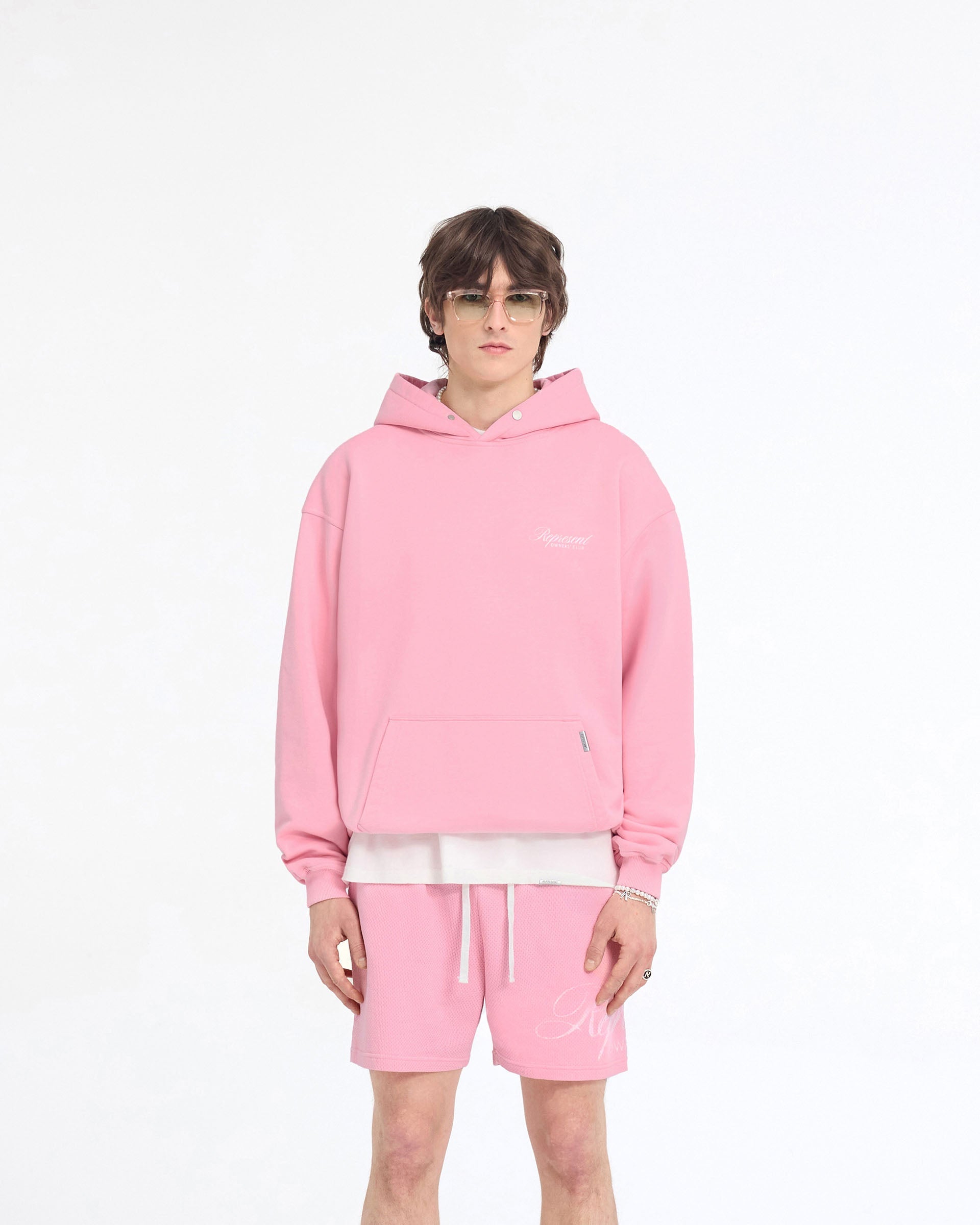 Introducing the latest evolution of the Represent Owners’ Club Hoodie in Pink, crafted from heavy weight jersey cotton with a slightly oversized fit. The hoodie features a ribbed hem and cuffs, with a Cobrax popper to the hood and Represent metal bar to the pocket.