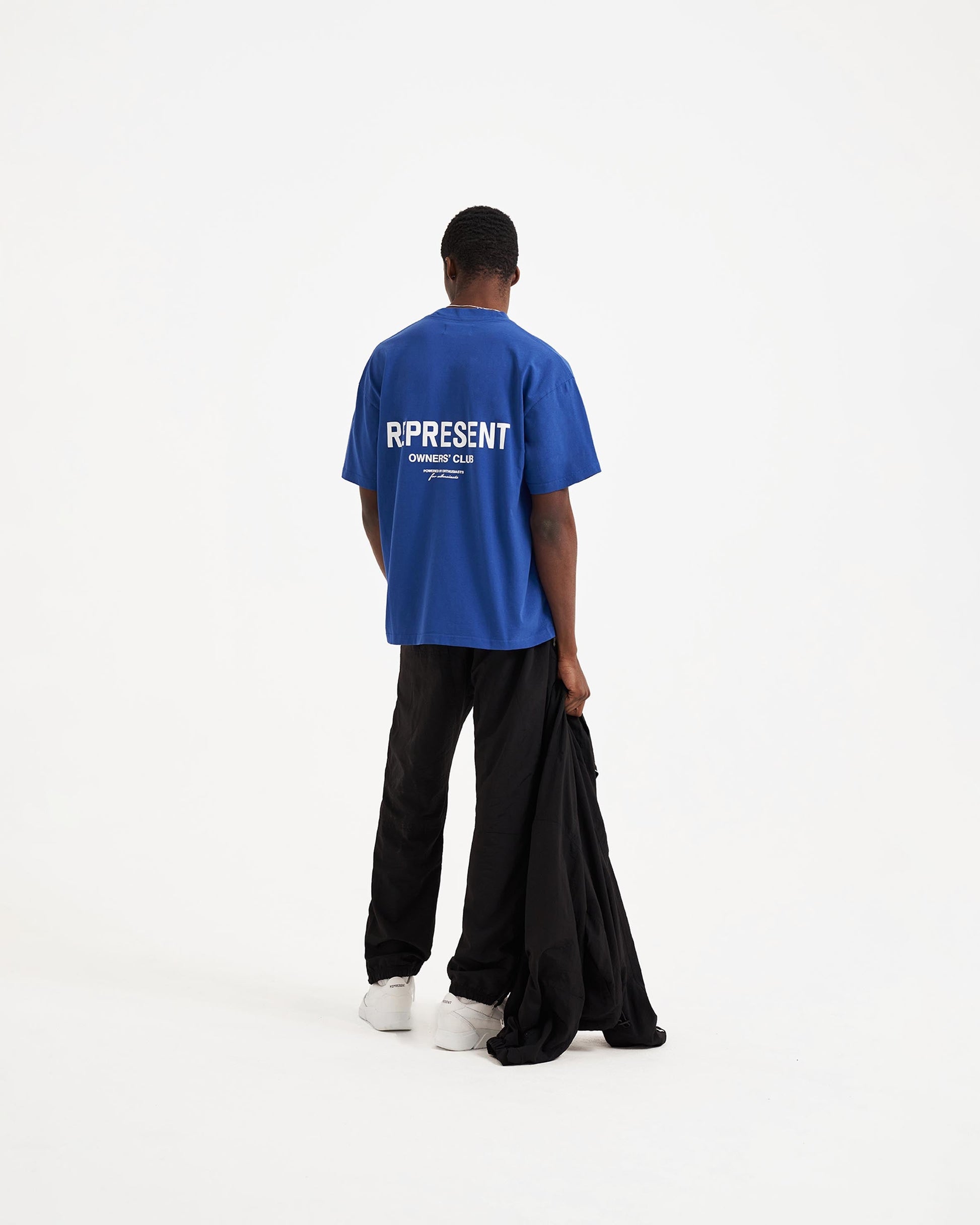 Short sleeve jersey cobalt blue t-shirt. Slightly oversized fit in a medium weight cotton. Ribbed crewneck collar. Represent Owners Club graphic branding to the rear and chest. This blue t-shirt is finished with our metal bar logo to the hem.