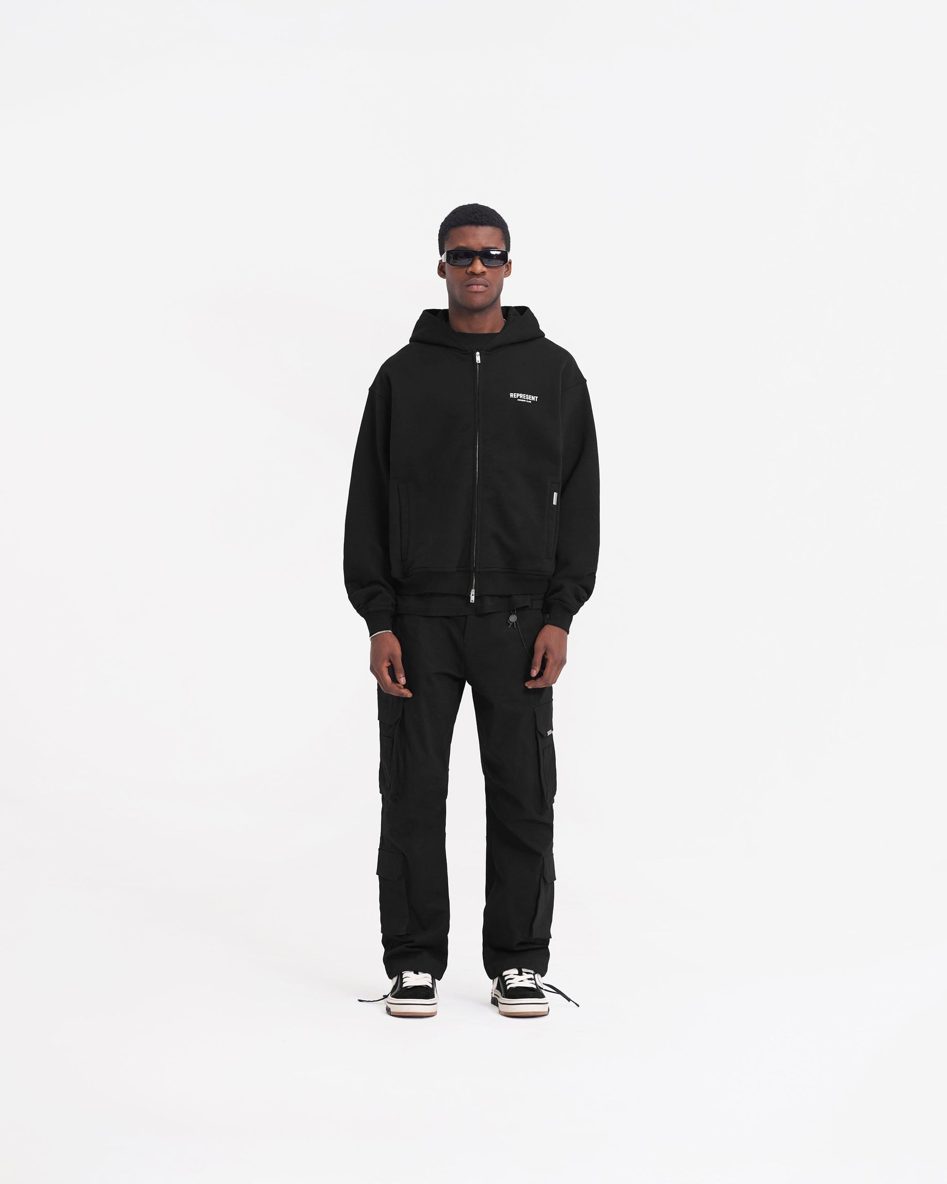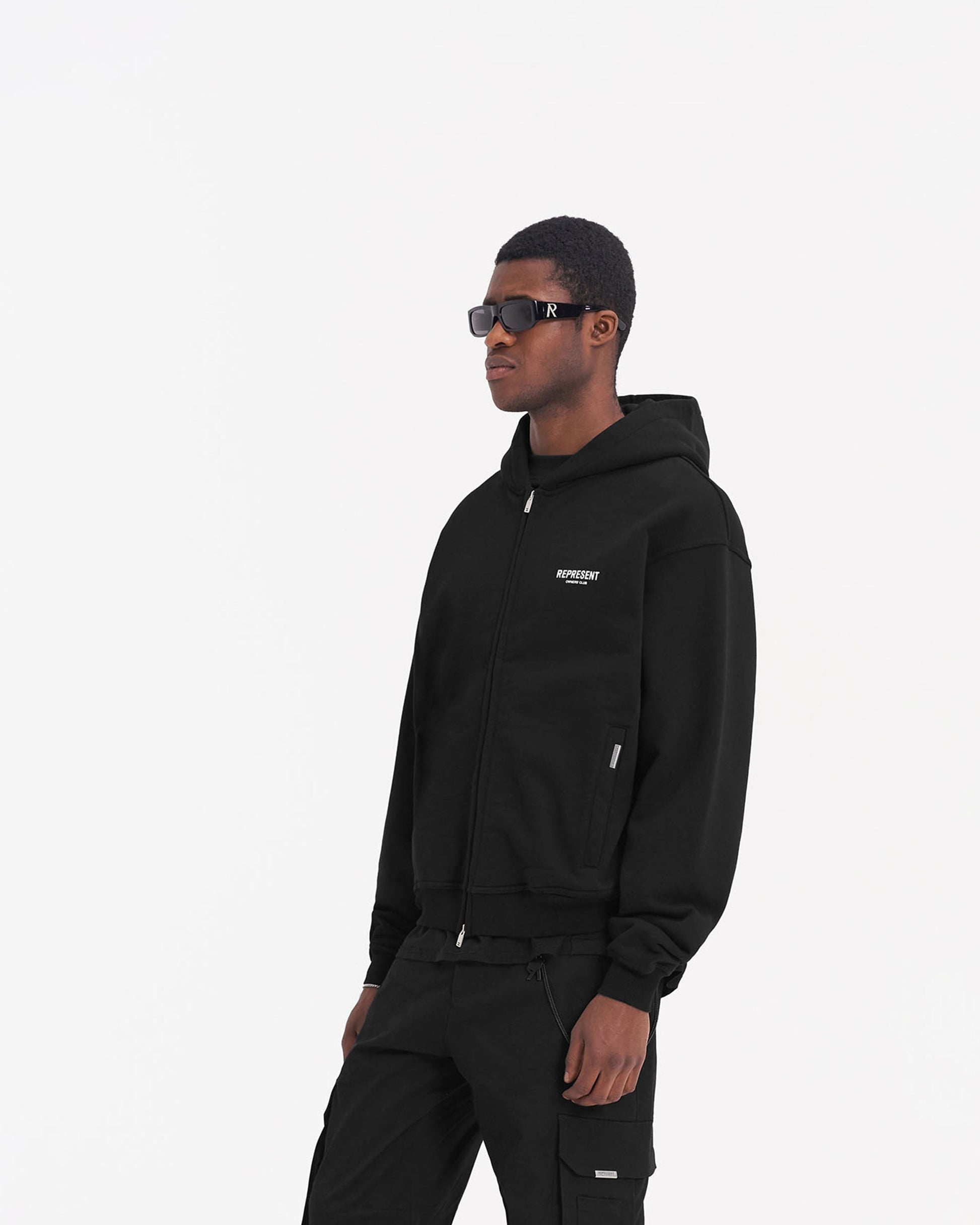 Introducing the Owners Club Zip Hoodie in Black, a slightly oversized zip hoodie crafted from heavy weight jersey cotton. This black zip hoodie is super soft and pre-shrunk, with ribbed hems and cuffs. It is finished with Represent Owners’ Club branding to the chest and back, and Represent metal bar to the pocket.